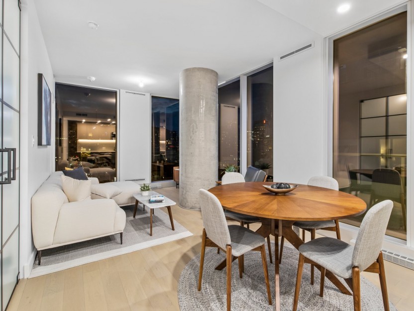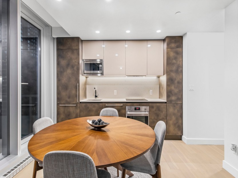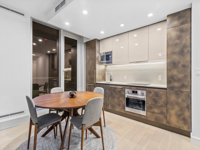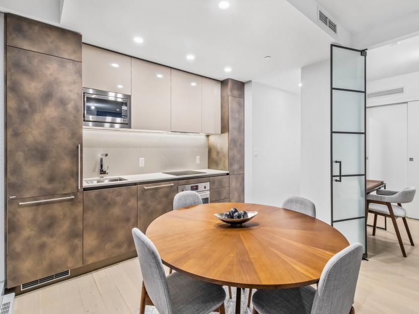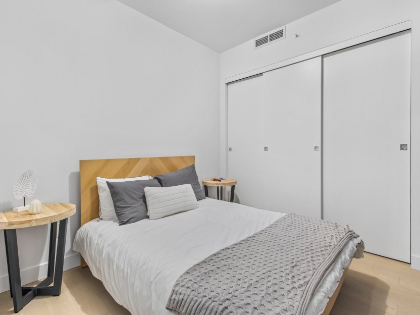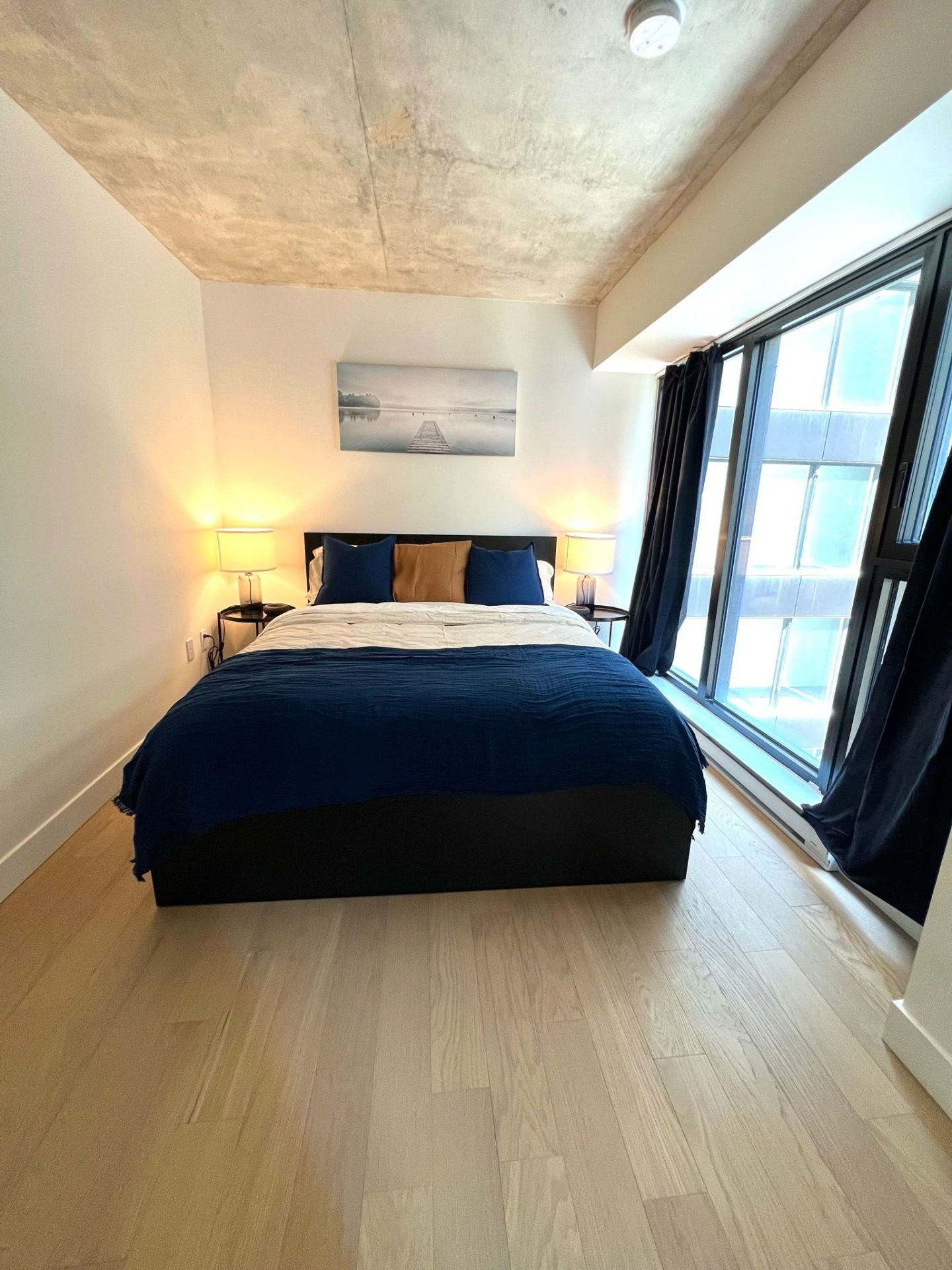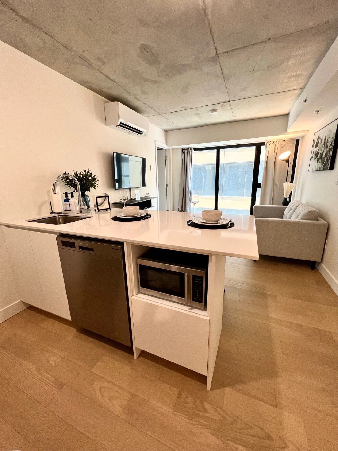 Unité de coin partiellement meublé moderne au YUL avec 2 chambres, 1 salle de bain et espace lumineux à aire ouverte. Fenêtres pleine hauteu...