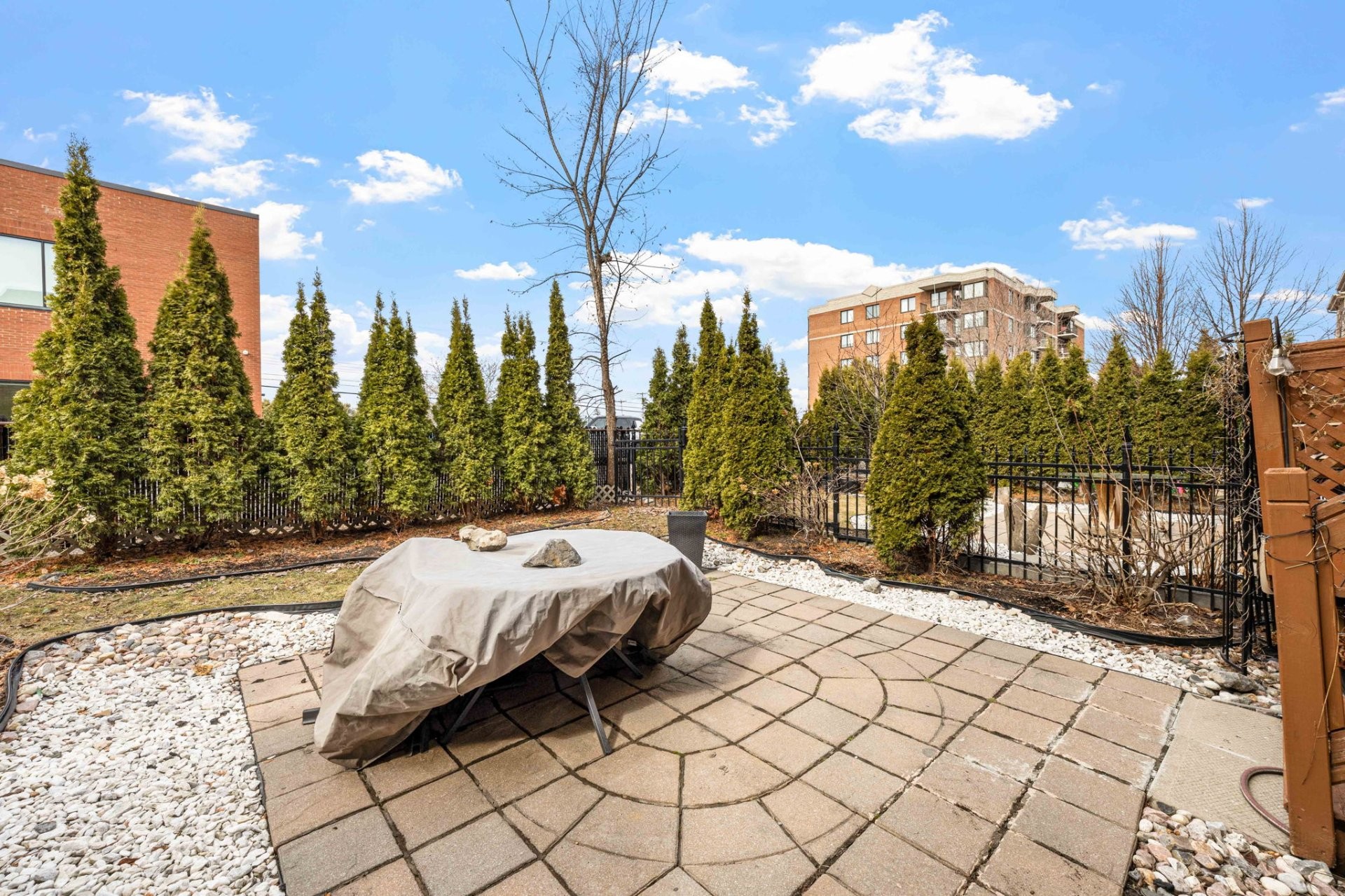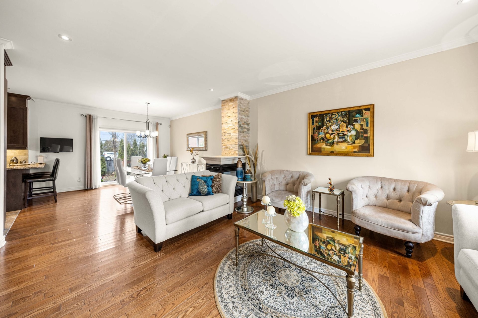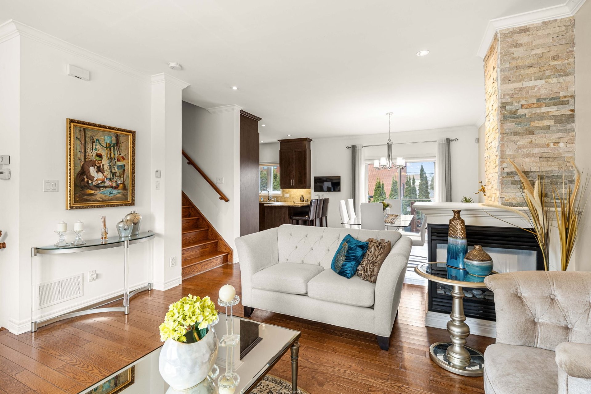 Over 2000 SF of elegant, well-maintained 2010 Grilli townhouse with upscale finishes. Open-concept living/dining, wood floors, fireplace. Gourmet kitchen with granite and built-ins, opening to fenced yard. 3 bedrooms on upper level, luxury bath. Bright mezzanine with full bath (office/family room or 4th bedroom). Finished basement (playroom or 5th bedroom with closet/window), laundry, storage, garage. Condo fees include snow, landscaping, maintenance. Prime: 2 stops to St-Jean, 5 min to Hwy 40 E/W.