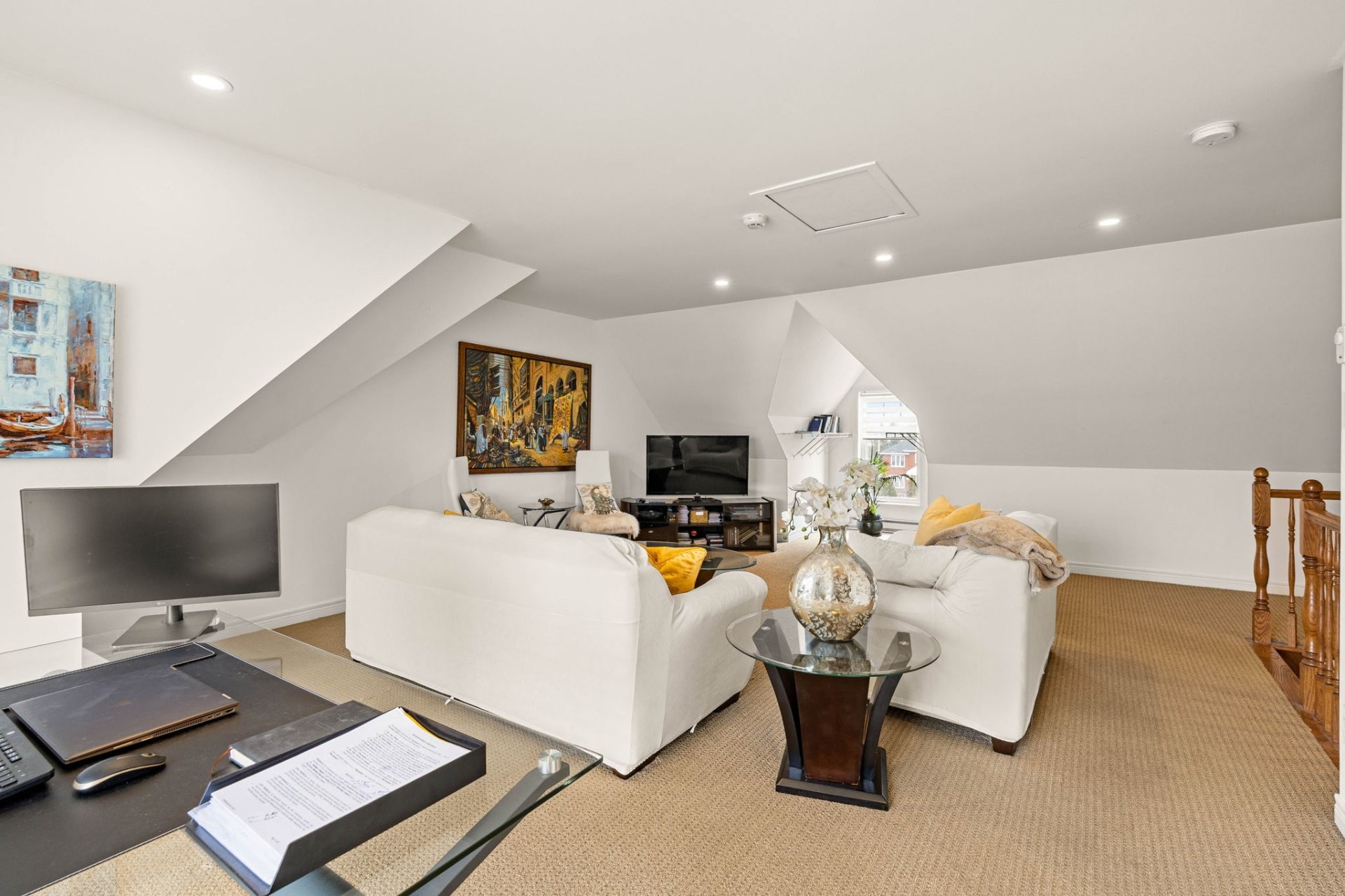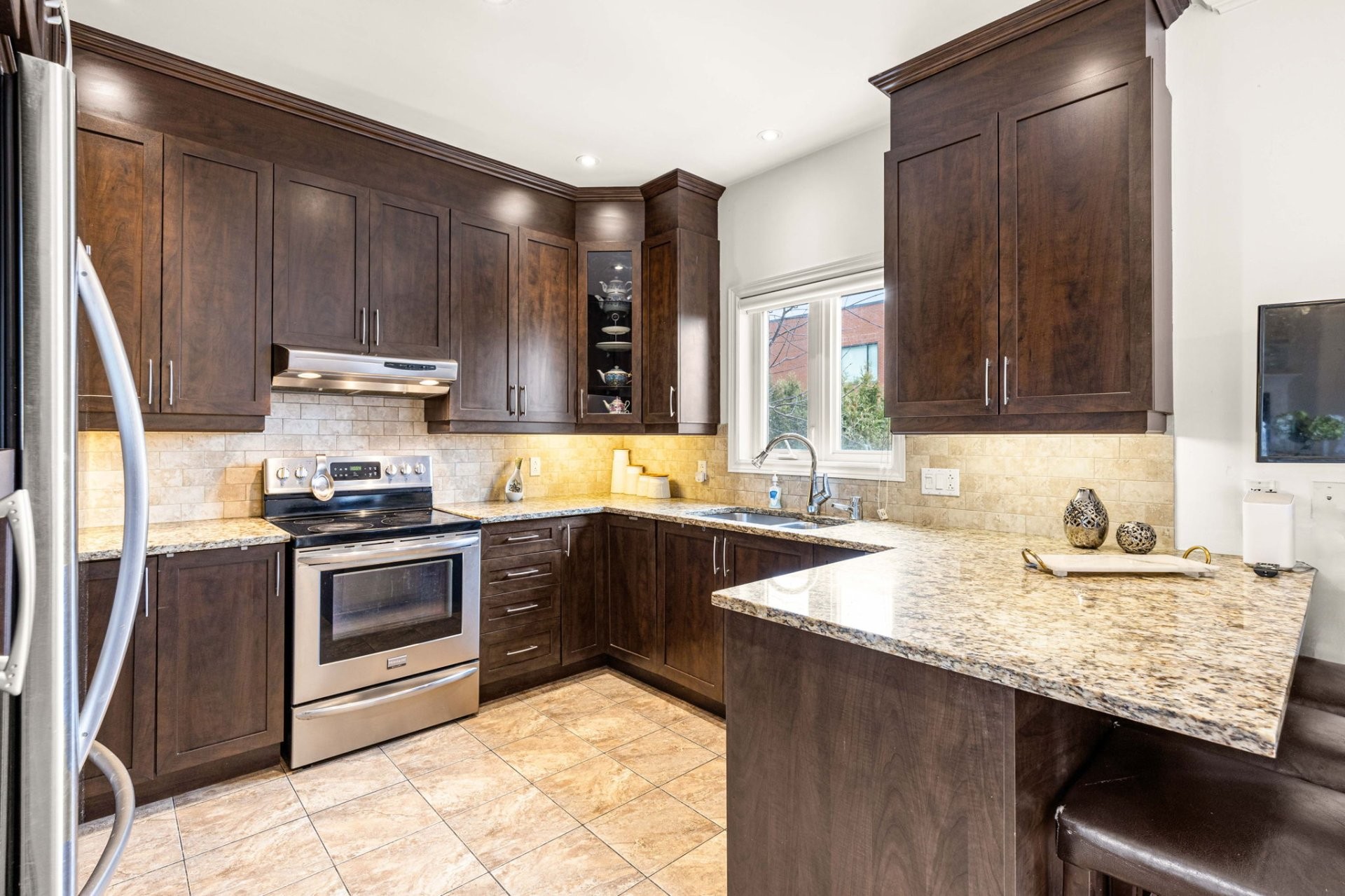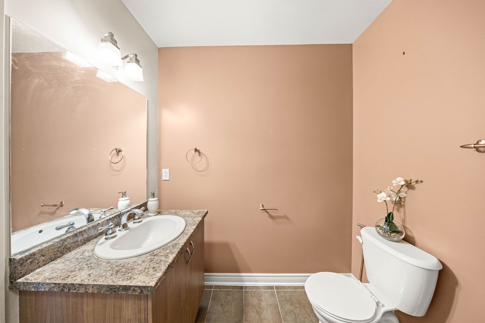 Over 2000 SF of elegant, well-maintained 2010 Grilli townhouse with upscale finishes. Open-concept living/dining, wood floors, fireplace. Gourmet kitchen with granite and built-ins, opening to fenced yard. 3 bedrooms on upper level, luxury bath. Bright mezzanine with full bath (office/family room or 4th bedroom). Finished basement (playroom or 5th bedroom with closet/window), laundry, storage, garage. Condo fees include snow, landscaping, maintenance. Prime: 2 stops to St-Jean, 5 min to Hwy 40 E/W.