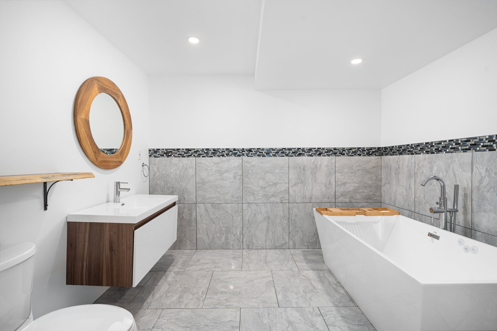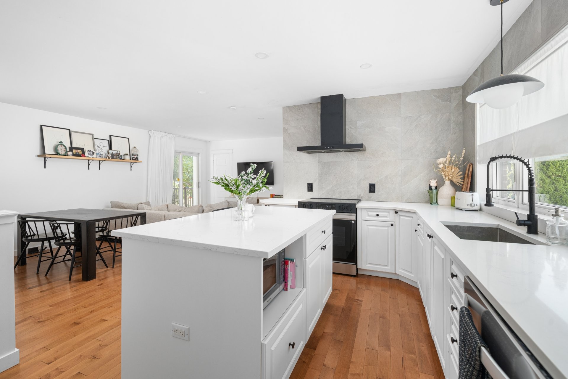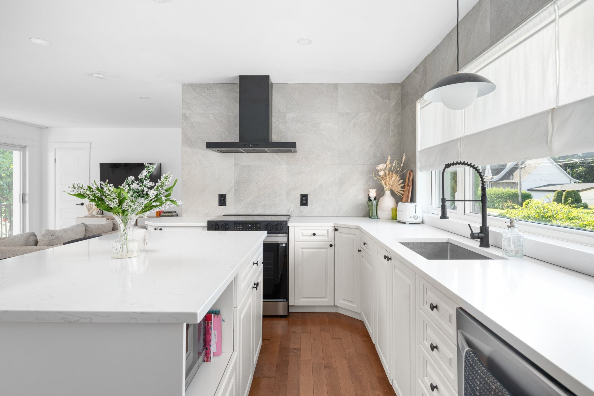 - Kitchen renovations including the addition of an island, installation of a backsplash, removal of certain cabinets, replacement of the range hood and faucet, as well as the construction of a decorative wall to encase the refrigerator.