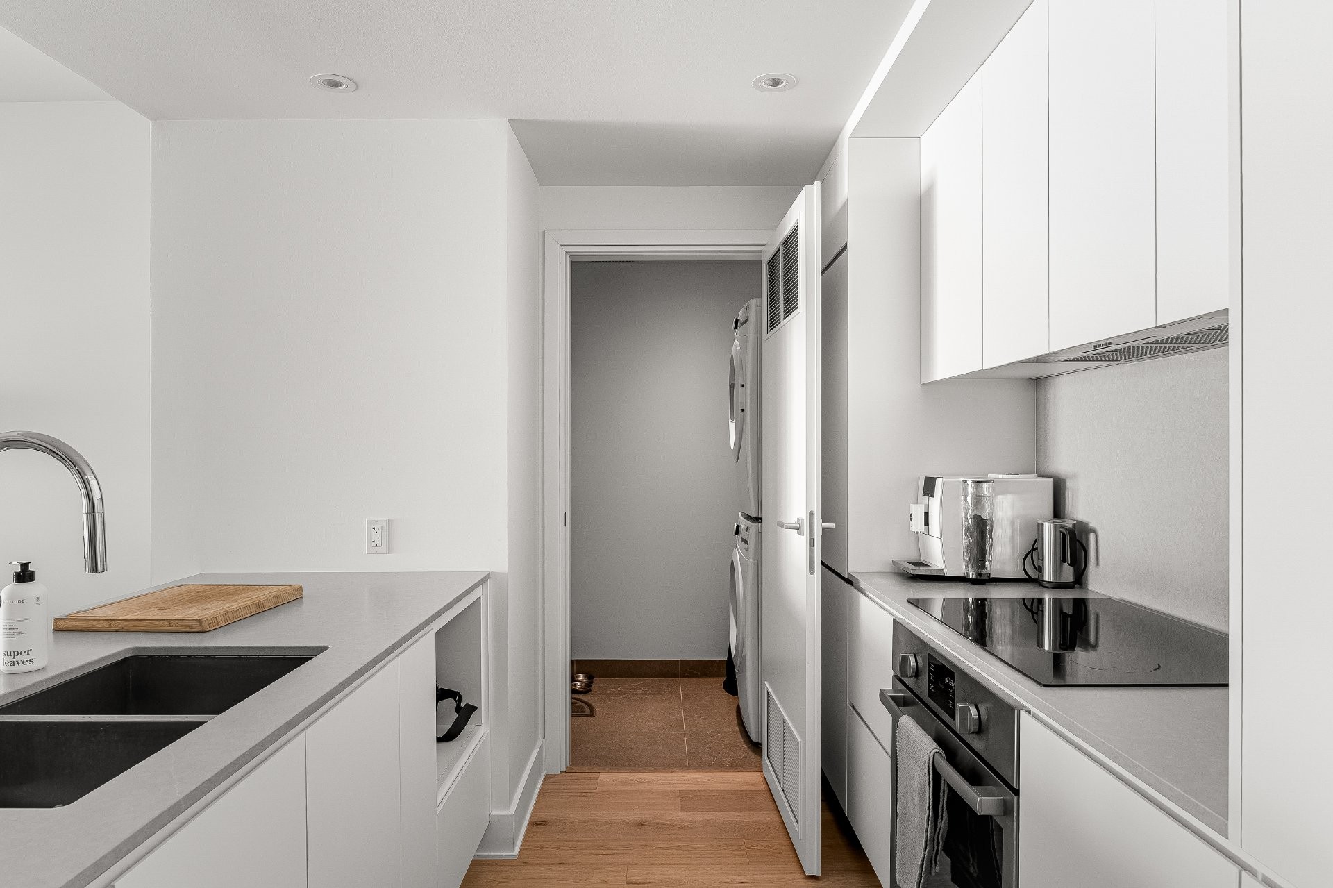 - Modern kitchen with: under-mount double sink, built-in cooktop and oven, Bosch dishwasher, Liebherr refrigerator, access to a laundry room