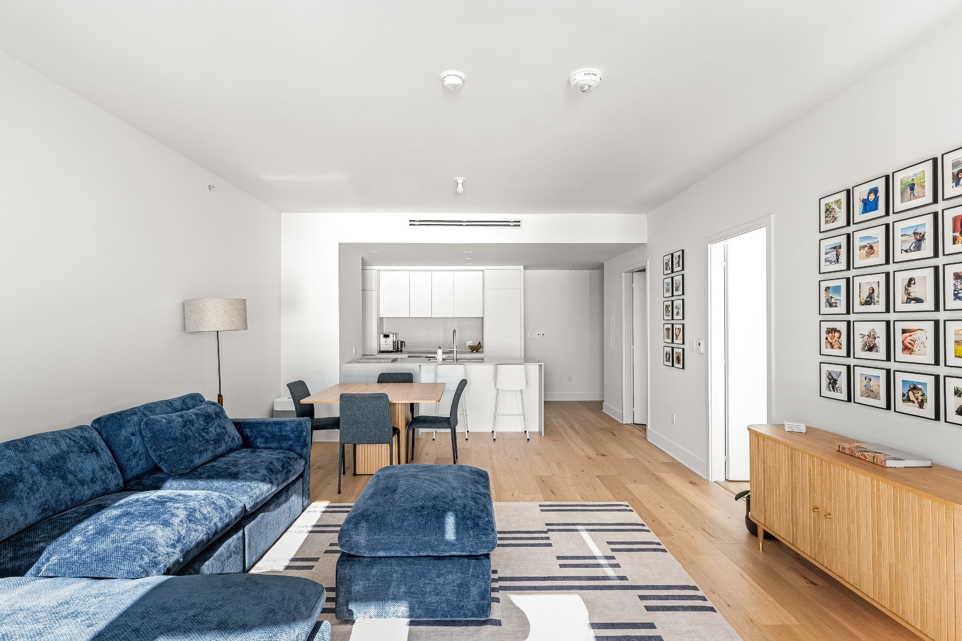 - Open-concept layout connecting the living room, dining area, and kitchen -- filled with natural light