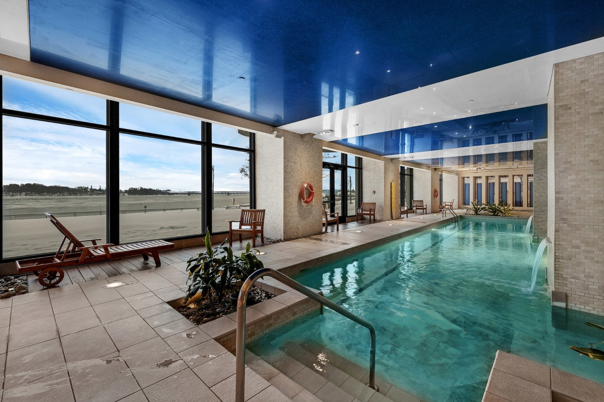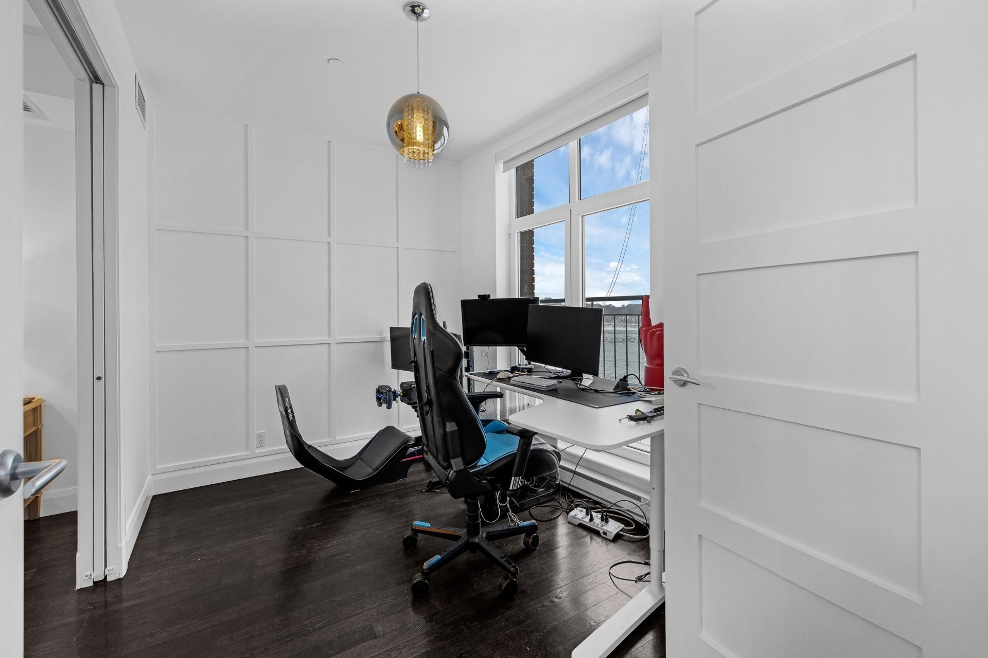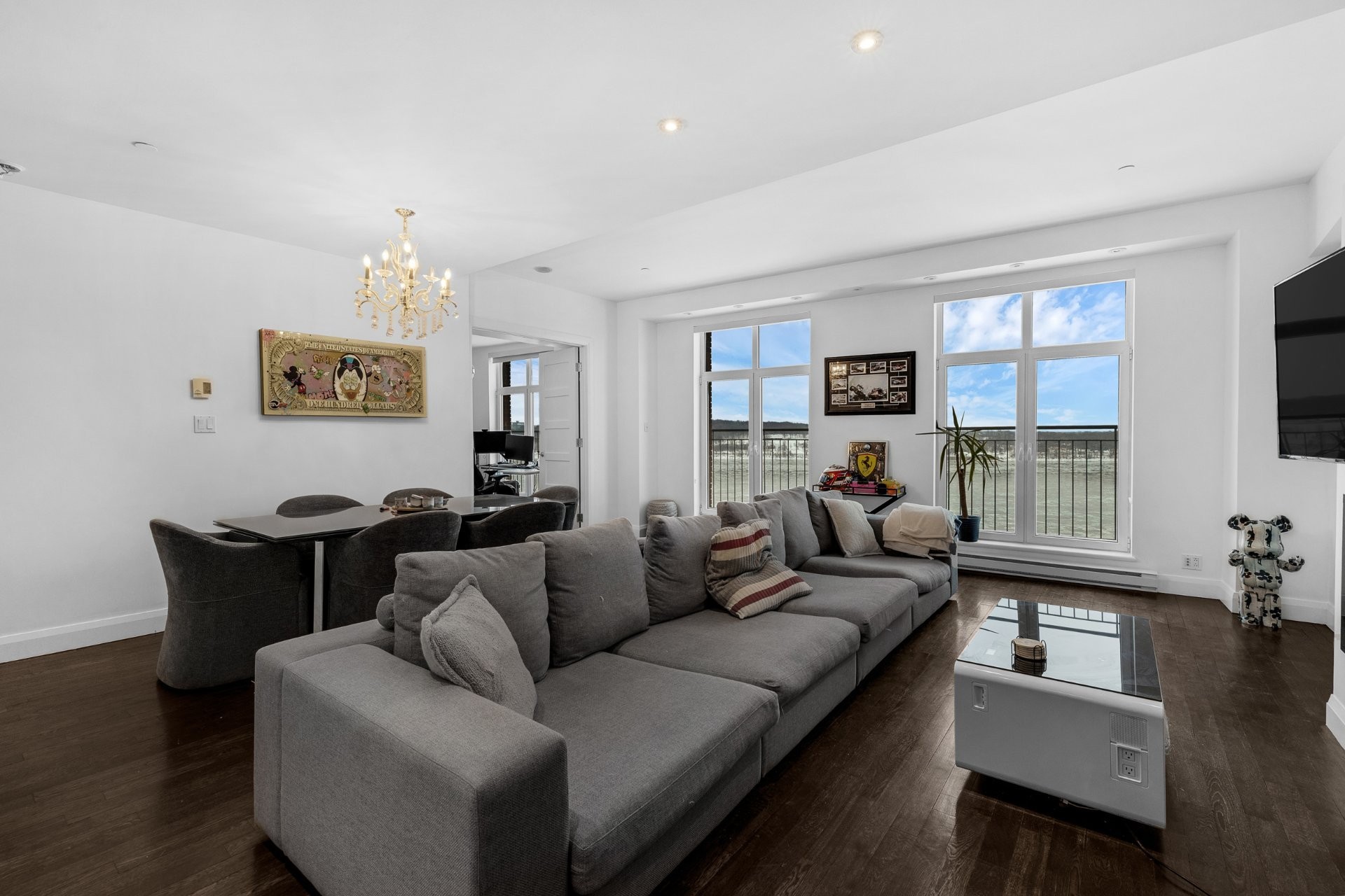 The unit has been fully renovated with high-end finishes throughout and offers spectacular views of the St. Lawrence River. It features two closed bedrooms, including a primary bedroom with walk-in closet and ensuite bathroom, as well as a dedicated office space overlooking the waterfront.