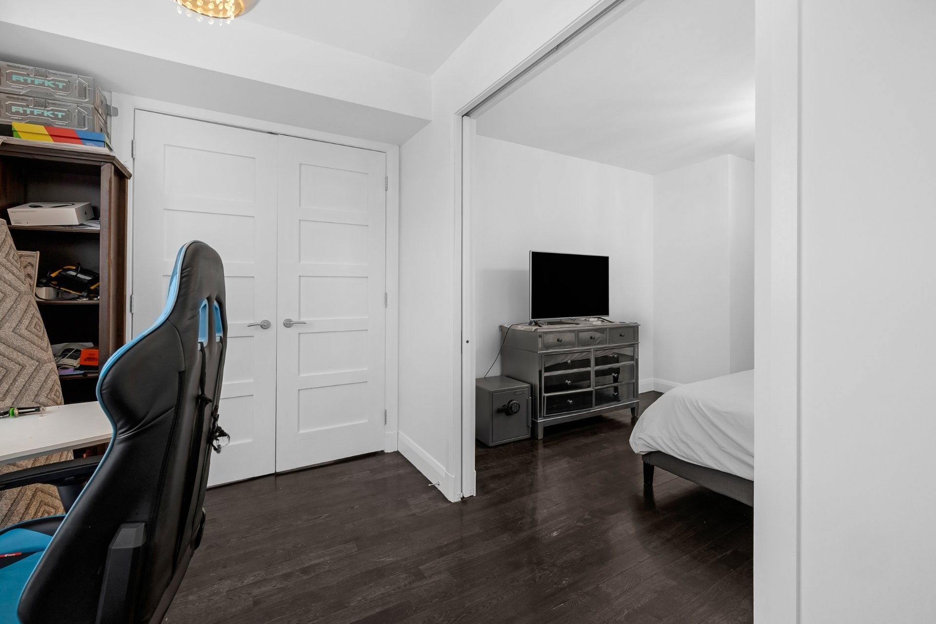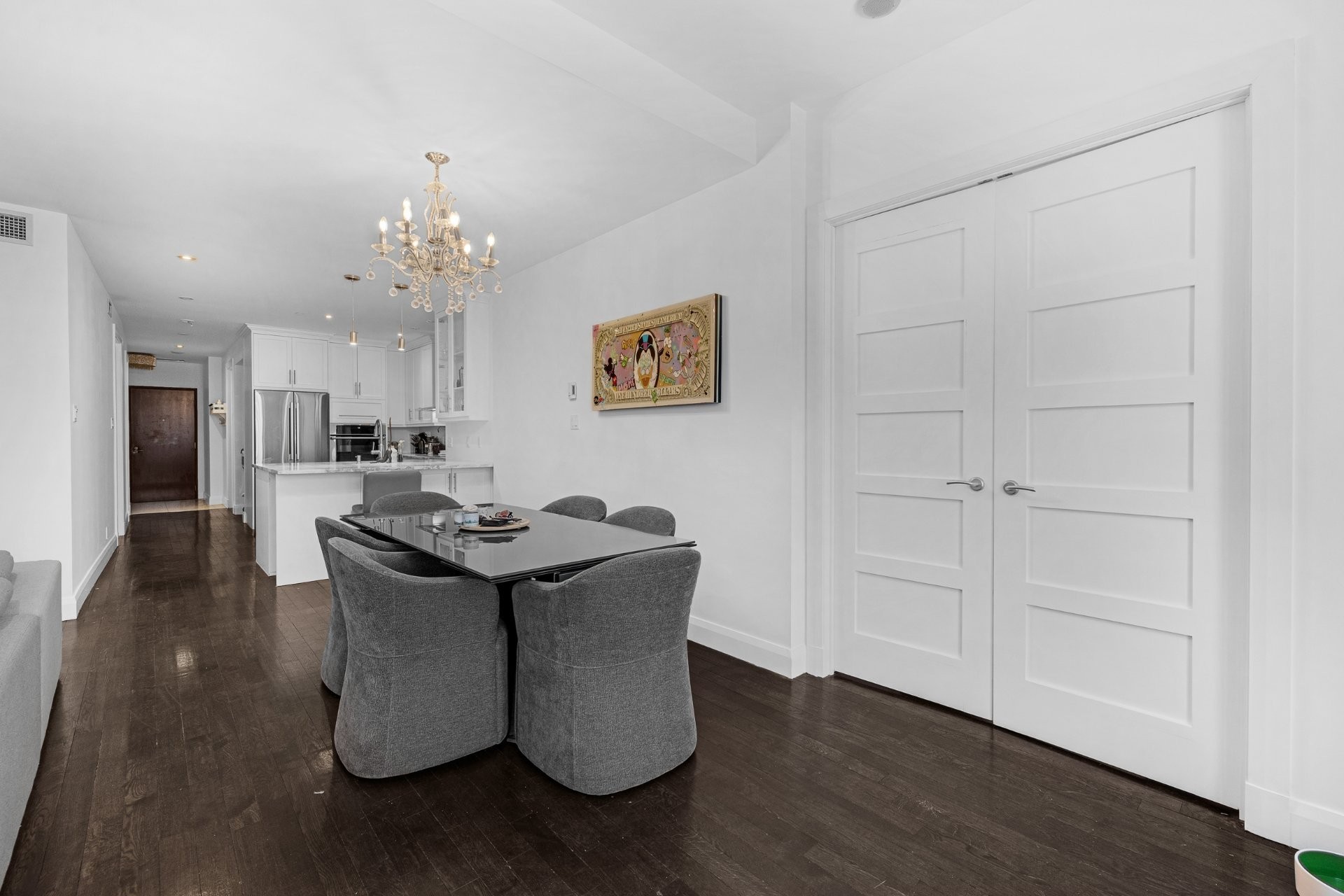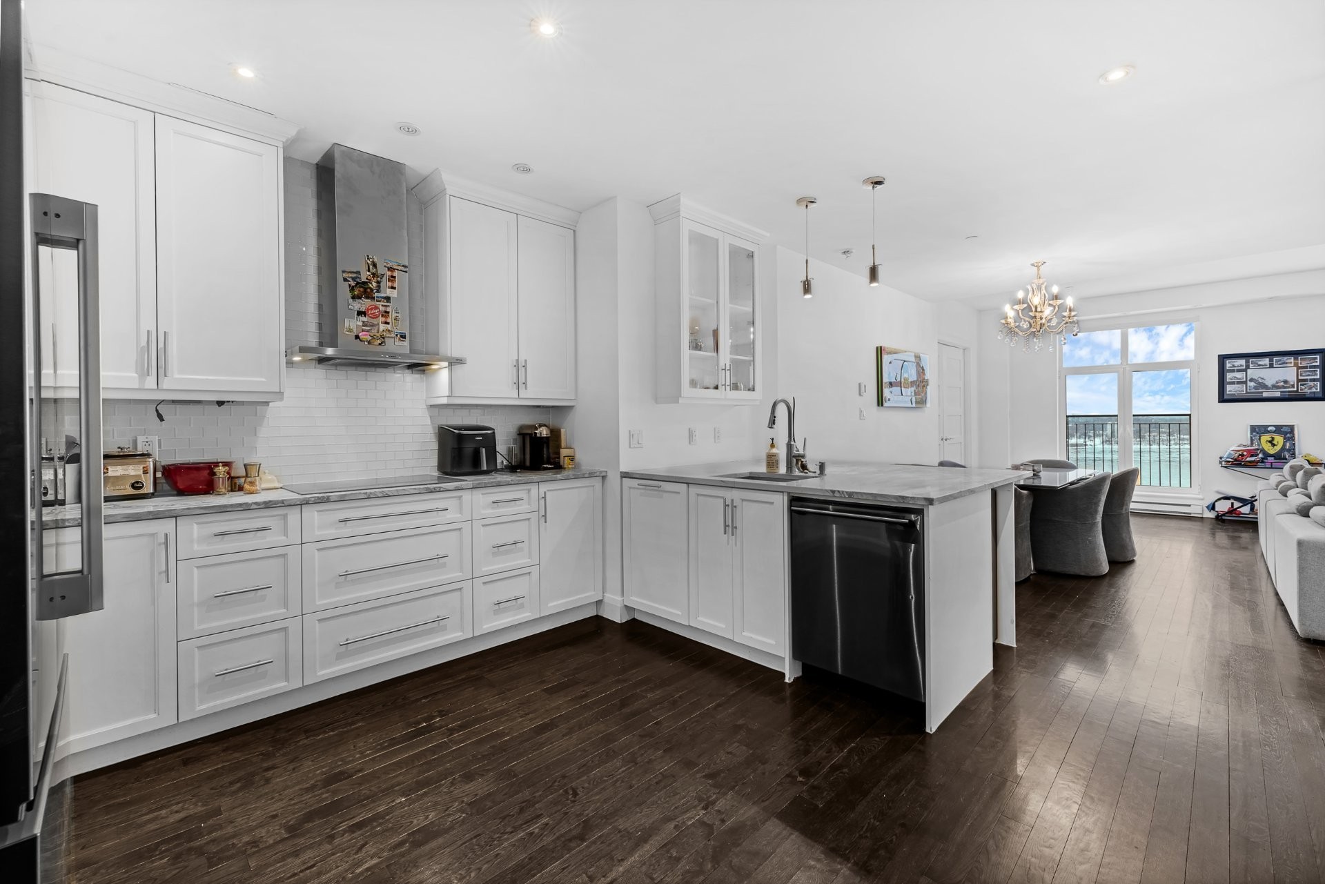 The unit has been fully renovated with high-end finishes throughout and offers spectacular views of the St. Lawrence River. It features two closed bedrooms, including a primary bedroom with walk-in closet and ensuite bathroom, as well as a dedicated office space overlooking the waterfront.