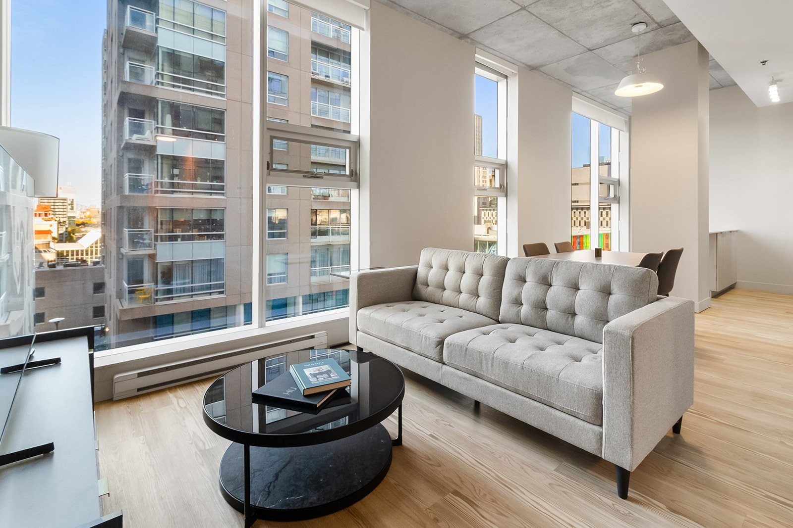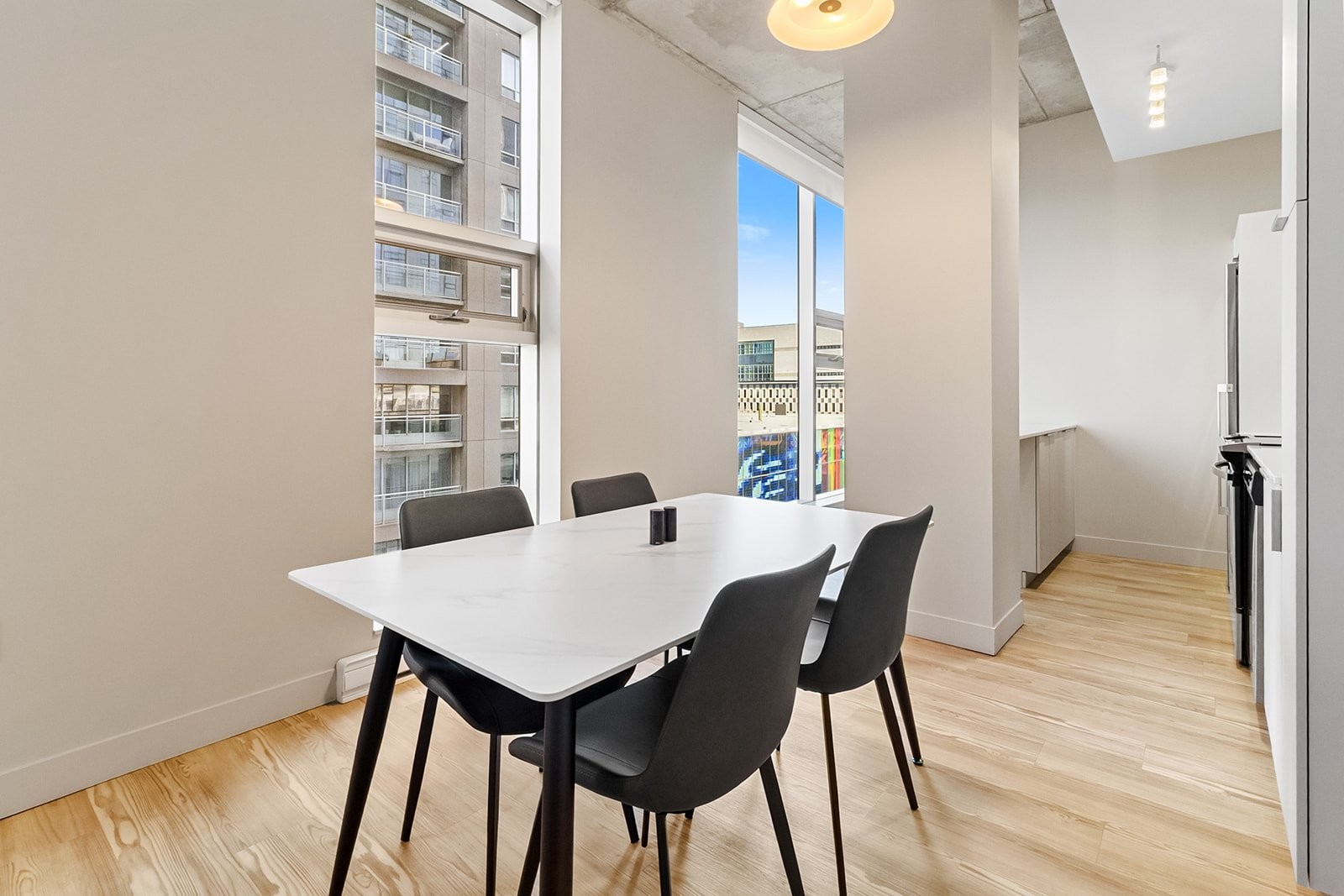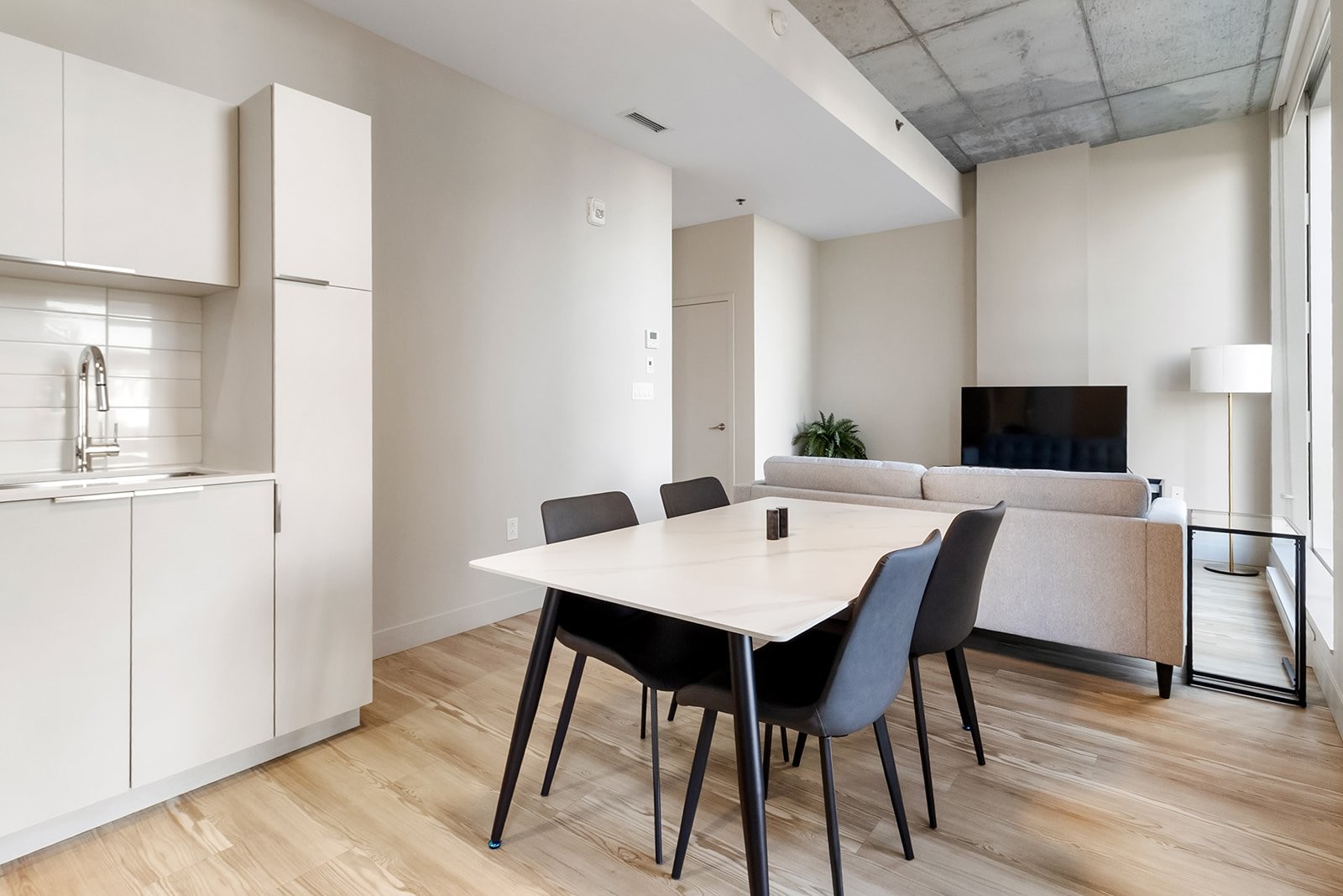Unité de coin partiellement meublé moderne au YUL avec 2 chambres, 1 salle de bain et espace lumineux à aire ouverte. Fenêtres pleine hauteu...