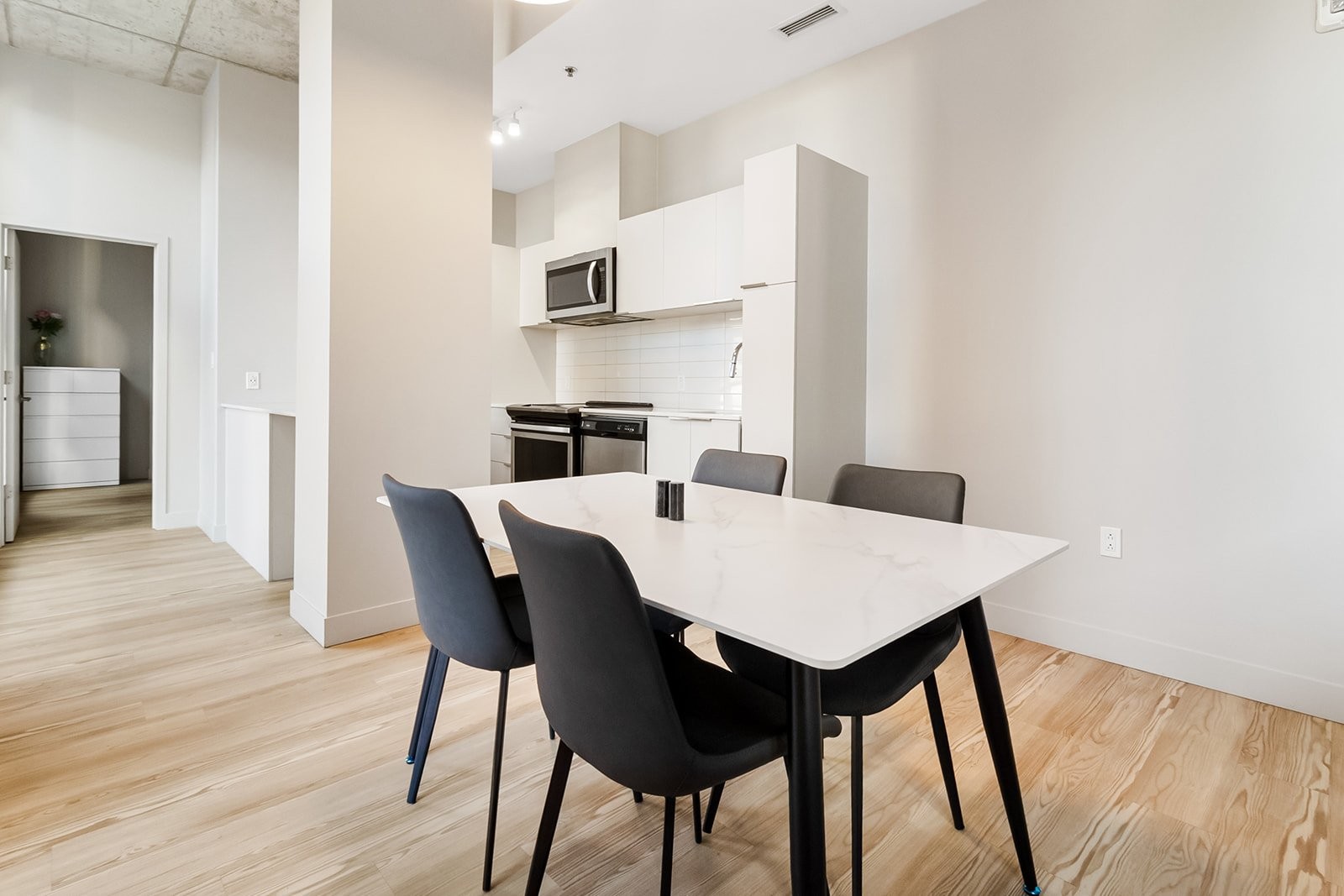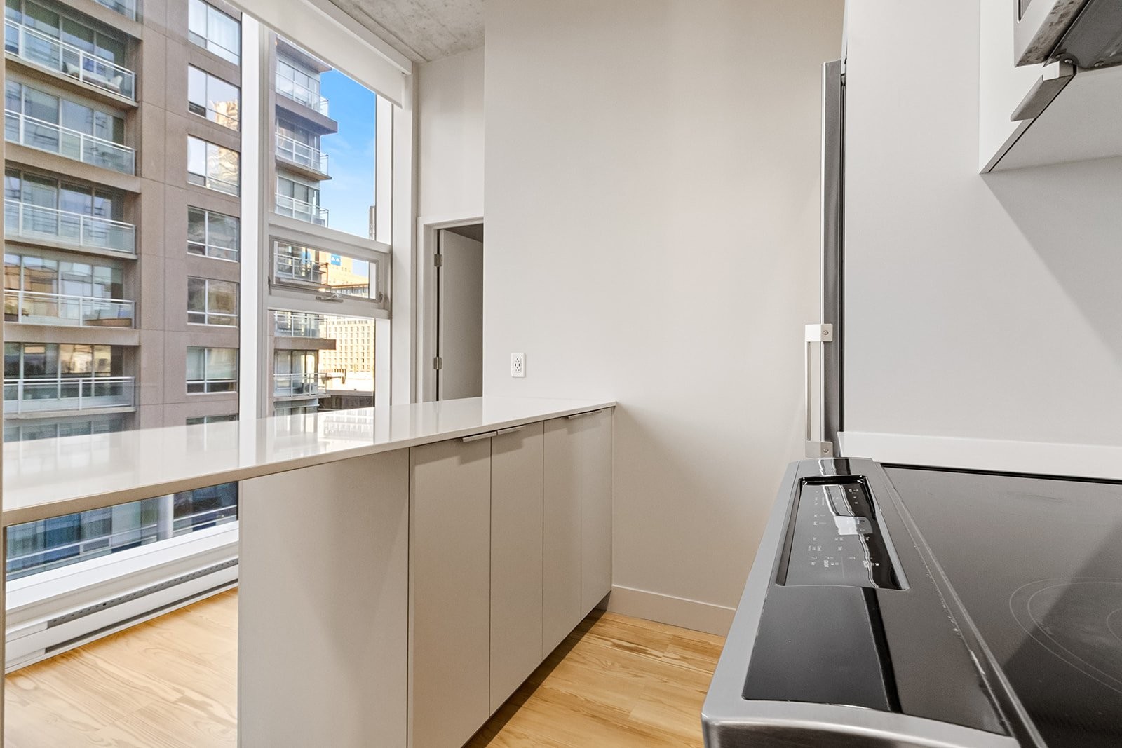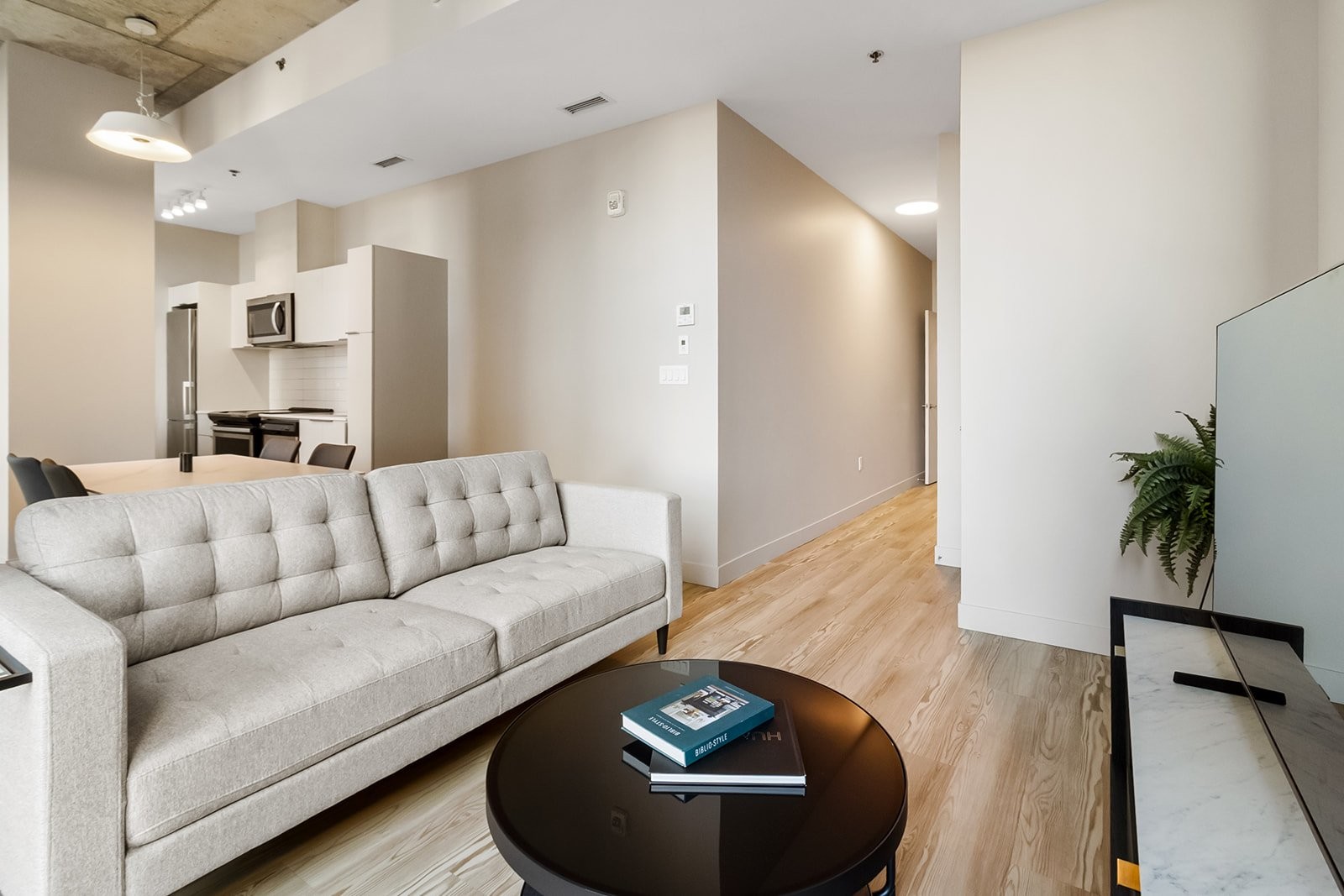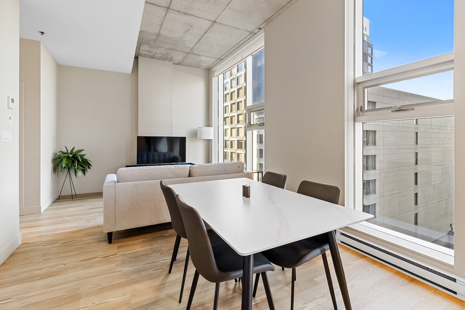 Unité de coin partiellement meublé moderne au YUL avec 2 chambres, 1 salle de bain et espace lumineux à aire ouverte. Fenêtres pleine hauteu...