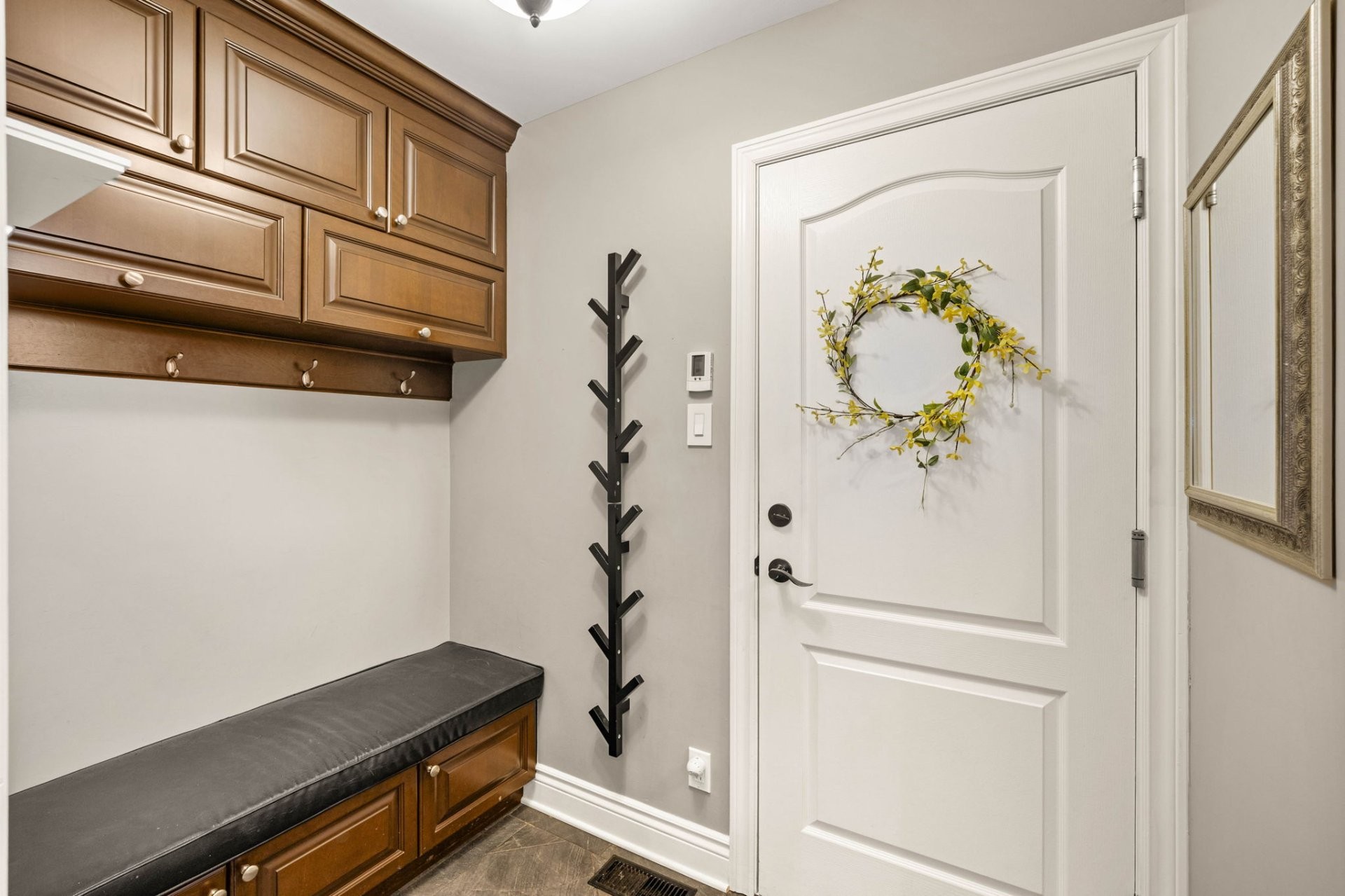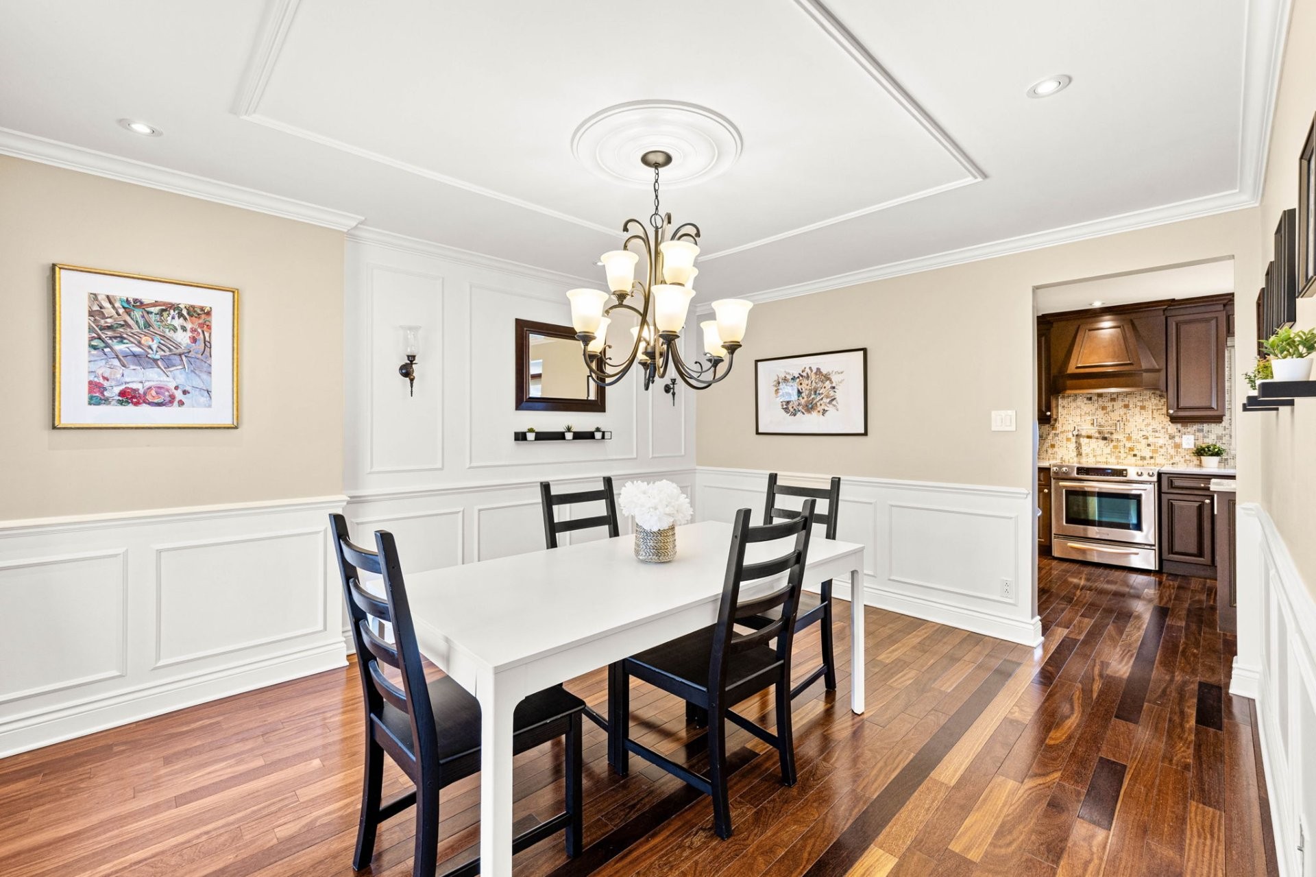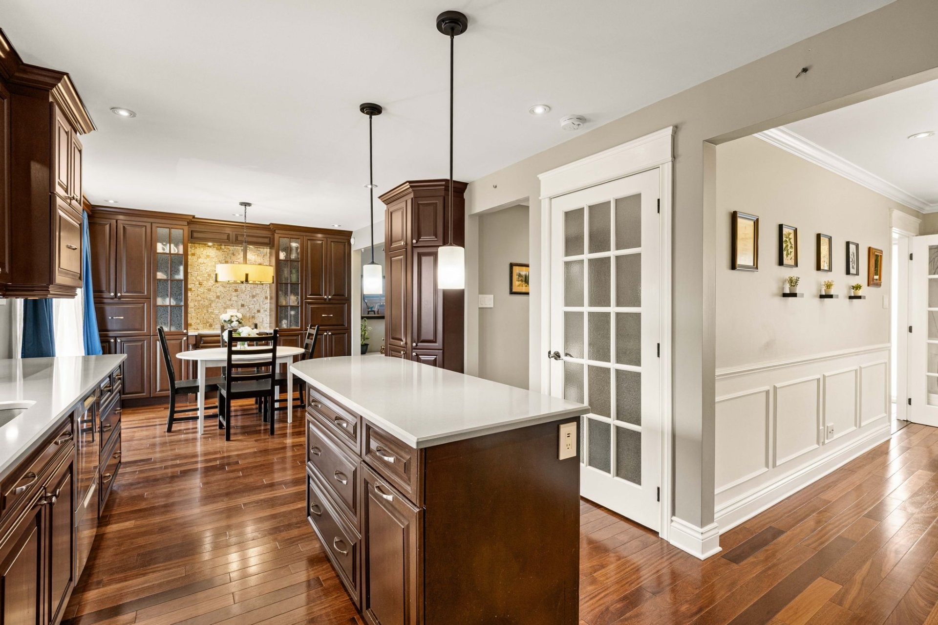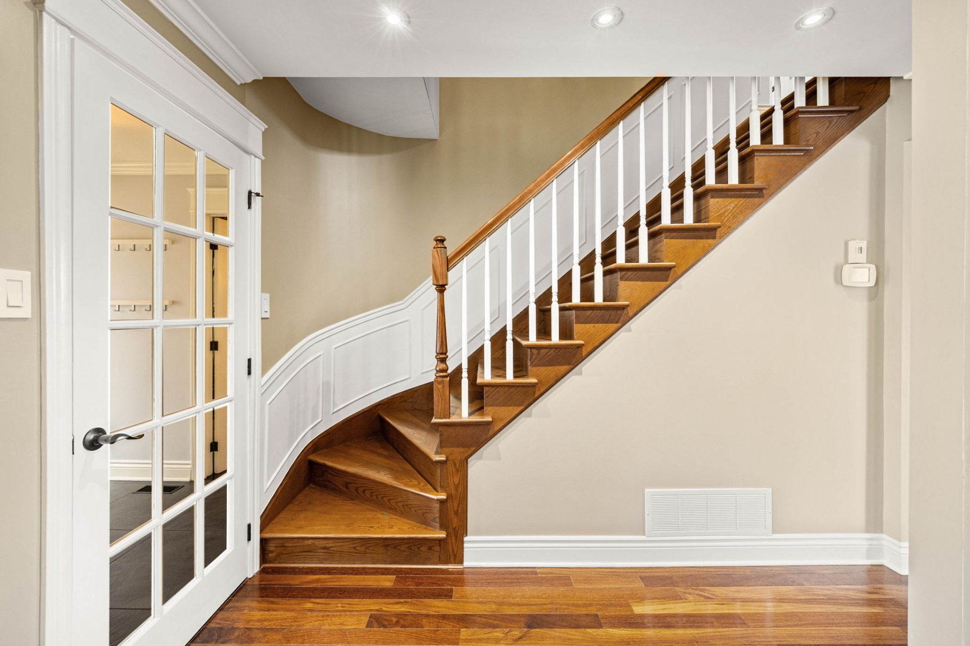 Step into a welcoming, well-sized foyer with elegant French doors. The main floor features a spacious living room, a separate formal dining room, and an inviting eat-in kitchen, all enhanced by rich Brazilian hardwood flooring throughout. The kitchen is designed for both everyday living and entertaining, with custom maple cabinetry and a central island. A convenient powder room and a mudroom with heated floors add to the home's functionality. The heated double garage is finished with durable epoxy flooring and offers attic storage above.