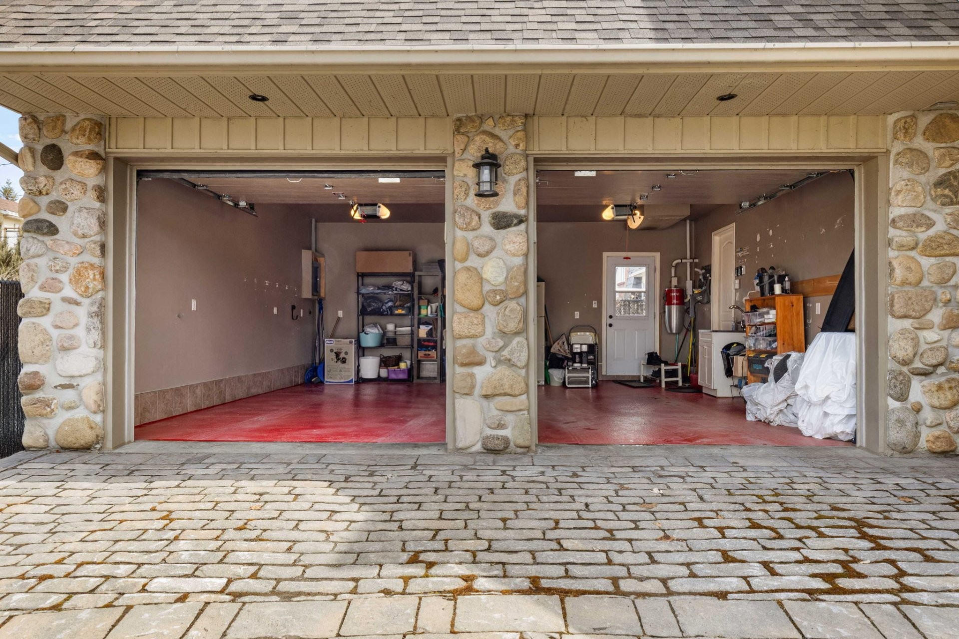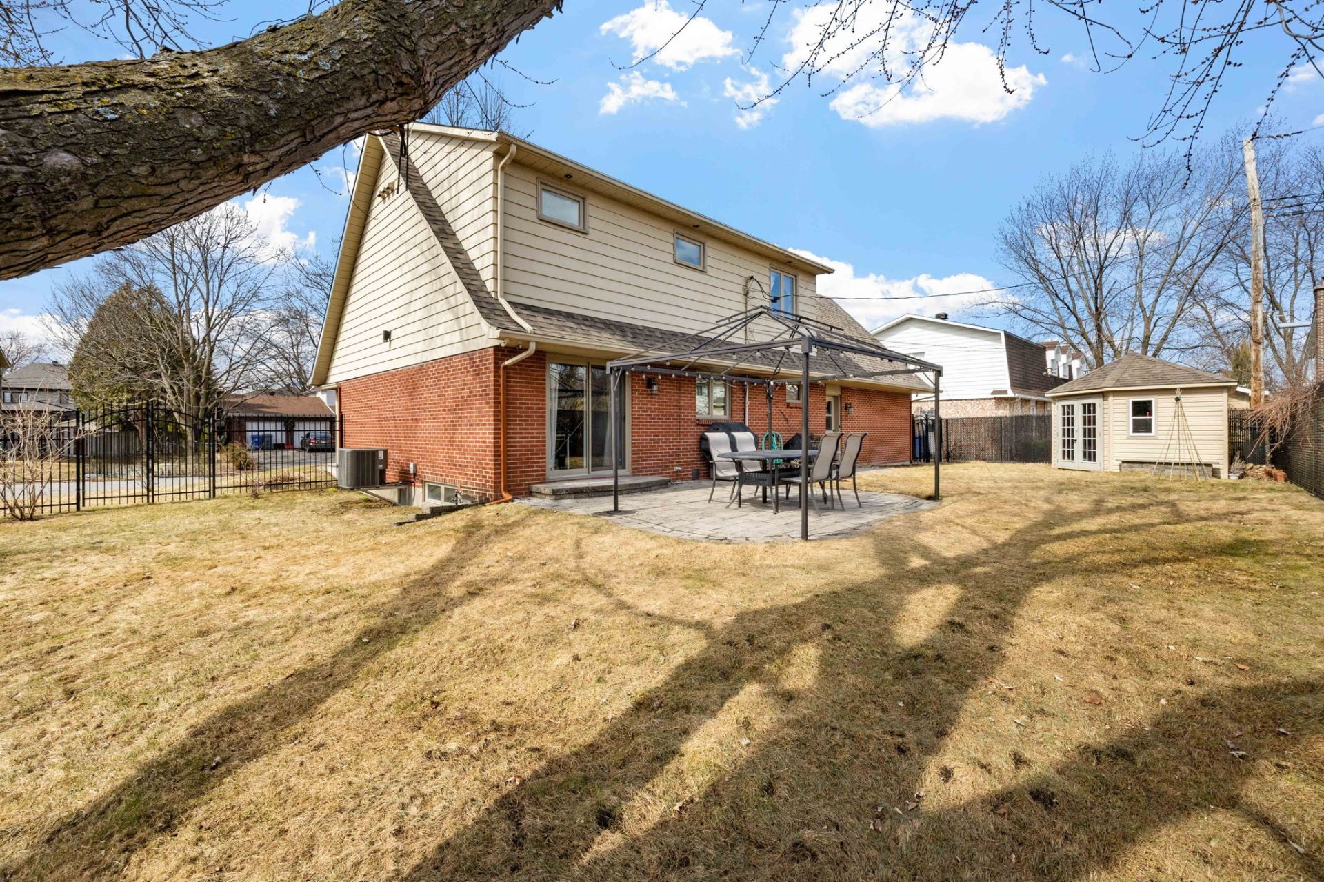 Patio doors lead to a generously sized backyard, complete with a Uni-stone patio and a 12 x 12 corner shed built on a concrete slab, featuring epoxy flooring, electricity, and an alarm system. The outdoor space is further enhanced with an 8-camera surveillance system, automatic lighting, a wrought iron and Frost privacy fence, and an irrigation system for easy maintenance. An expanded Uni-stone driveway offers parking for vehicles.