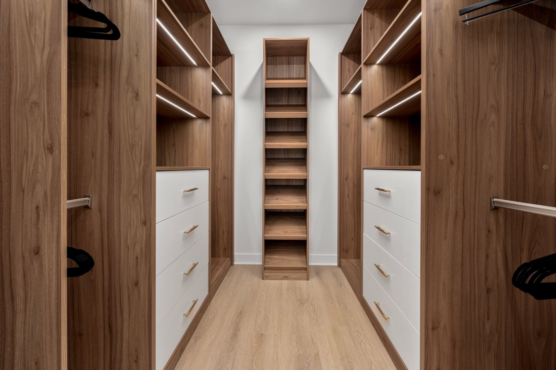 * Custom walk-in closet with built-in cabinetry and integrated lighting in the primary bedroom