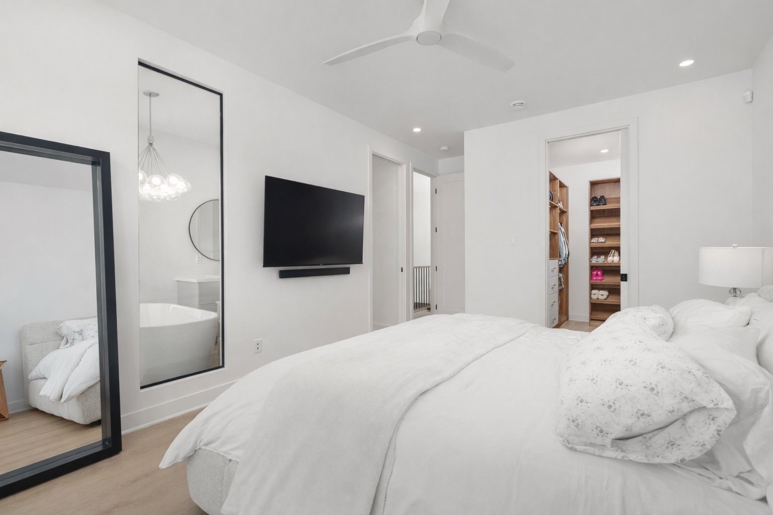 * Custom walk-in closet with built-in cabinetry and integrated lighting in the primary bedroom