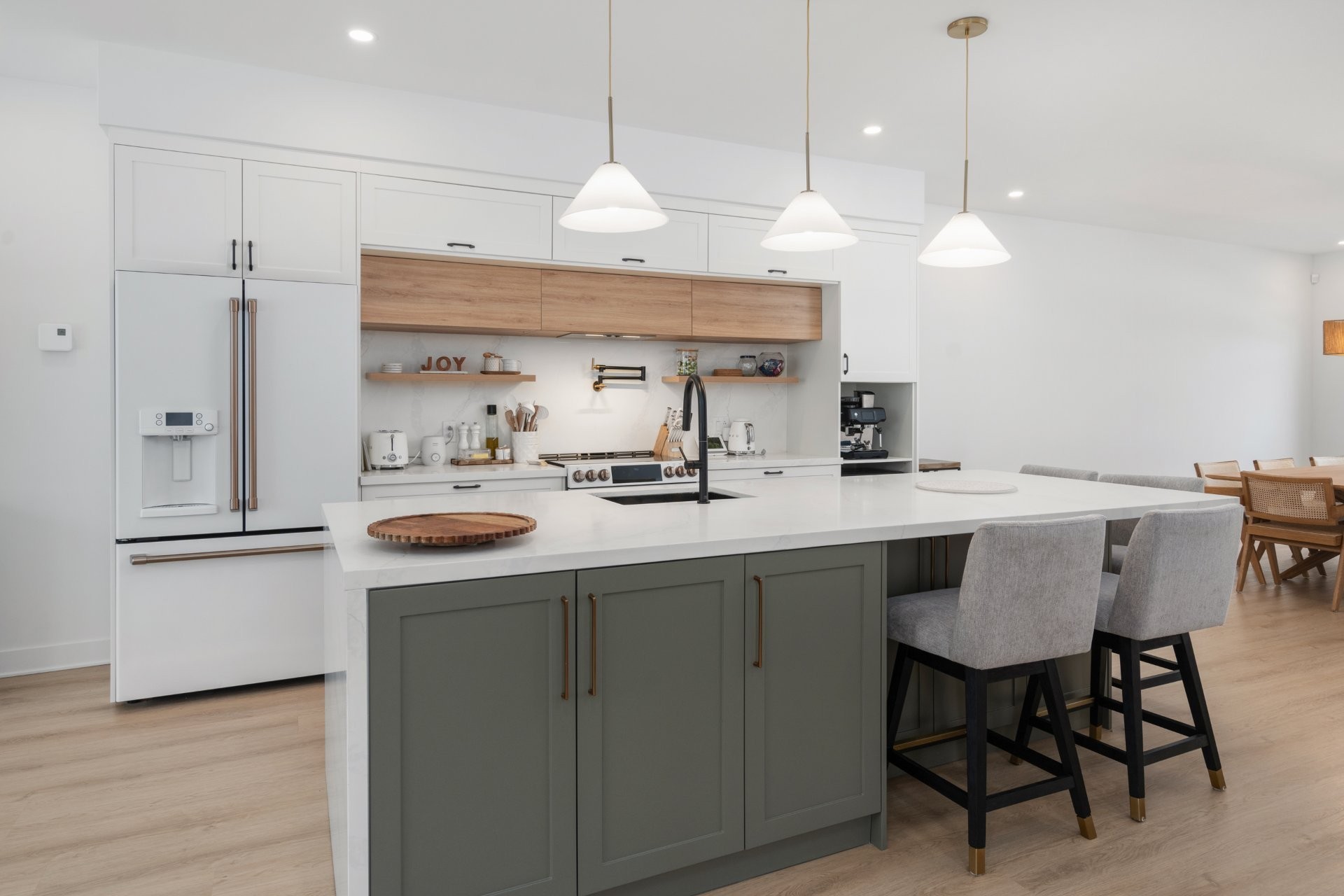 The main level showcases a sun-filled open-concept living area that seamlessly connects the living room, dining area, and kitchen, creating an inviting environment ideal for both everyday living and entertaining. The kitchen serves as the focal point of the home, featuring upgraded cabinetry, premium countertops, a pot filler, enhanced lighting, and a generous island, combining both style and functionality.