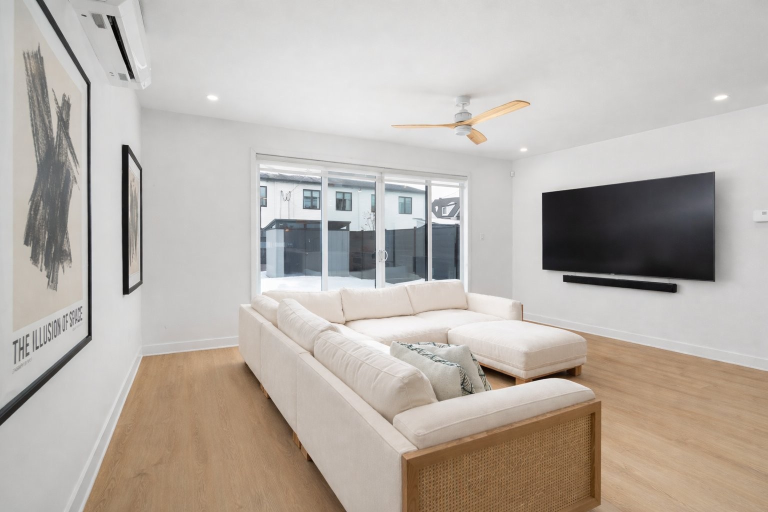 Large patio doors extend the living space outdoors, allowing natural light to flood the home while creating a seamless connection between interior living areas and the backyard.