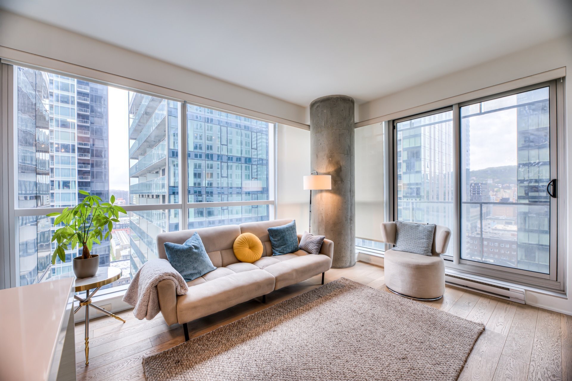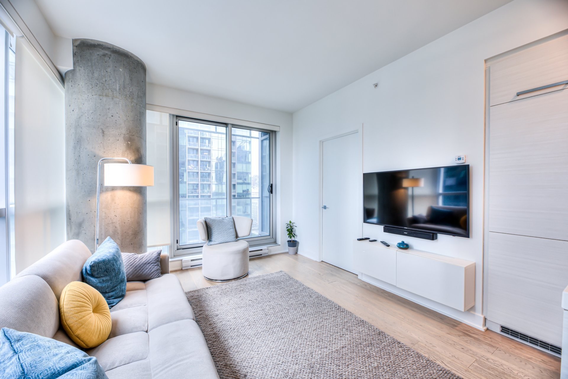 Unité de coin partiellement meublé moderne au YUL avec 2 chambres, 1 salle de bain et espace lumineux à aire ouverte. Fenêtres pleine hauteu...