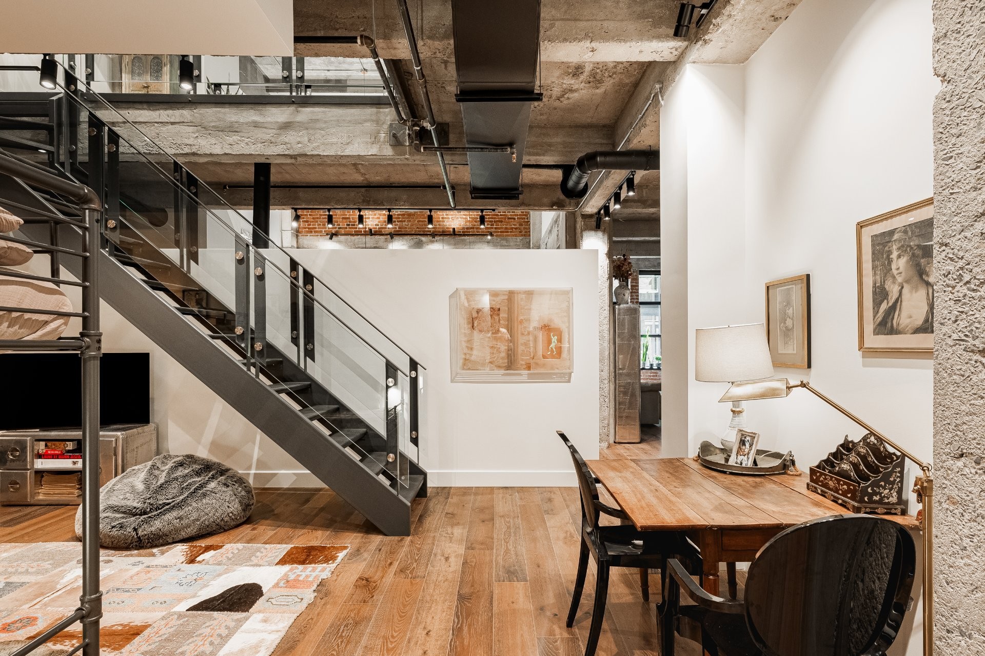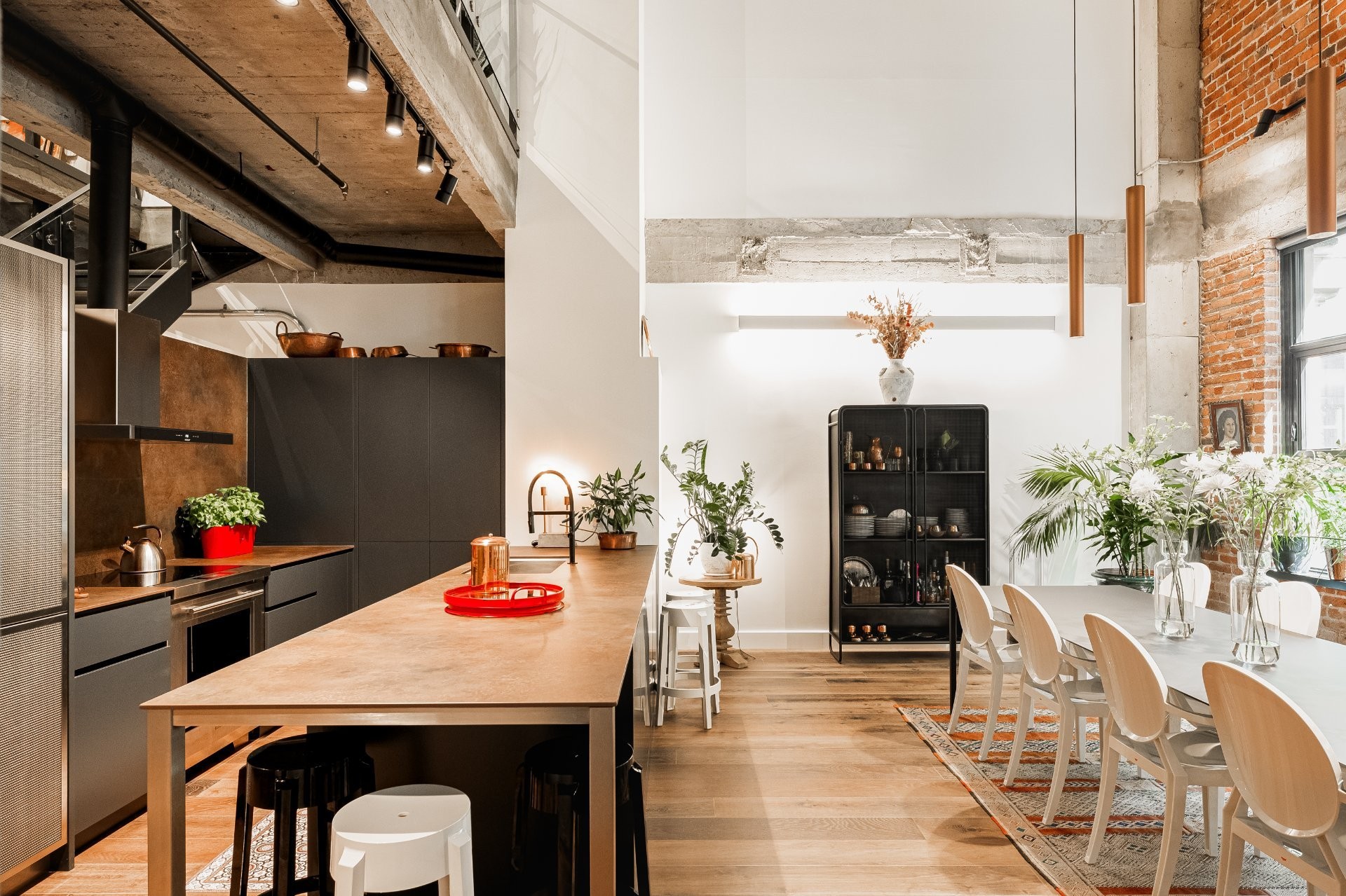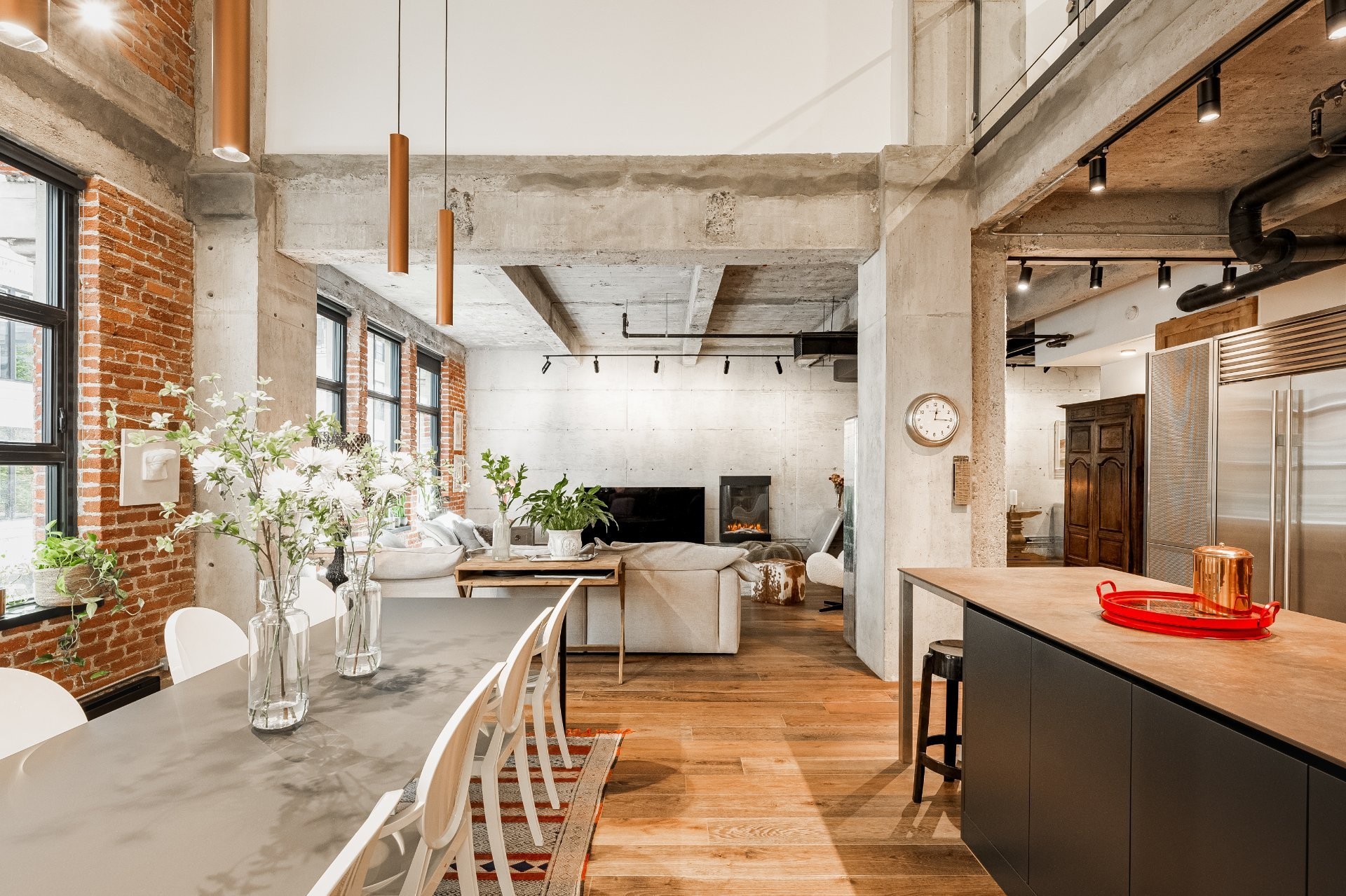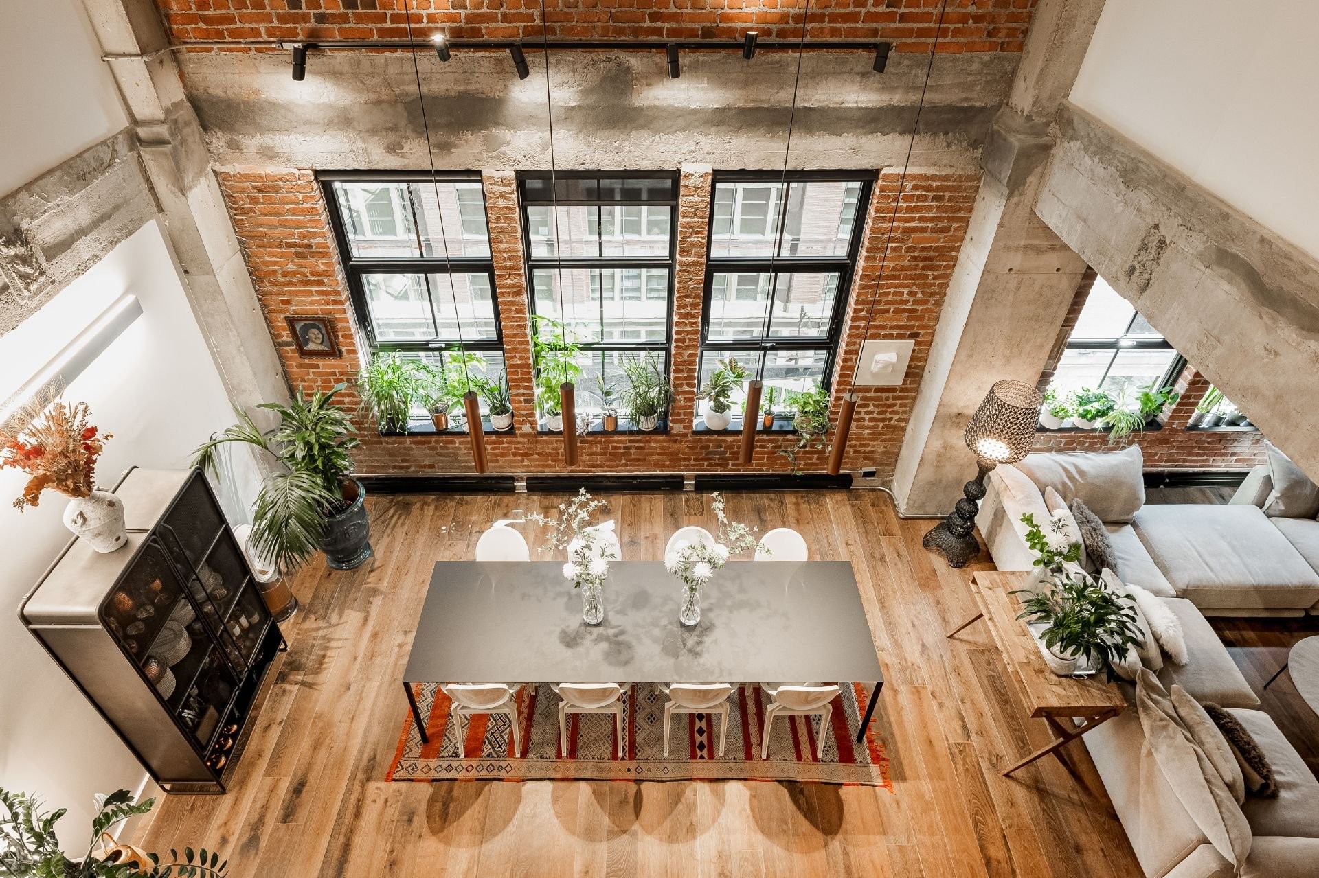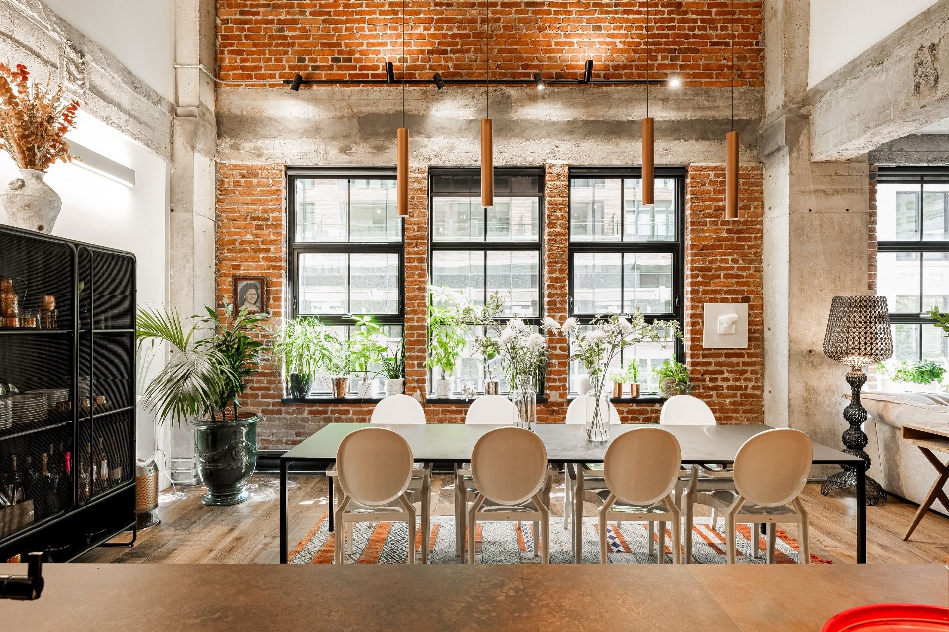 The impressive dinning room features a soaring 22-foot ceiling and exceptional pendant lights, creating a grand yet inviting atmosphere. The exposed brick and concrete walls enhance the loft-style ambiance, adding a distinctive urban edge.
