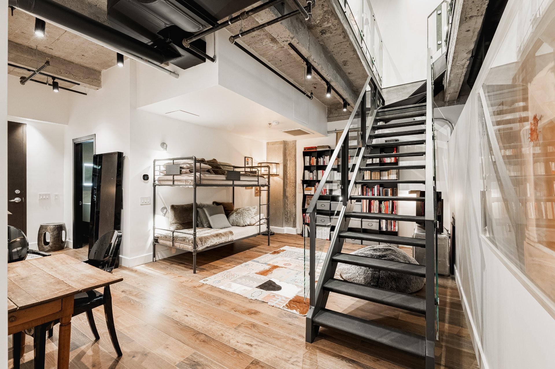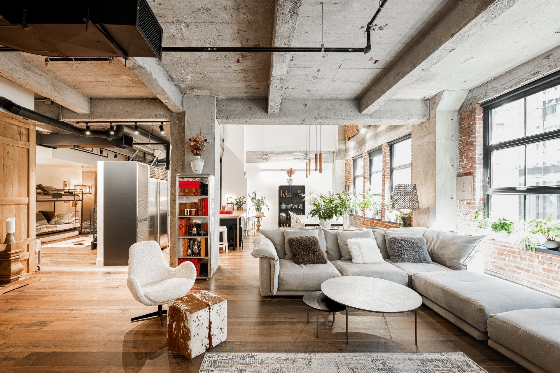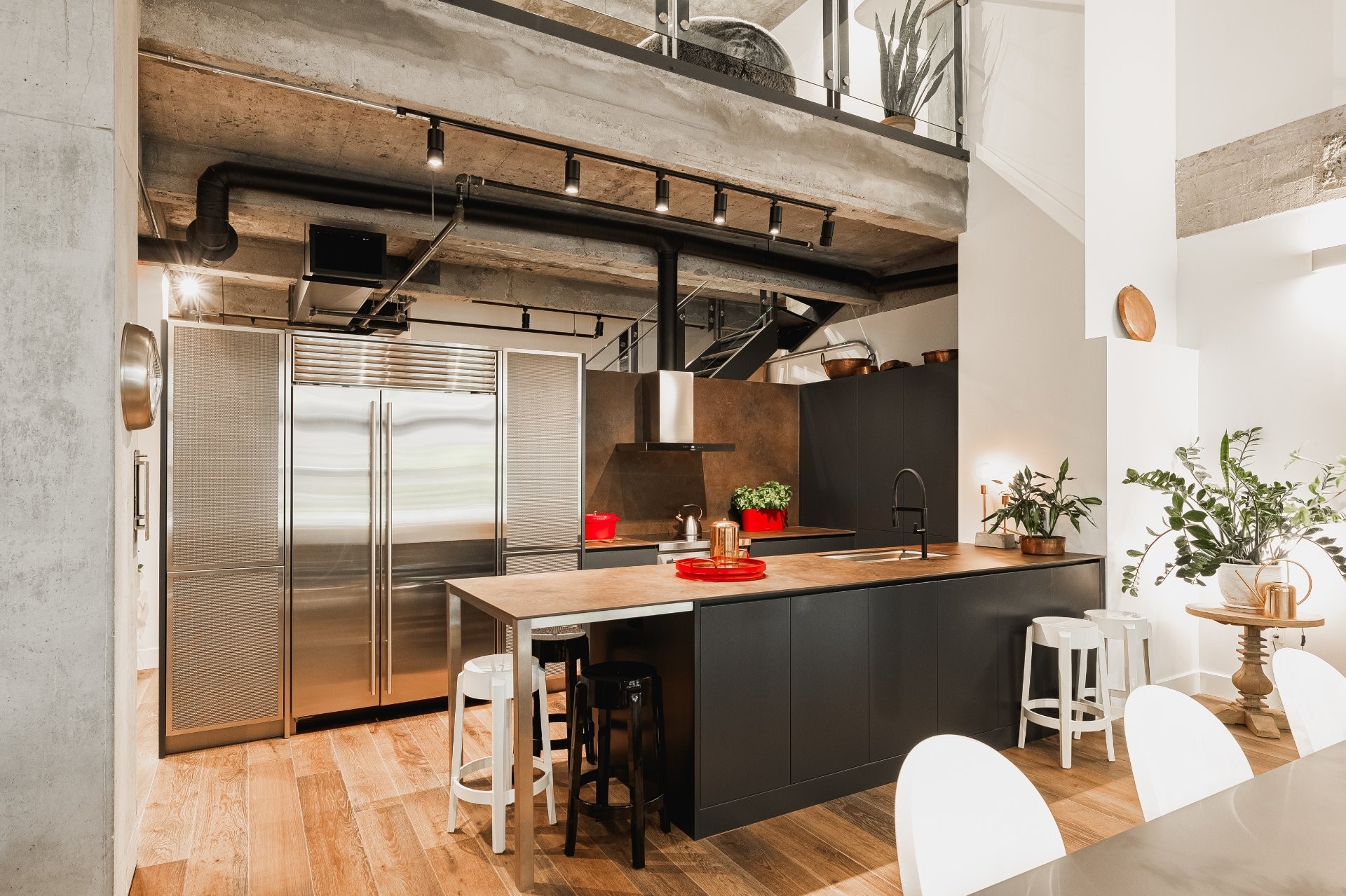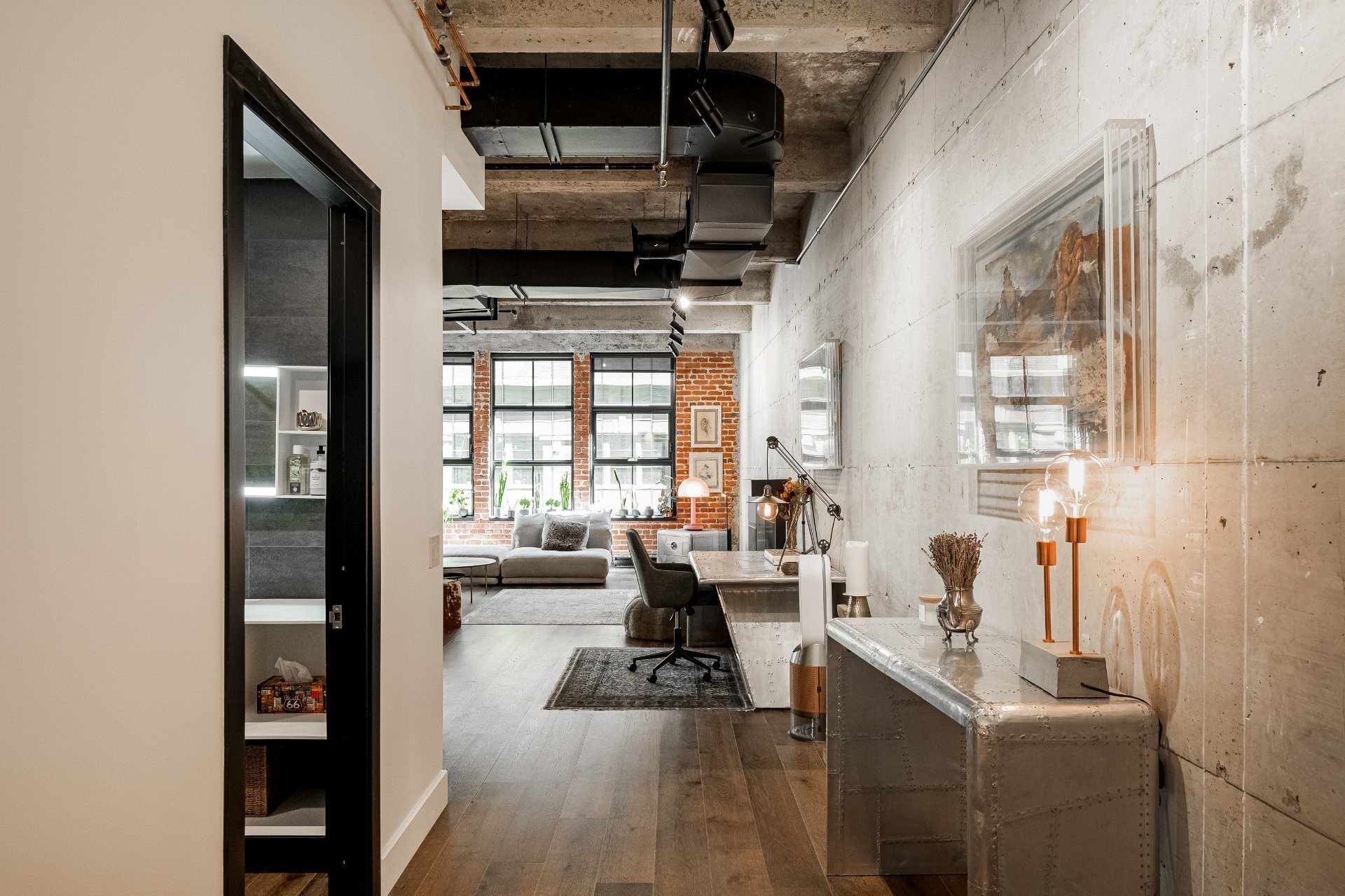 The impressive dinning room features a soaring 22-foot ceiling and exceptional pendant lights, creating a grand yet inviting atmosphere. The exposed brick and concrete walls enhance the loft-style ambiance, adding a distinctive urban edge.