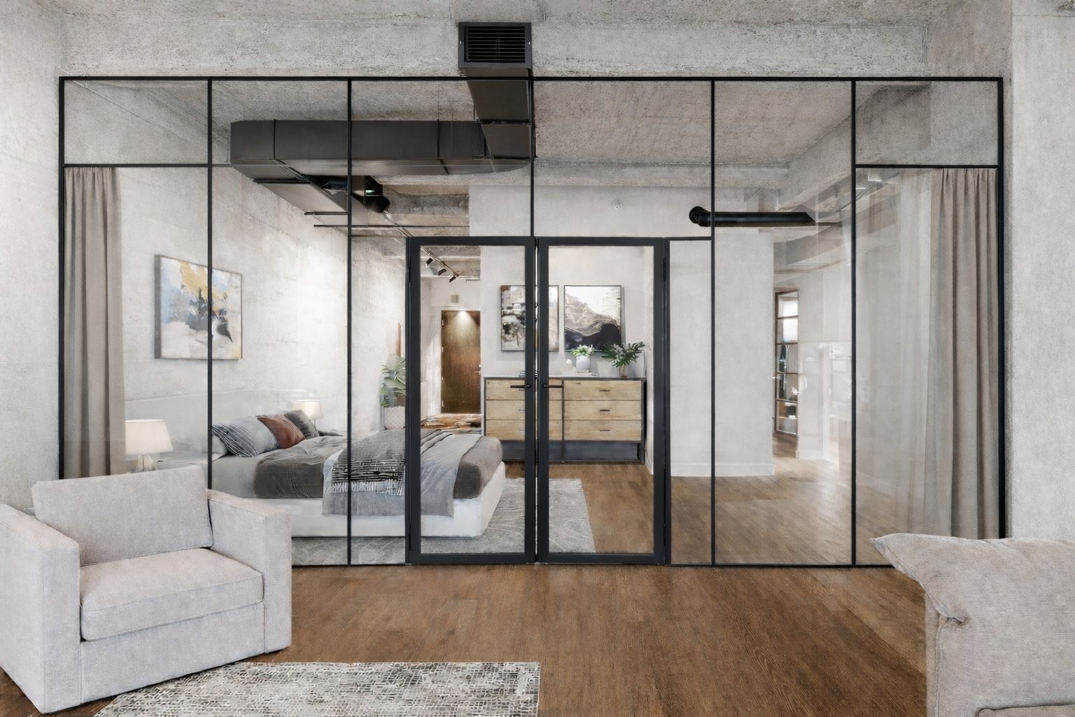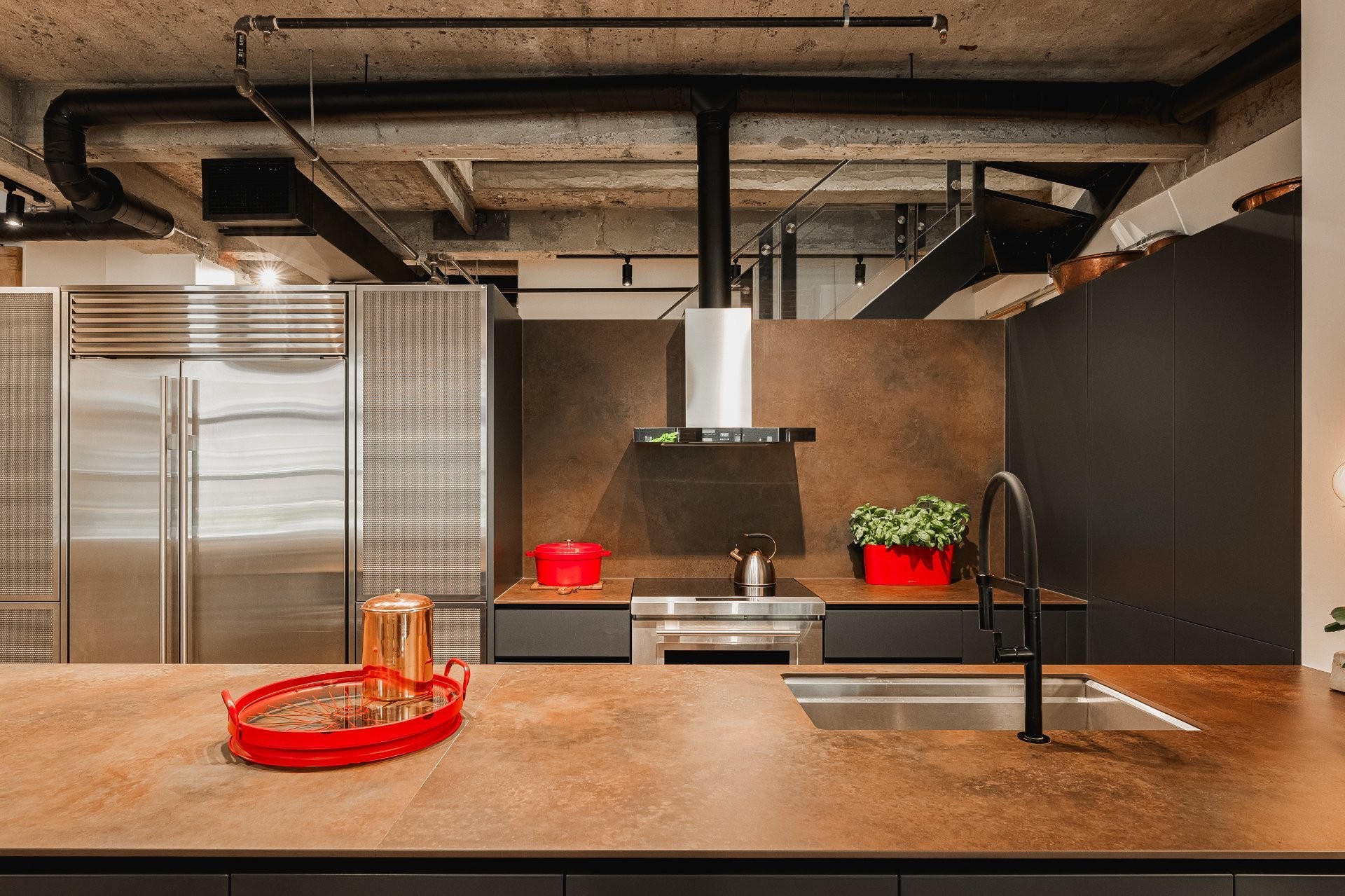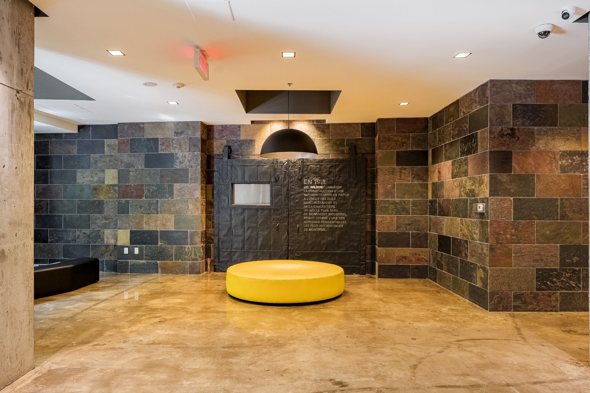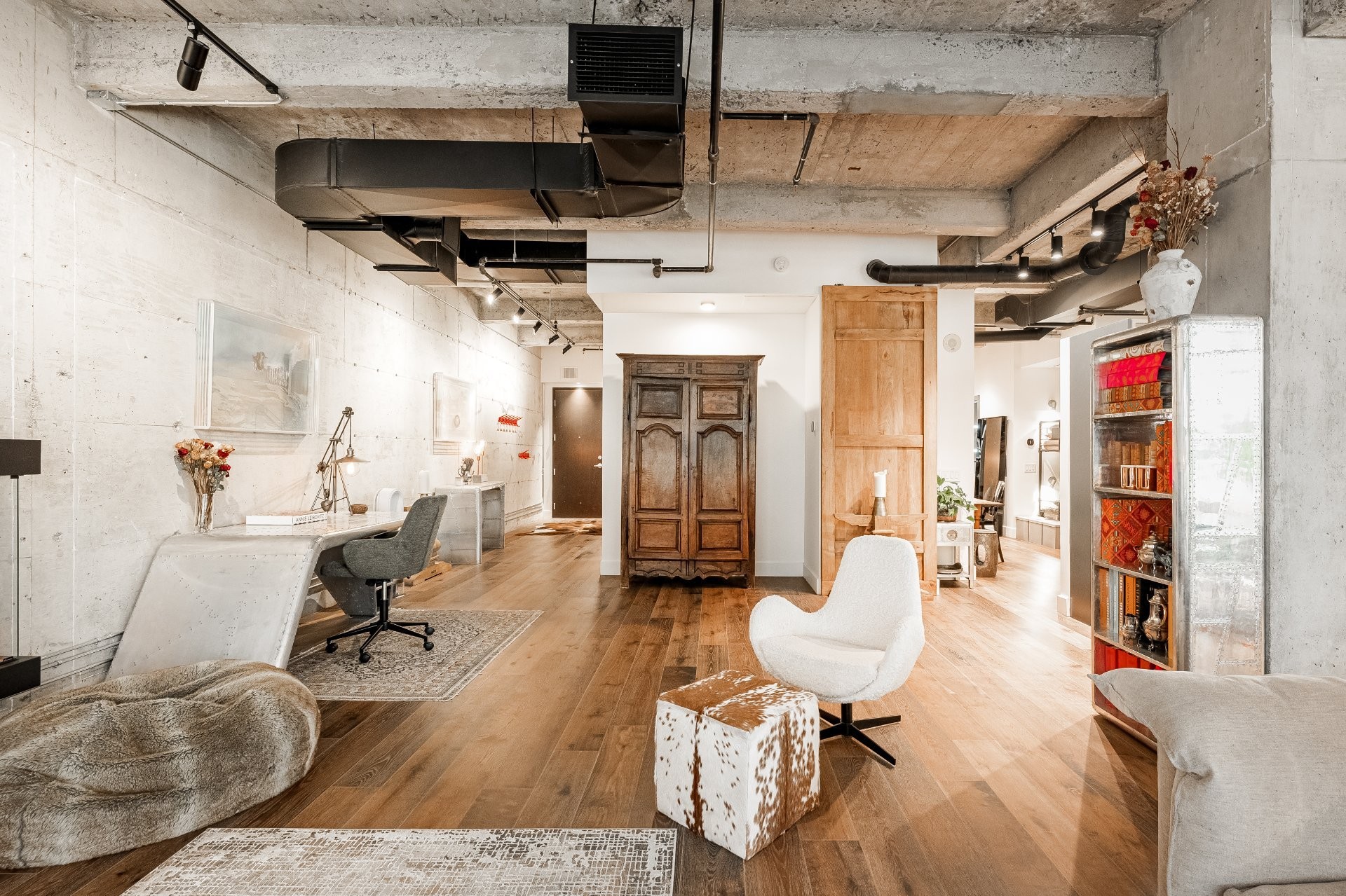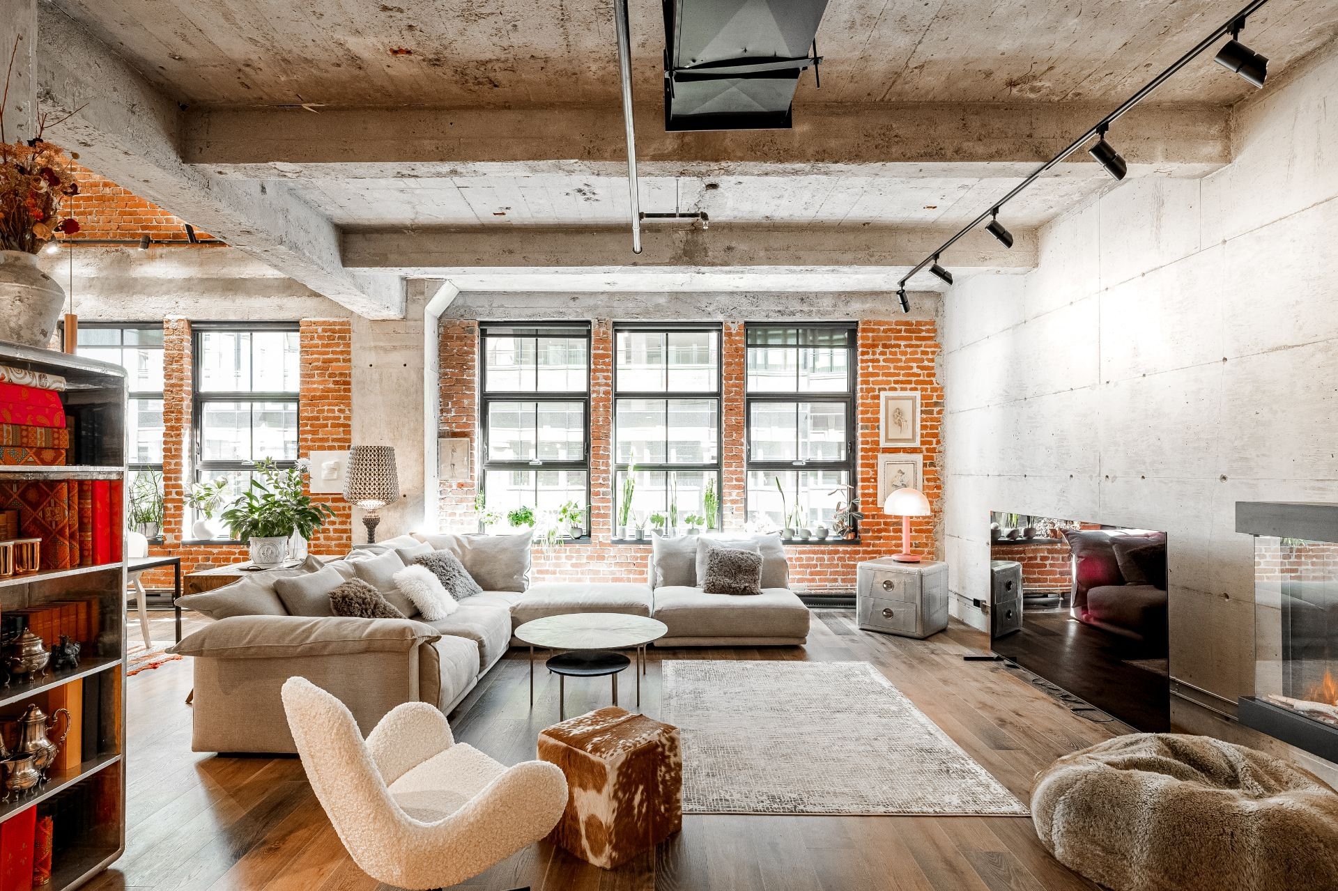 The impressive dinning room features a soaring 22-foot ceiling and exceptional pendant lights, creating a grand yet inviting atmosphere. The exposed brick and concrete walls enhance the loft-style ambiance, adding a distinctive urban edge.