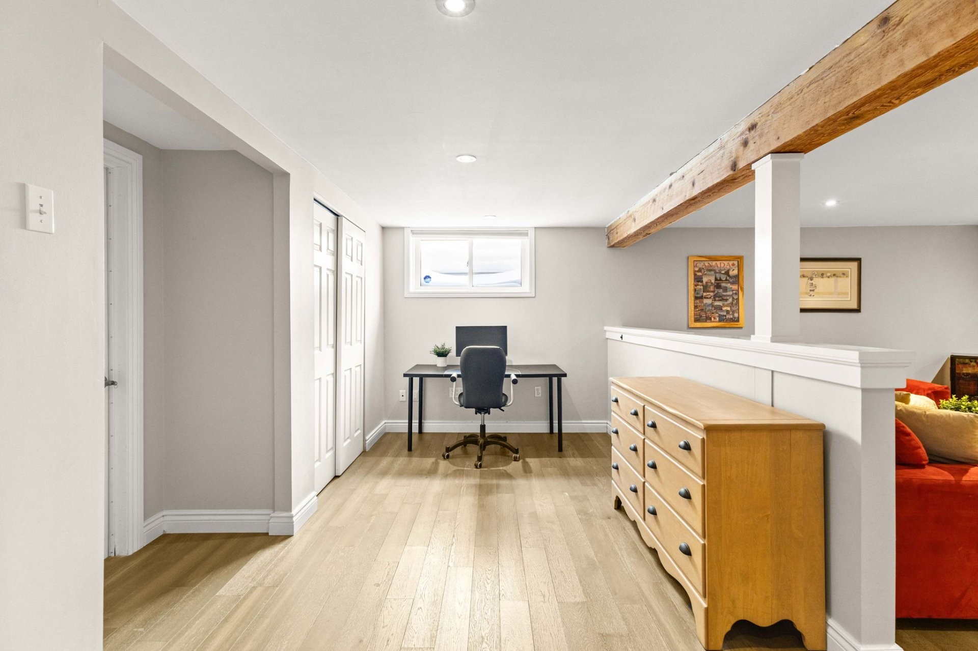 The recently renovated basement adds valuable living space with a large playroom, a dedicated nook ideal for a home office, an additional bedroom, and a full bathroom, perfect for guests or growing families.
