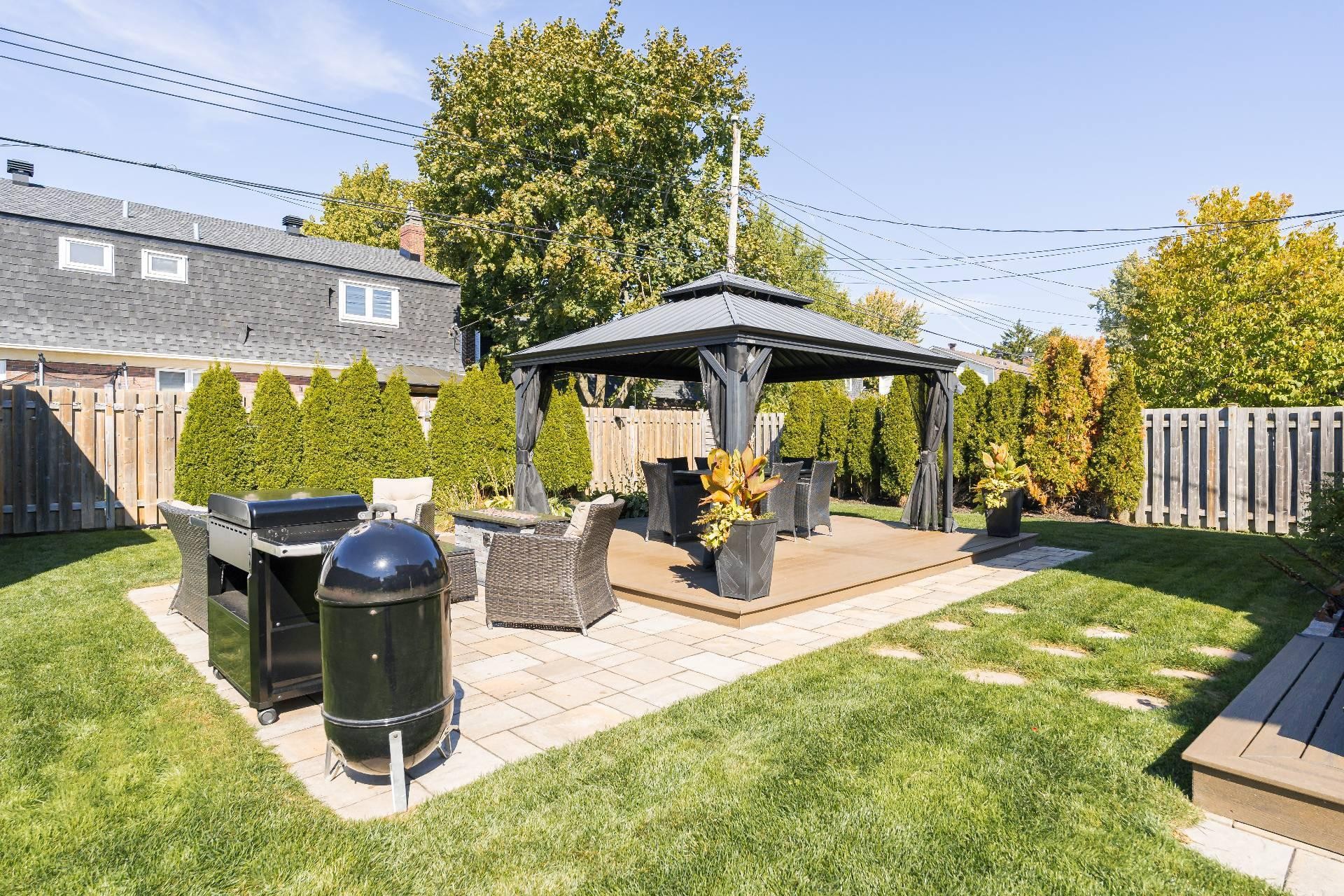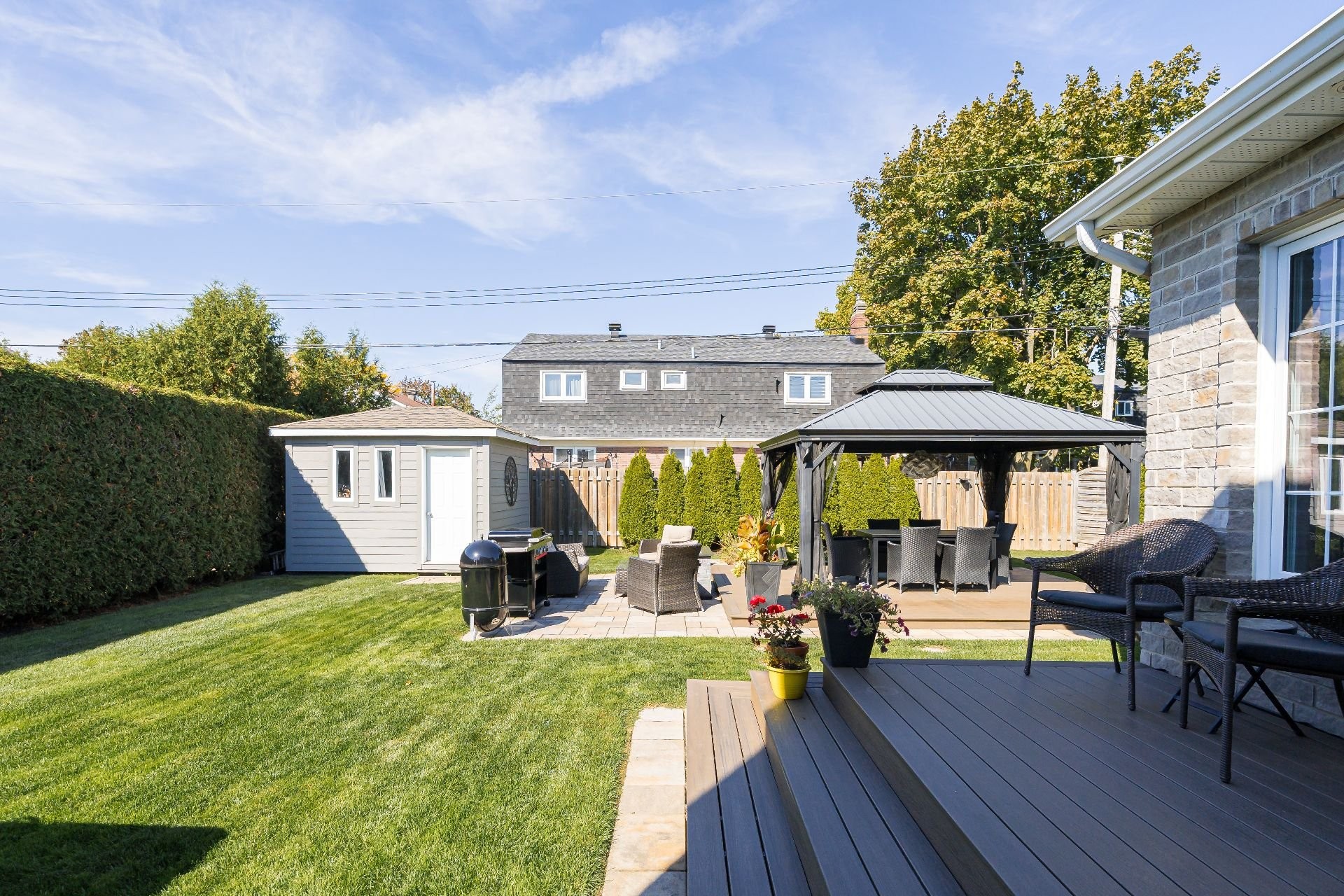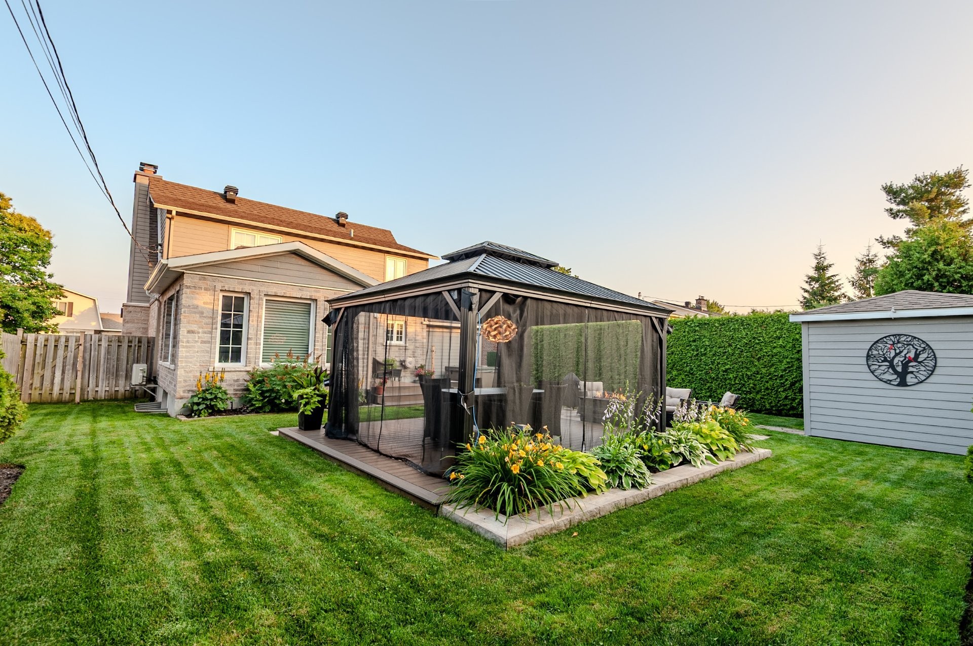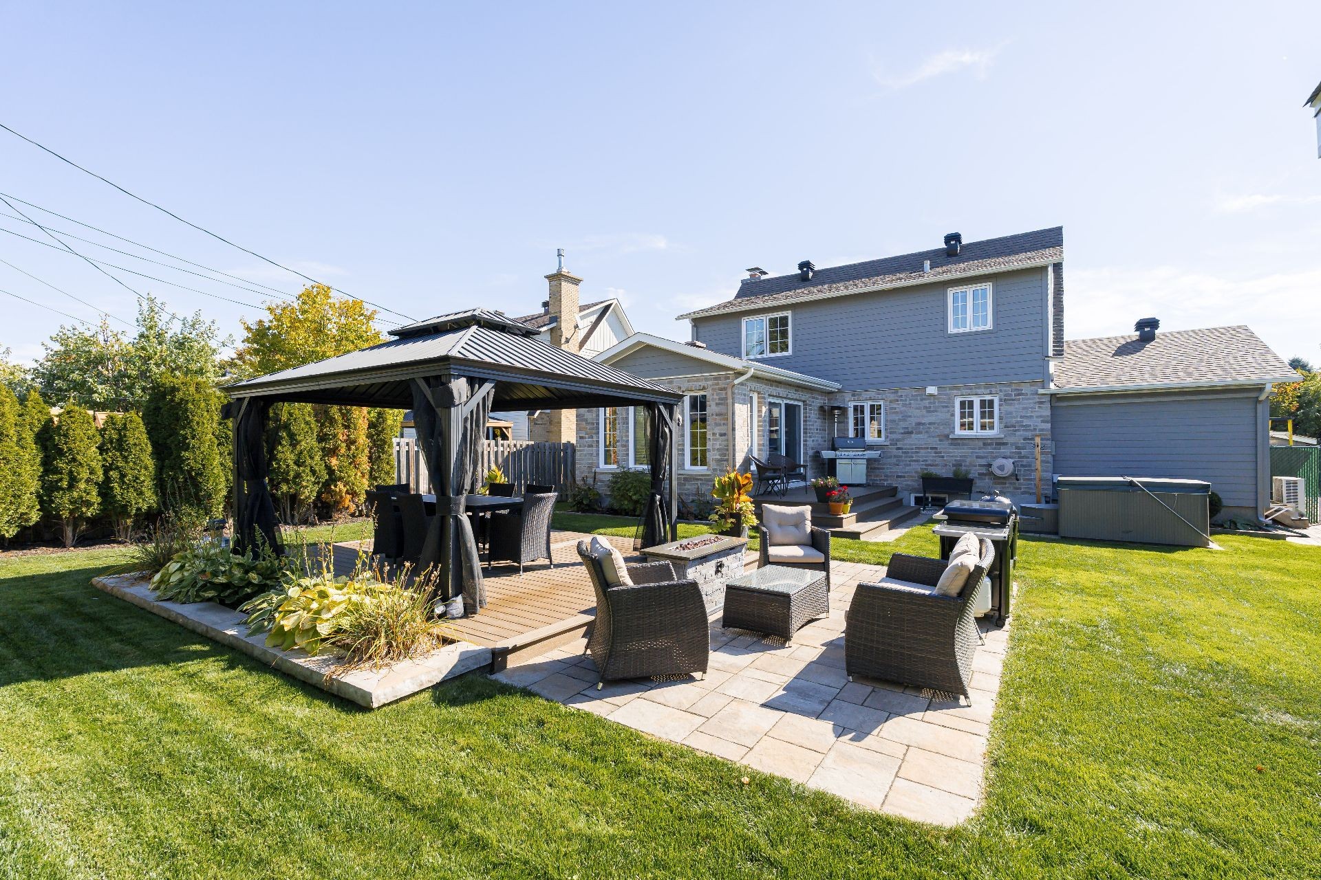 The fully fenced and landscaped backyard, thoughtfully designed with a firepit, gazebo, cabana and elegant Uni-stone patio is ideal for year-round gatherings. An integrated irrigation system ensures easy lawn care and reduced maintenance throughout the seasons.