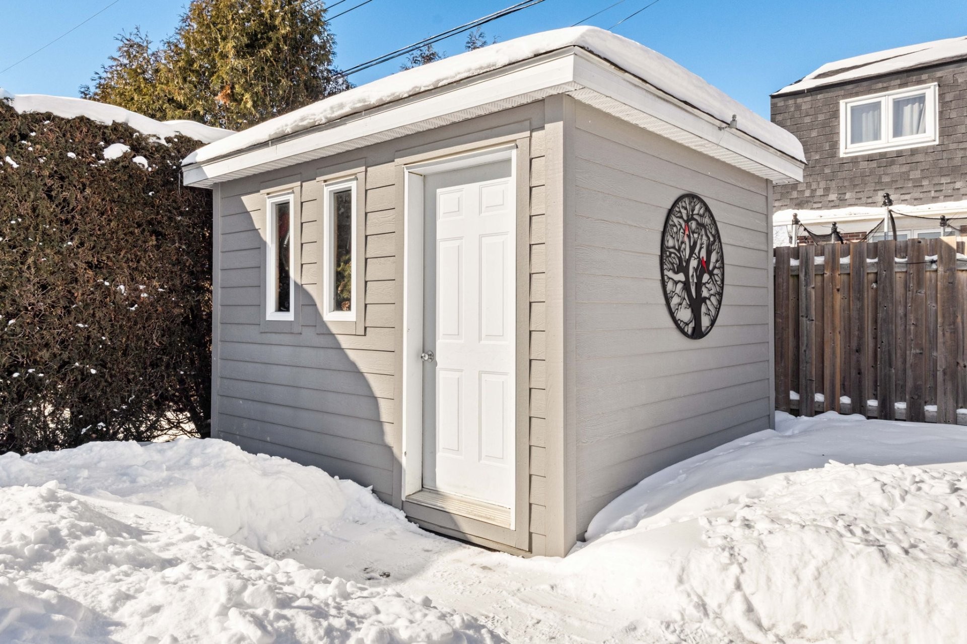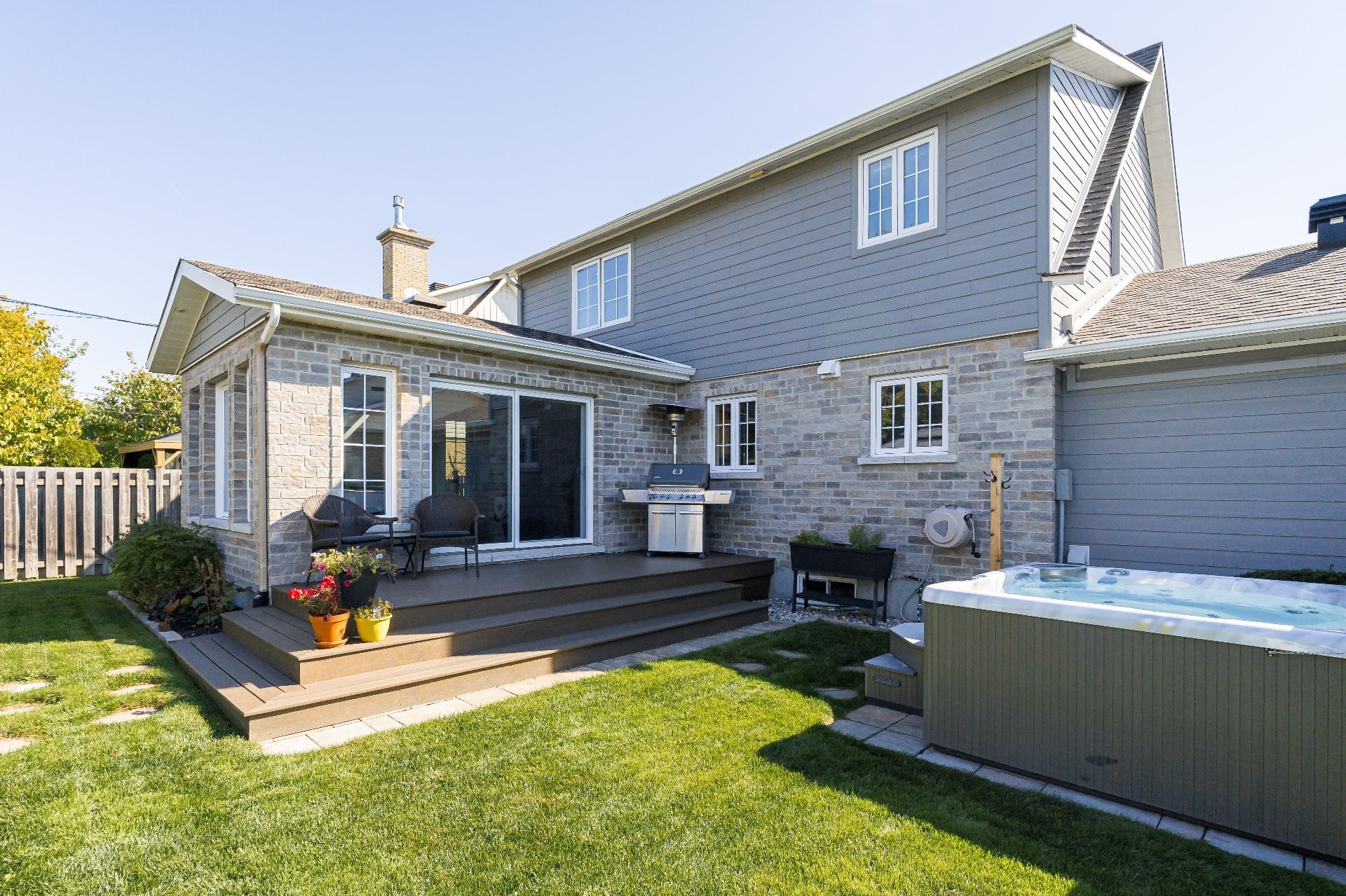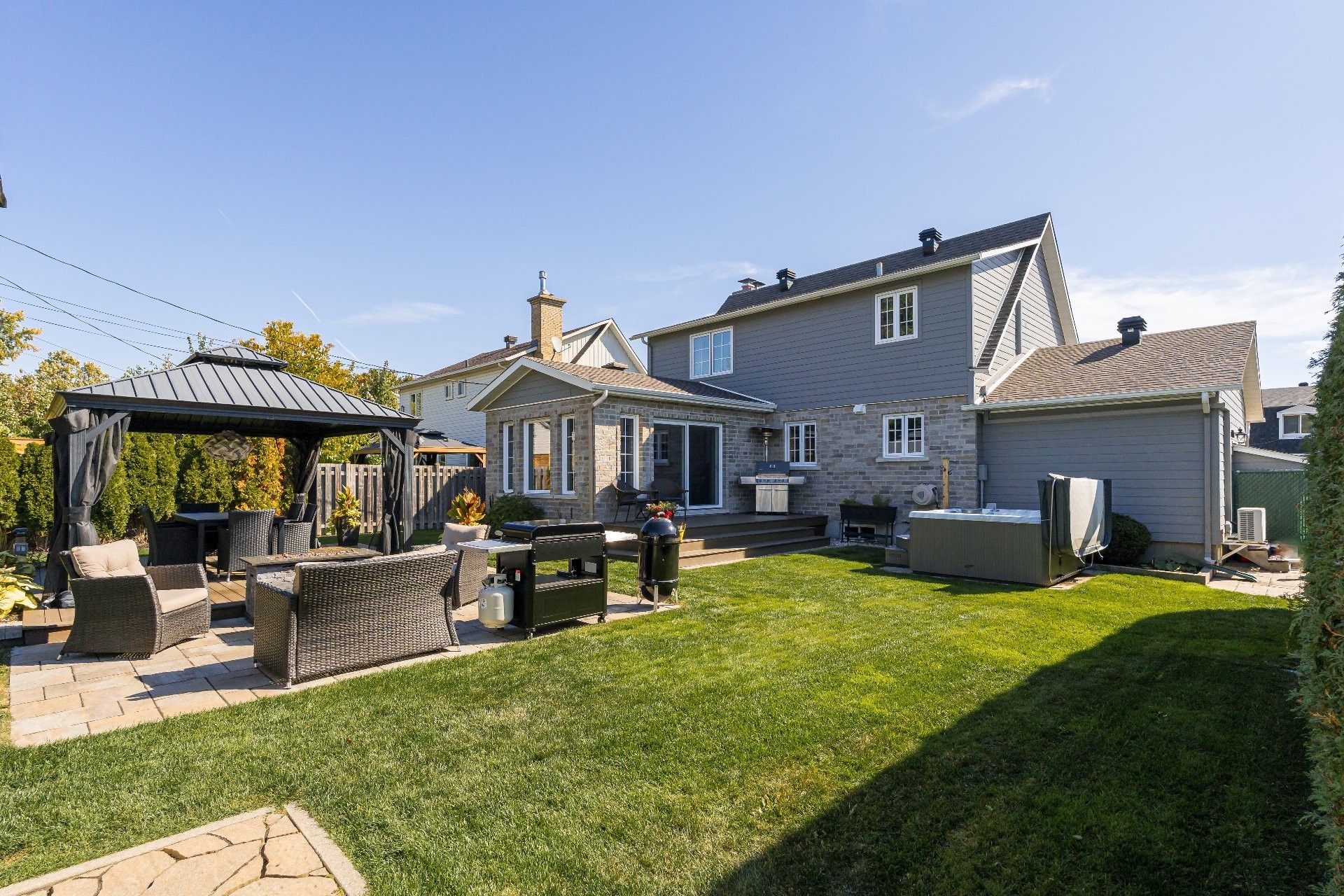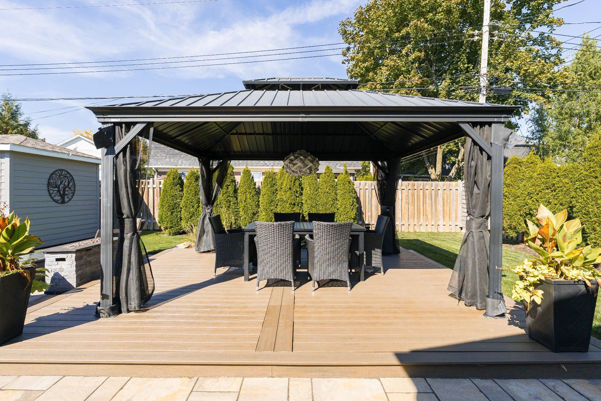 The fully fenced and landscaped backyard, thoughtfully designed with a firepit, gazebo, cabana and elegant Uni-stone patio is ideal for year-round gatherings. An integrated irrigation system ensures easy lawn care and reduced maintenance throughout the seasons.