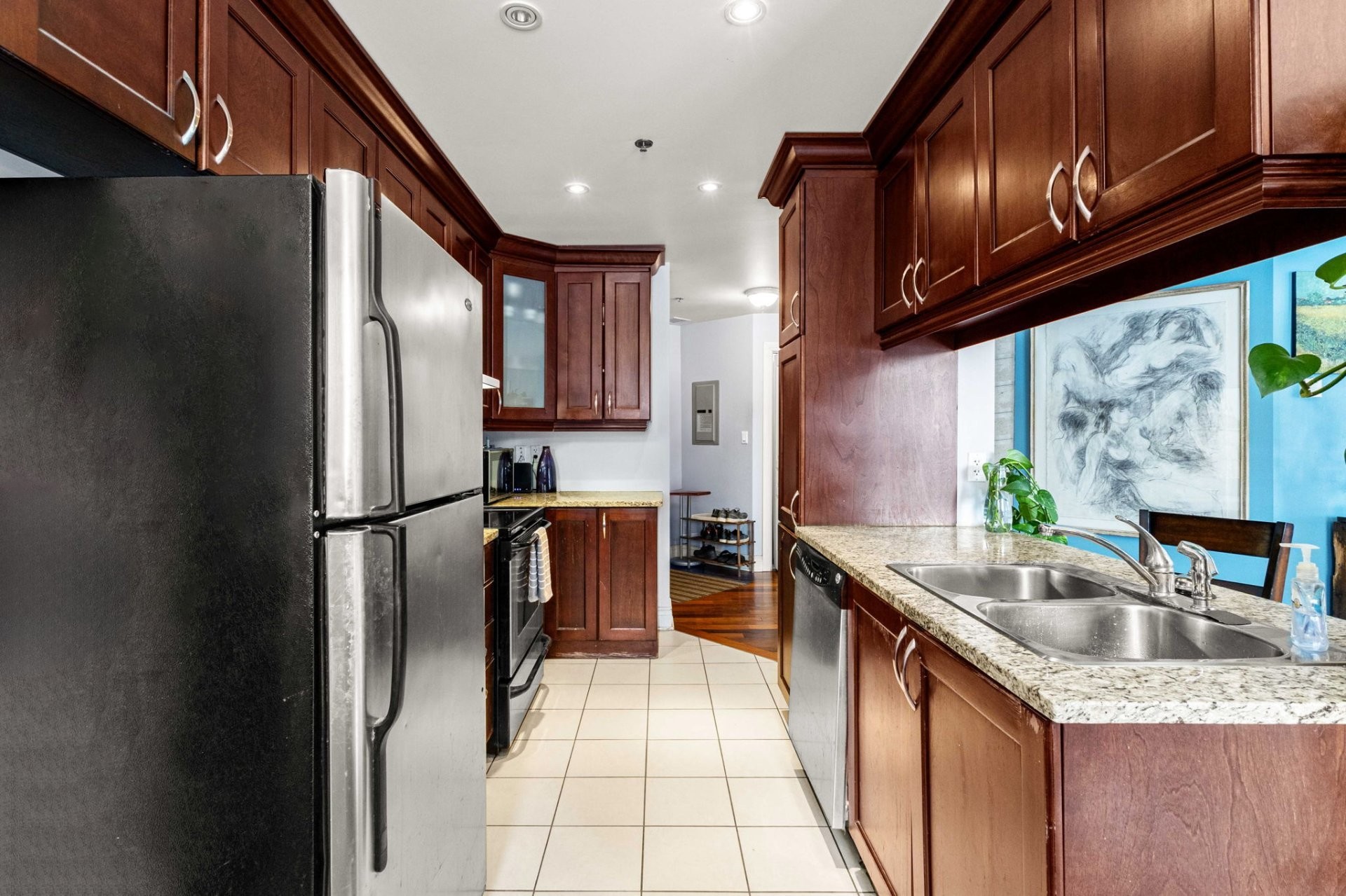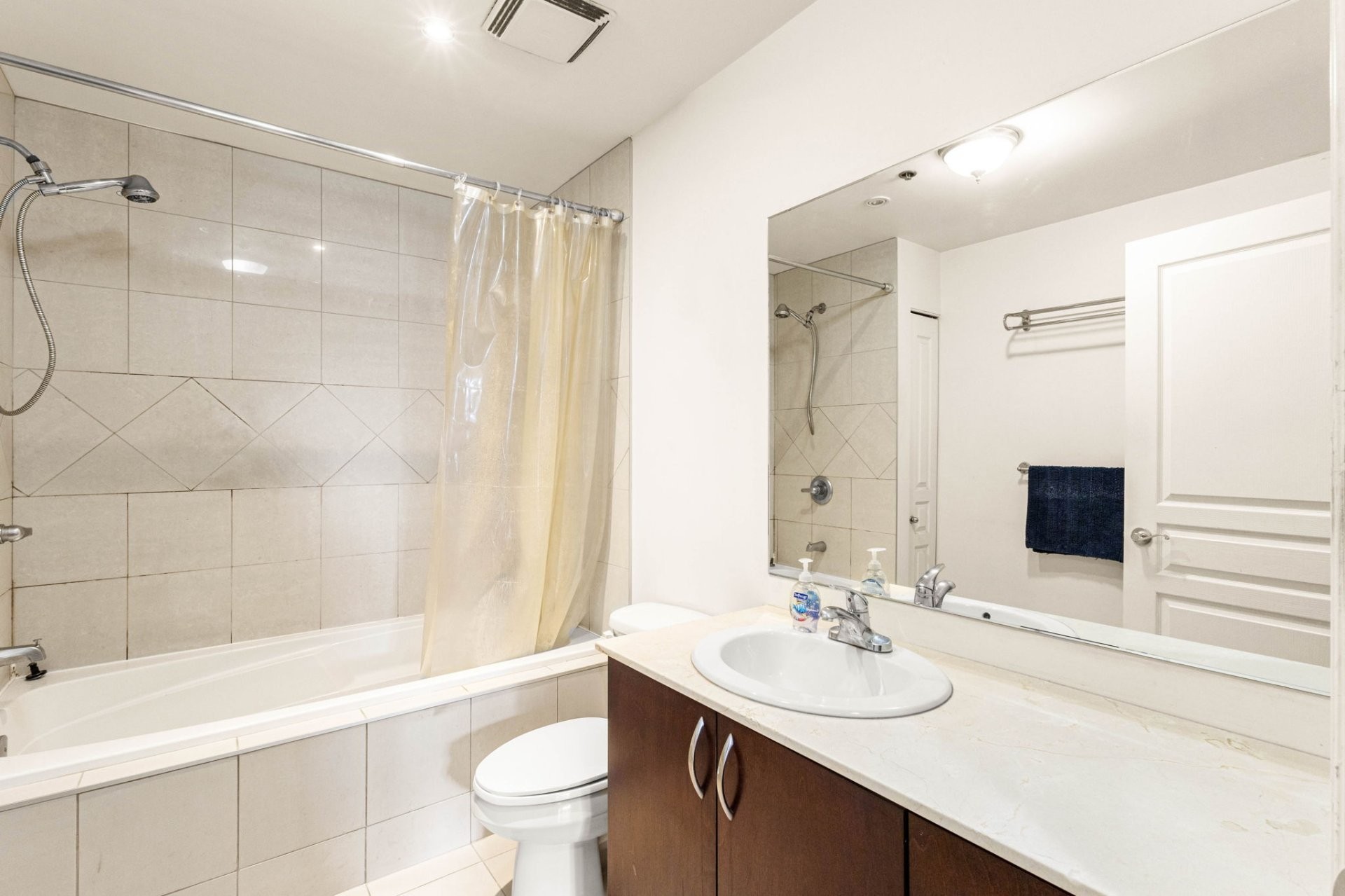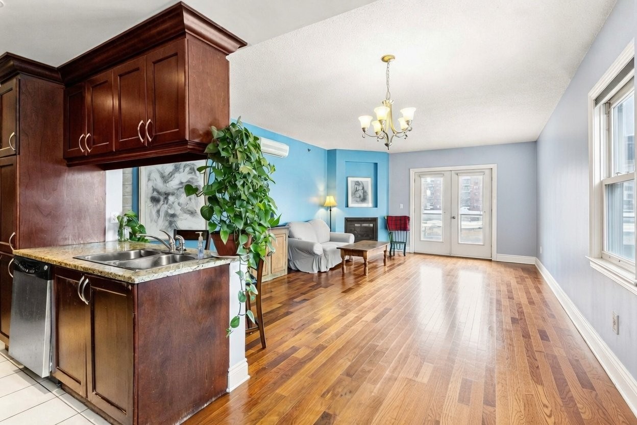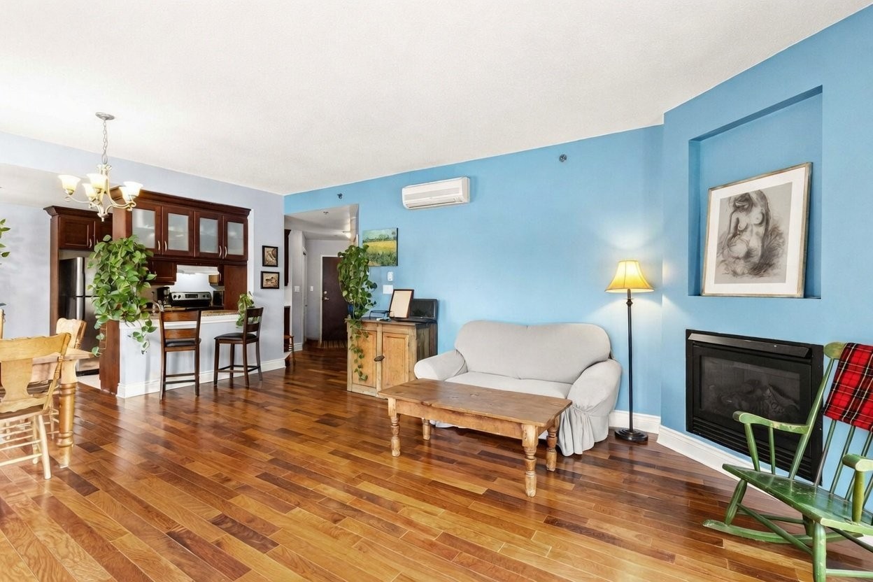 This inviting 2-bedroom, 2-bathroom corner condo in Upper West Side Phase 3 offers modern elegance and exceptional convenience in the heart of Dollard-des-Ormeaux. The open-concept layout features high ceilings, hardwood floors throughout the living and dining areas, and generous closet space in both bedrooms. The kitchen stands out with ceramic floors, wood cabinets, and luxurious marble countertops. Relax by the natural gas fireplace, enjoy wall-mounted air conditioning, and ensuite bathroom, and a second full bathroom. Practical perks include in-unit laundry, electric baseboard heating, and abundant storage.