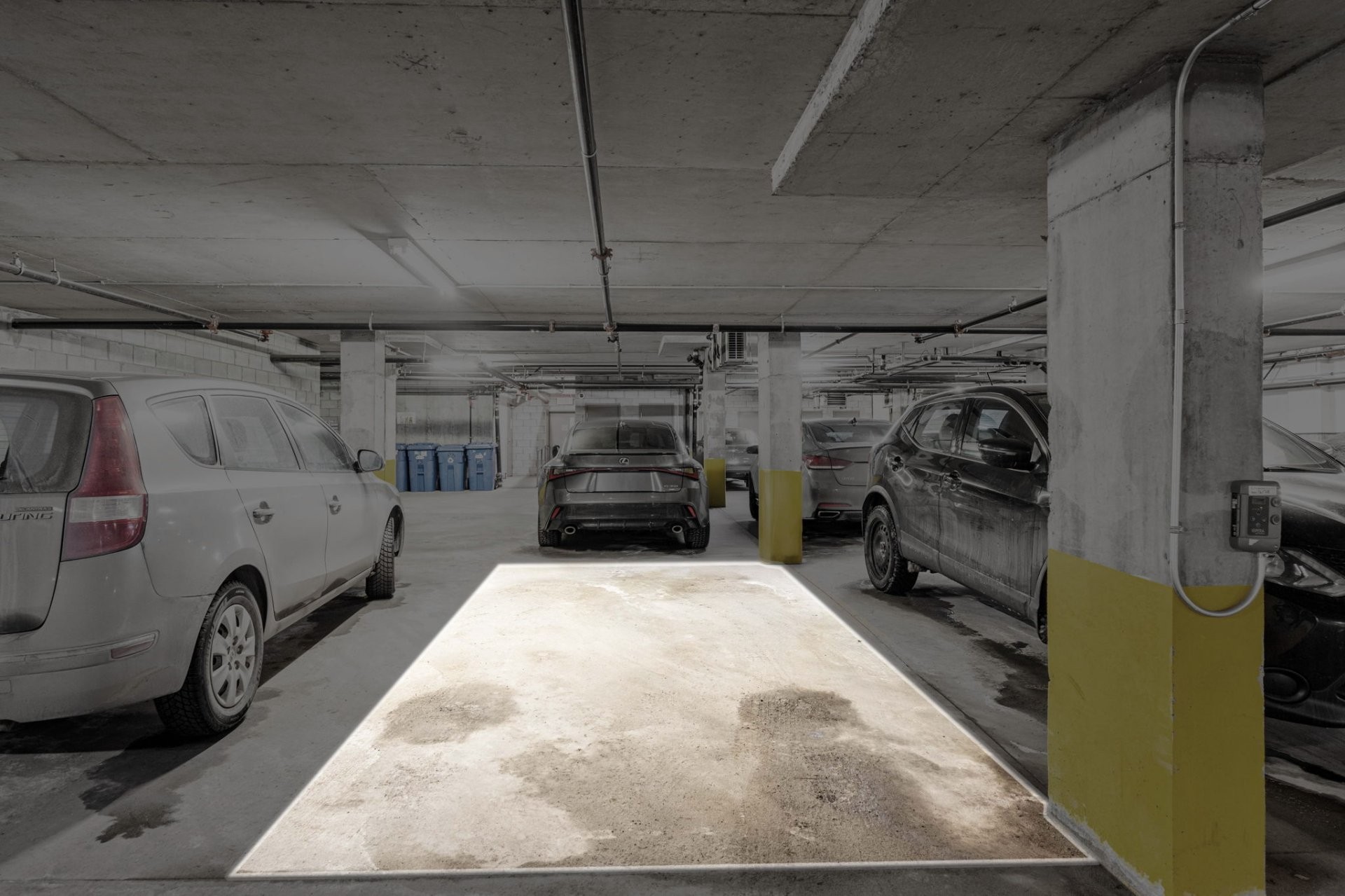 Outdoor living is enhanced by a spacious private balcony with views, plus secure parking: 1 indoor heated garage spot and 1 outdoor spot, along with a dedicated locker. The building is soundproofed (concrete construction), mobility-accessible, and equipped with elevators, intercom/camera system, sprinklers,