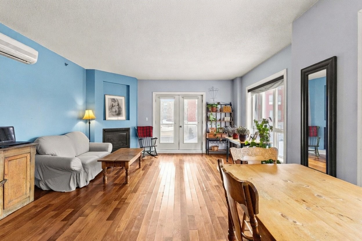 This inviting 2-bedroom, 2-bathroom condo in Upper West Side Phase 3 offers modern elegance and convenience in the heart of Dollard-des-Ormeaux. The open-concept design features high ceilings, hardwood floors in the living and dining areas, and bedrooms with ample closet space. The kitchen stands out with ceramic floors, wood cabinets, and luxurious marble countertops. Enjoy a natural gas fireplace, wall-mounted air conditioning, separate shower in the ensuite bath, and a second full bath. Practical perks include in-unit laundry, electric baseboard heating, and generous storage throughout.