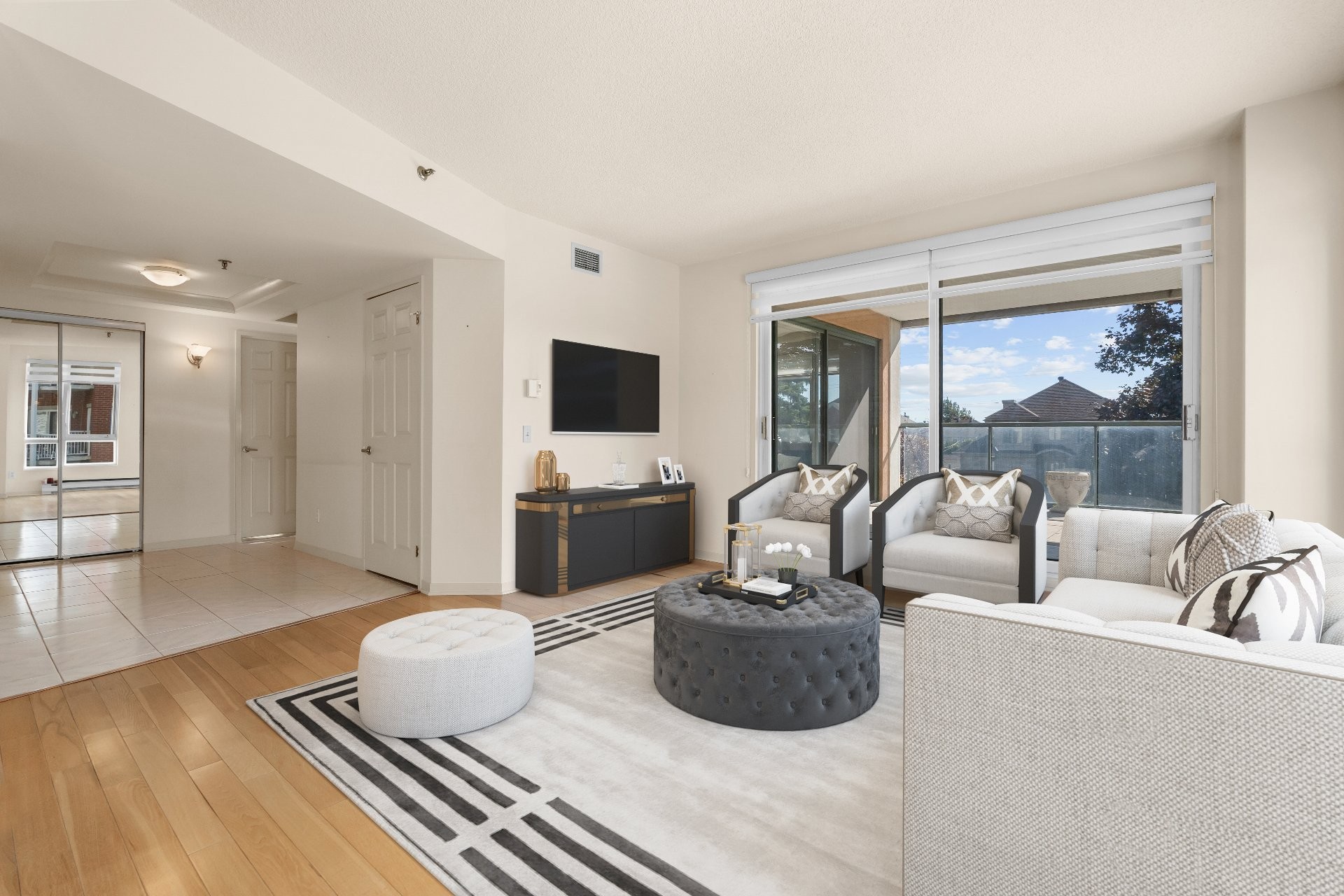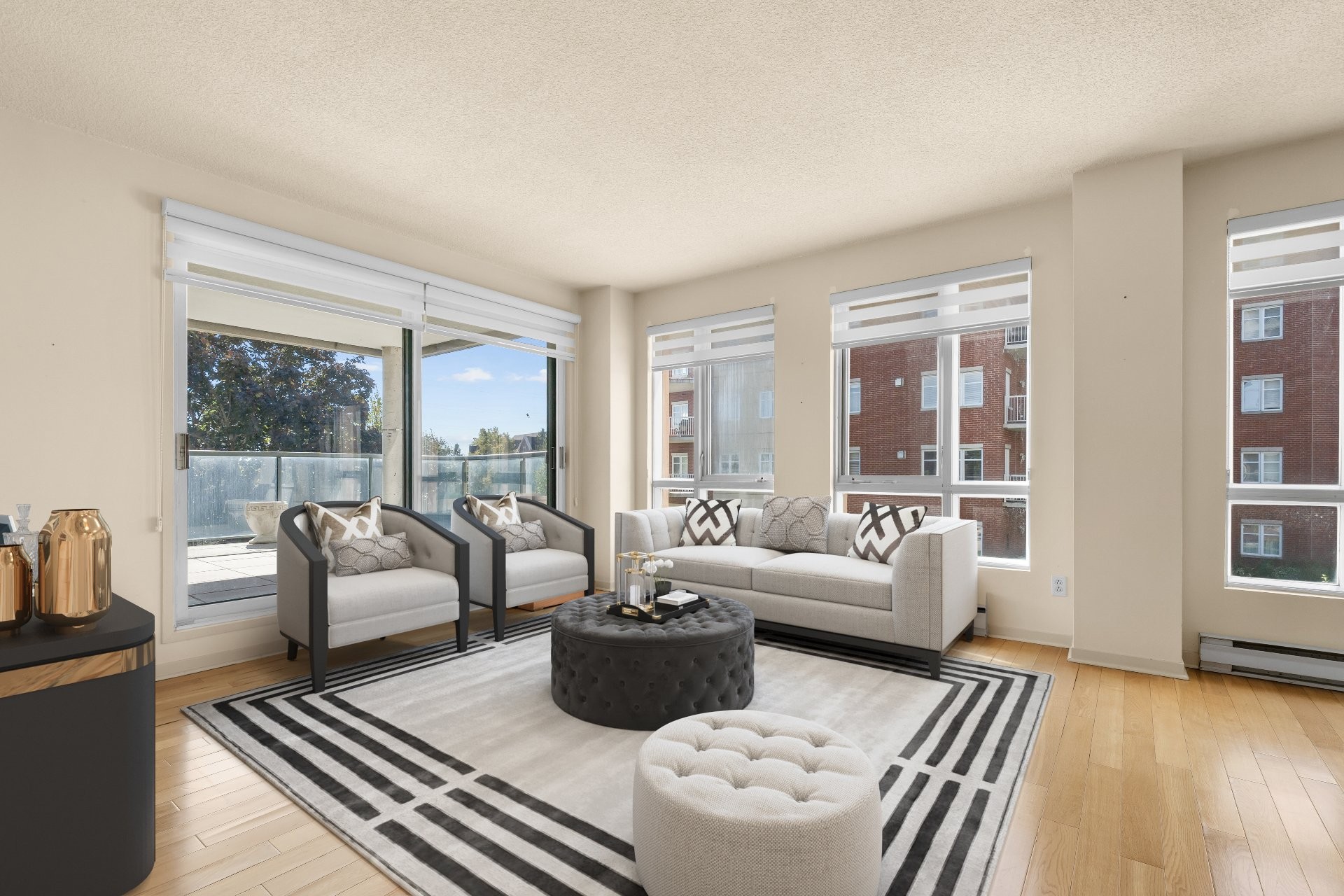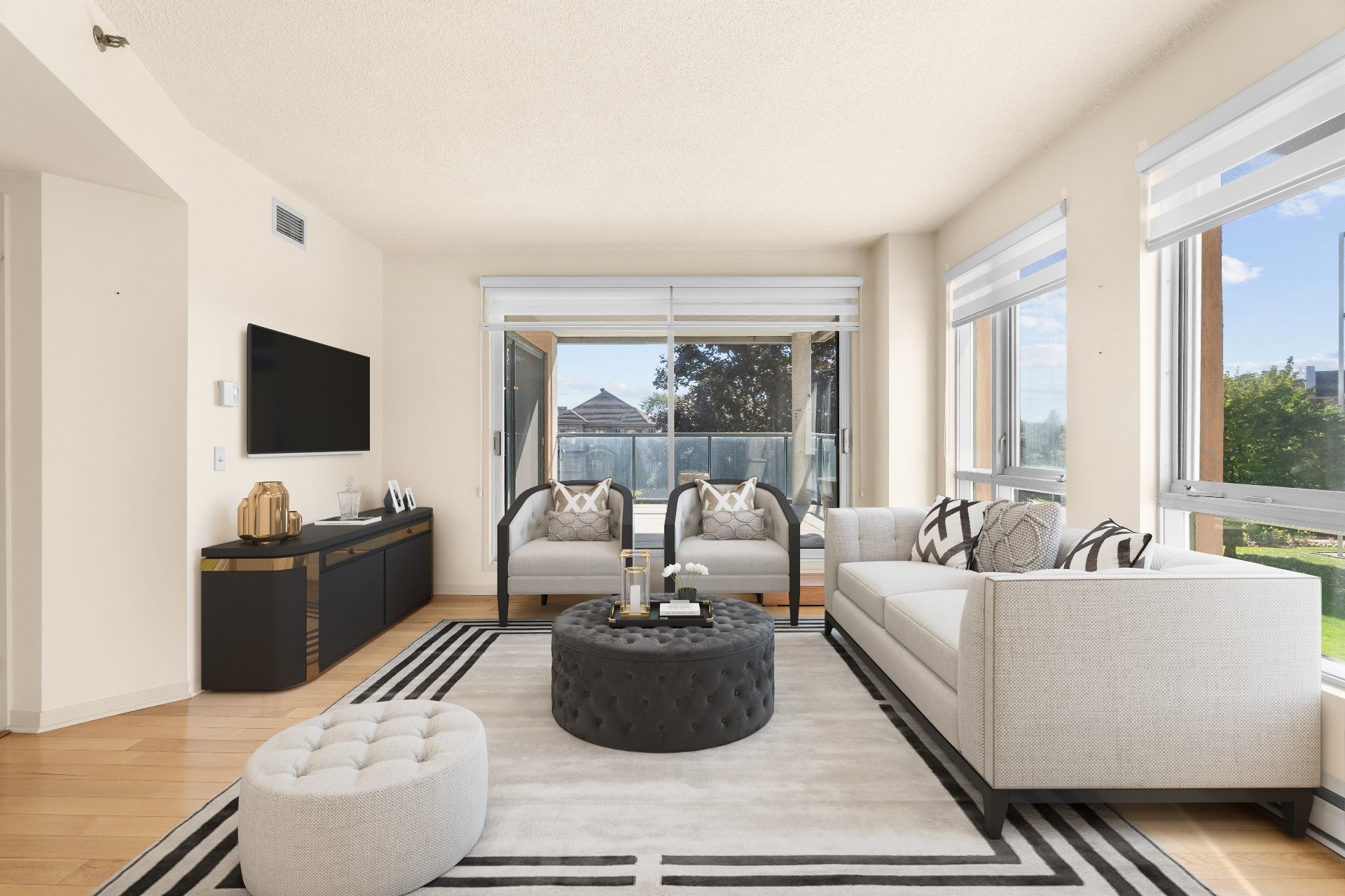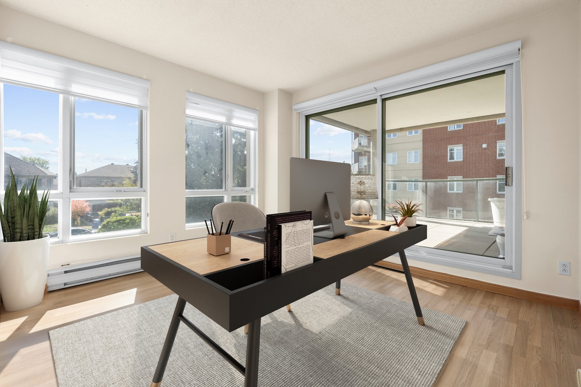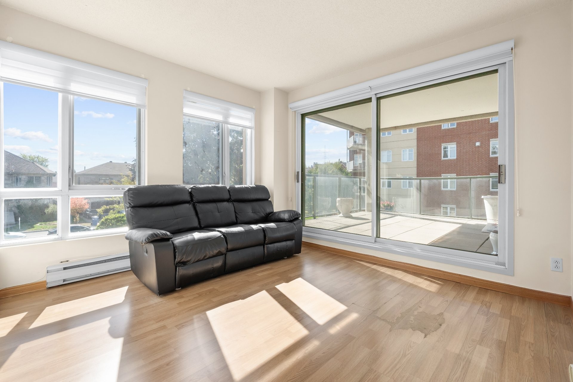 Welcome to unit 203 at 110 Rue Donnacona! An immaculate corner unit, featuring two bedrooms and two full bathrooms in the sought after Le Centenaire I building, ideally located in Dollard-des-Ormeaux beside Centennial Lake! This bright condo offers a spacious living and dining room area, well sized kitchen, a primary bedroom with ensuite bathroom, a second bedroom, and a second full bathroom, with a seperate laundry area and hardwood flooring throghout! This condo includes one garage parking spot, one storage locker, and a large private balcony. Common areas include a gym and sauna! Don't miss this exceptional opportunity!