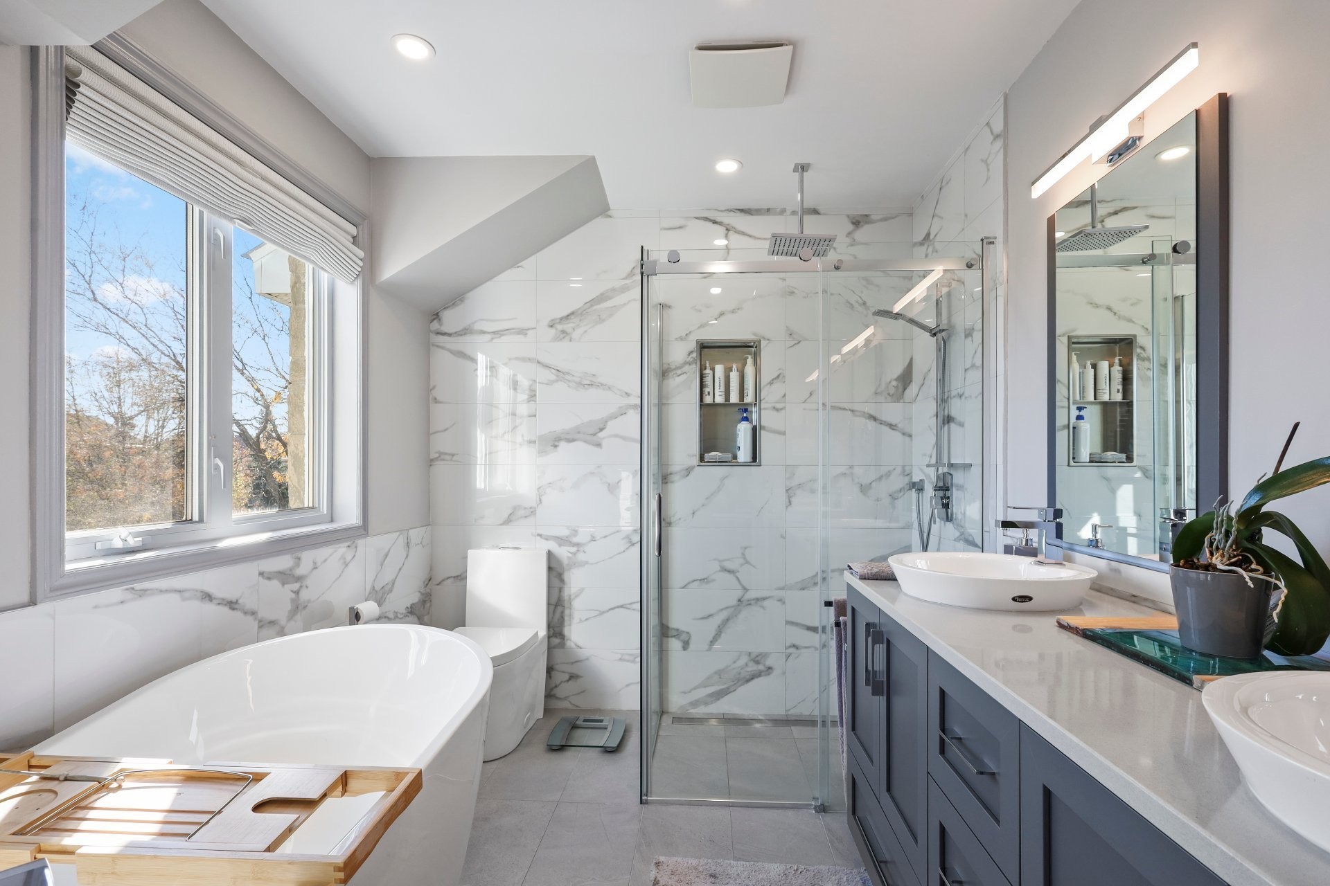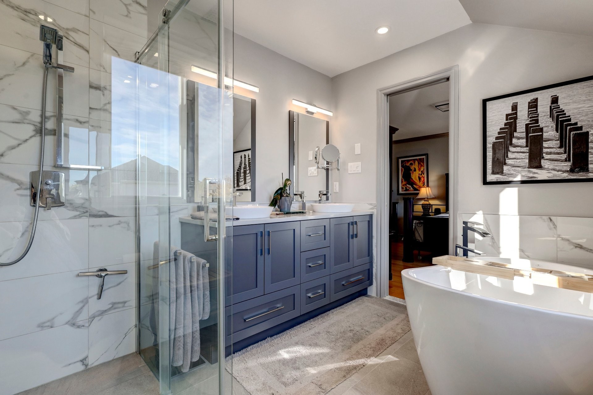 Upstairs, you'll find four generously sized bedrooms, all with hardwood flooring. One bedroom is uniquely situated on its own split level, offering added privacy. The generous primary suite includes a spa-like ensuite with a freestanding soaker tub, separate glass shower, and sleek quartz vanity.