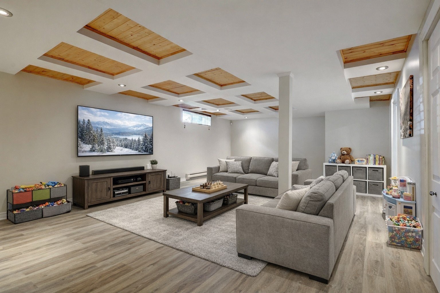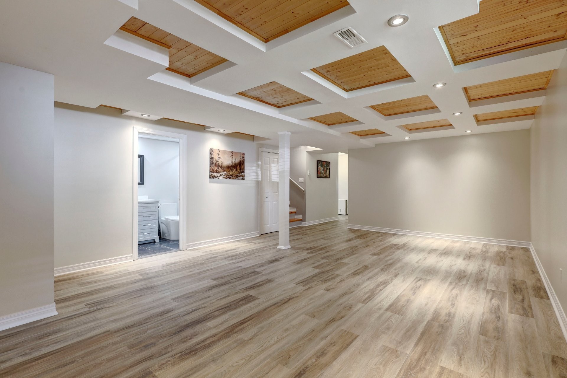 The finished basement adds valuable living space with a large playroom enhanced by coffered ceilings and pot lights, two additional bedrooms, and a full bathroom--ideal for guests, extended family, or a home office setup.