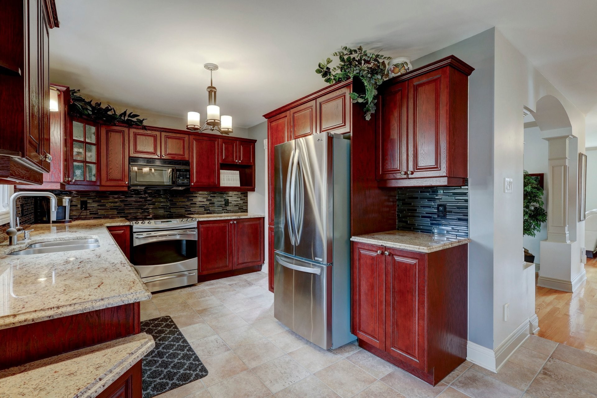 Step inside to a bright formal living room with gleaming hardwood floors, flowing seamlessly into the elegant dining area. The chef's kitchen is fully equipped with granite counters and a stylish ceramic backsplash, open to a spacious dinette with patio doors leading to a large deck, covered pergola, and peaceful views of the bike path and lush green space.