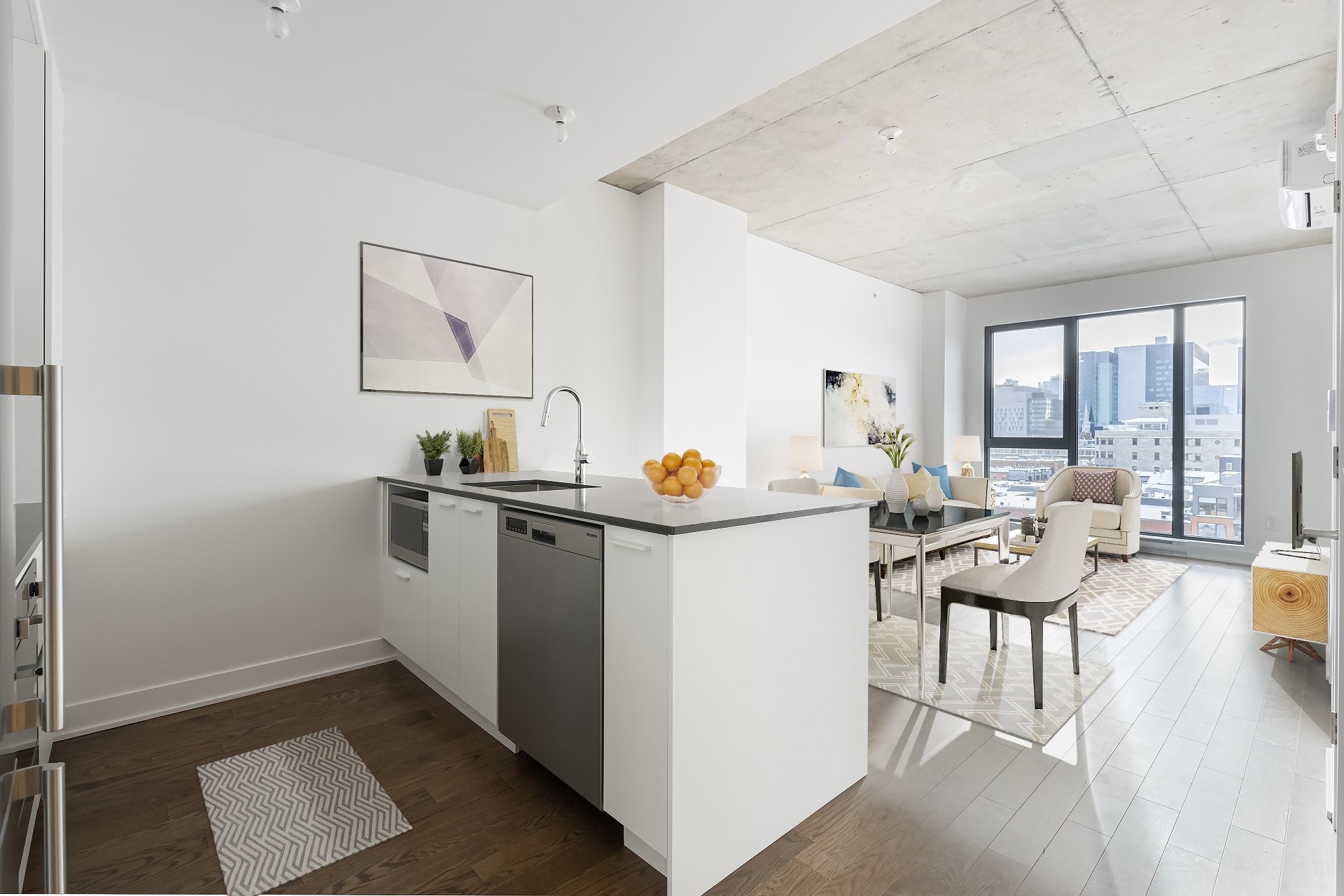 Unité de coin partiellement meublé moderne au YUL avec 2 chambres, 1 salle de bain et espace lumineux à aire ouverte. Fenêtres pleine hauteu...
