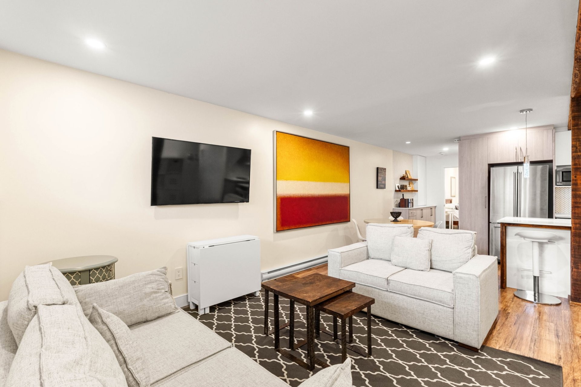 Available for immediate occupancy - Fully furnished 4½ basement unit in a triplex, steps from the REM in St-Laurent! This spacious unit features two large bedrooms and a full bathroom with heated floors. The modern kitchen with island is perfect for cooking and entertaining. Enjoy your private terrace at the entrance, providing outdoor space right at your doorstep. Bright, open living spaces, stylish finishes, and move-in ready in a prime location.