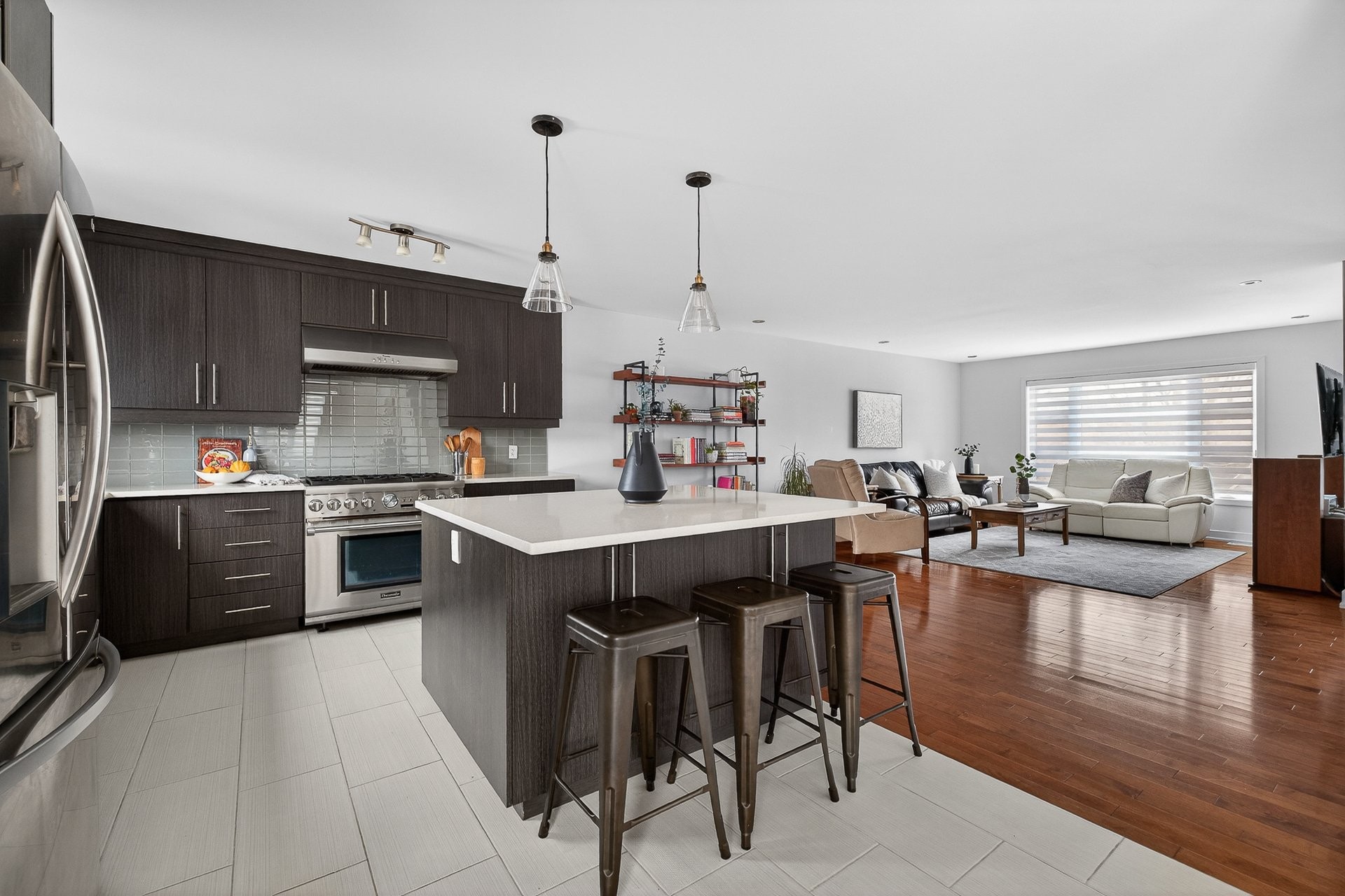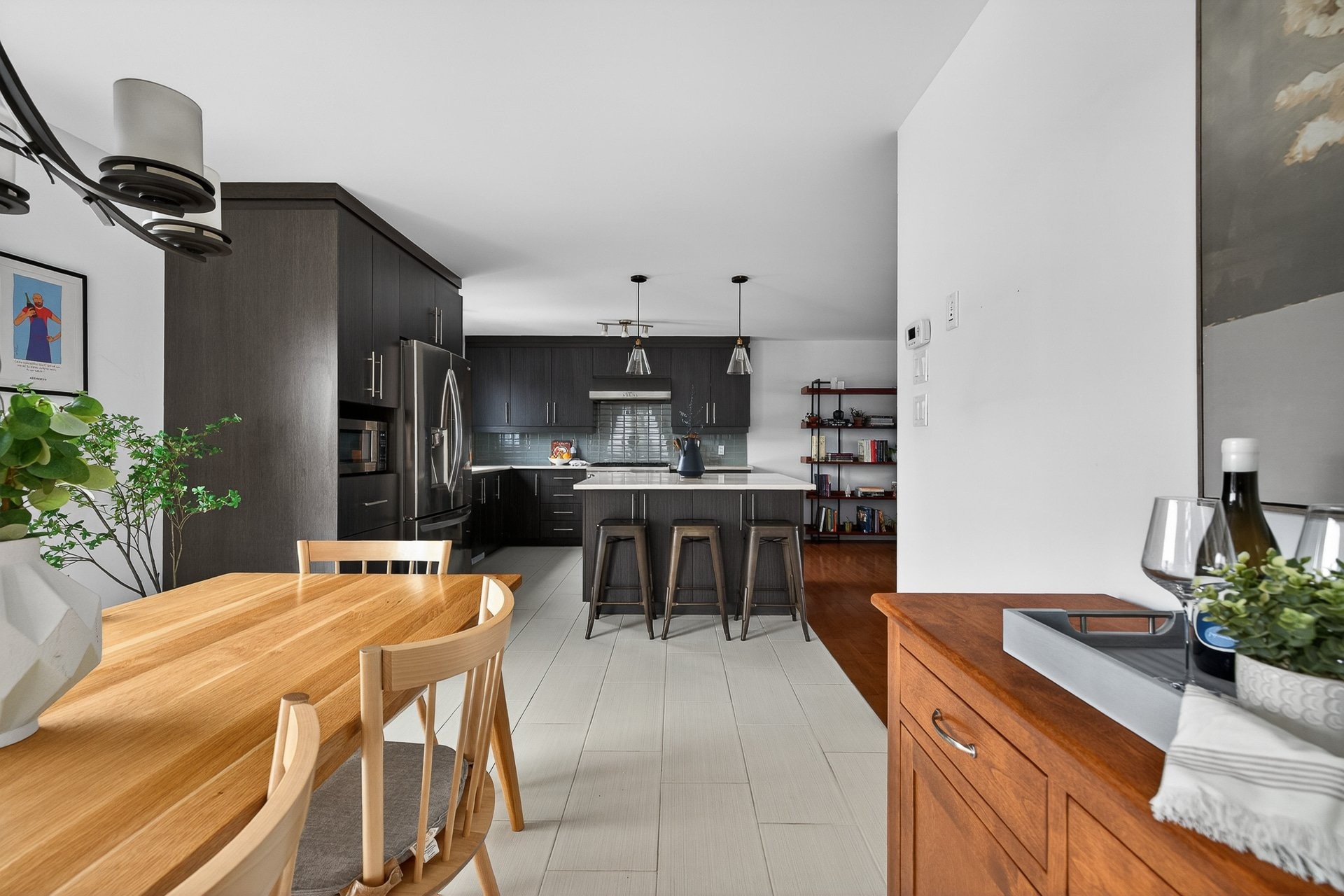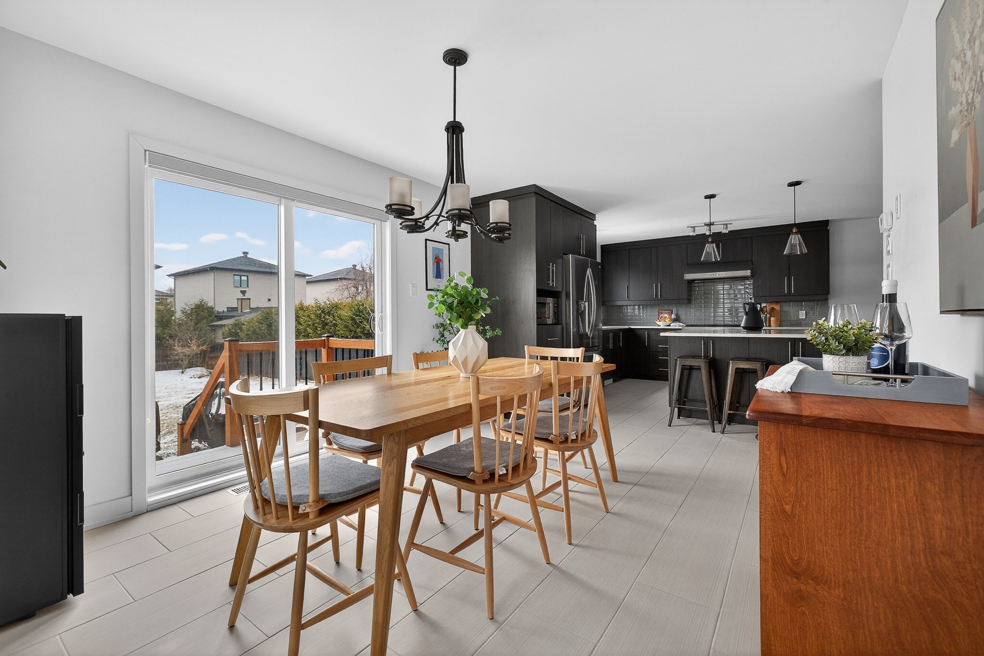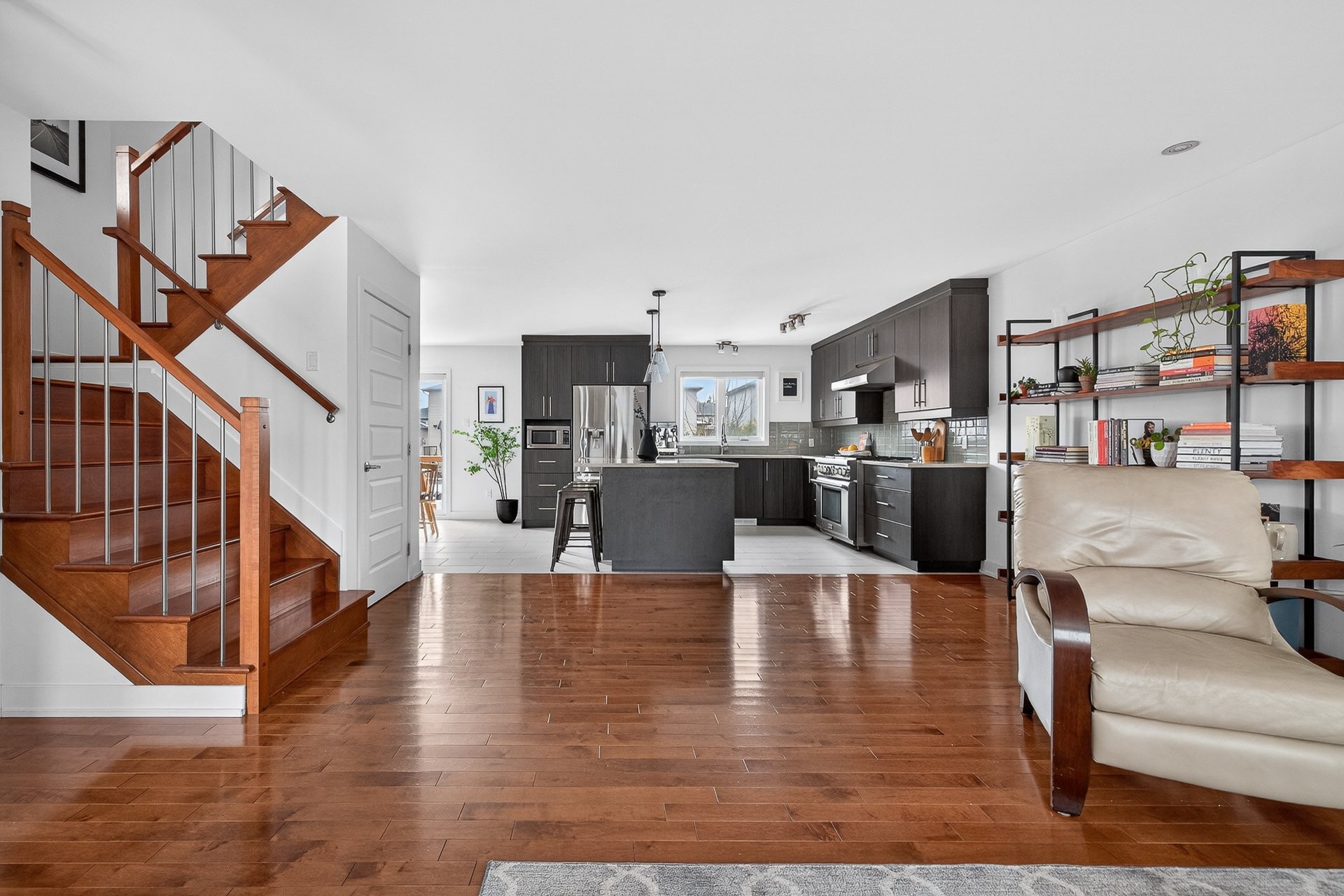 Stunning two-story home offering space, light, and comfort for the whole family! From the moment you enter, a foyer with beautiful French doors floods the space with natural light. The main floor features an open and inviting living area: a spacious, light-filled living room, a corner kitchen with floor-to-ceiling cabinetry, an elegant ceramic backsplash, and an impressive central island that seats three, all opening onto a dining room with patio doors leading to the backyard. A powder room completes this level.