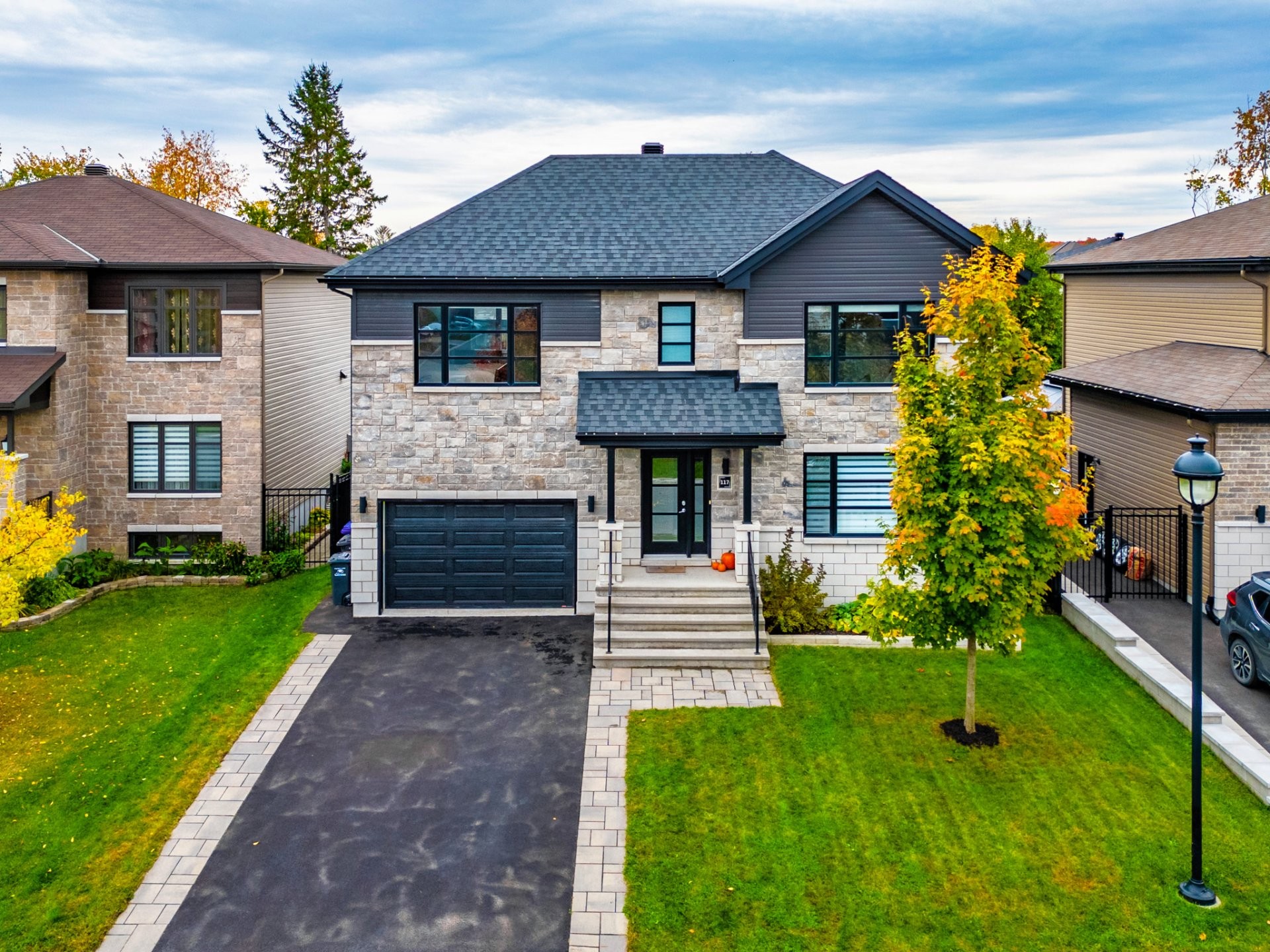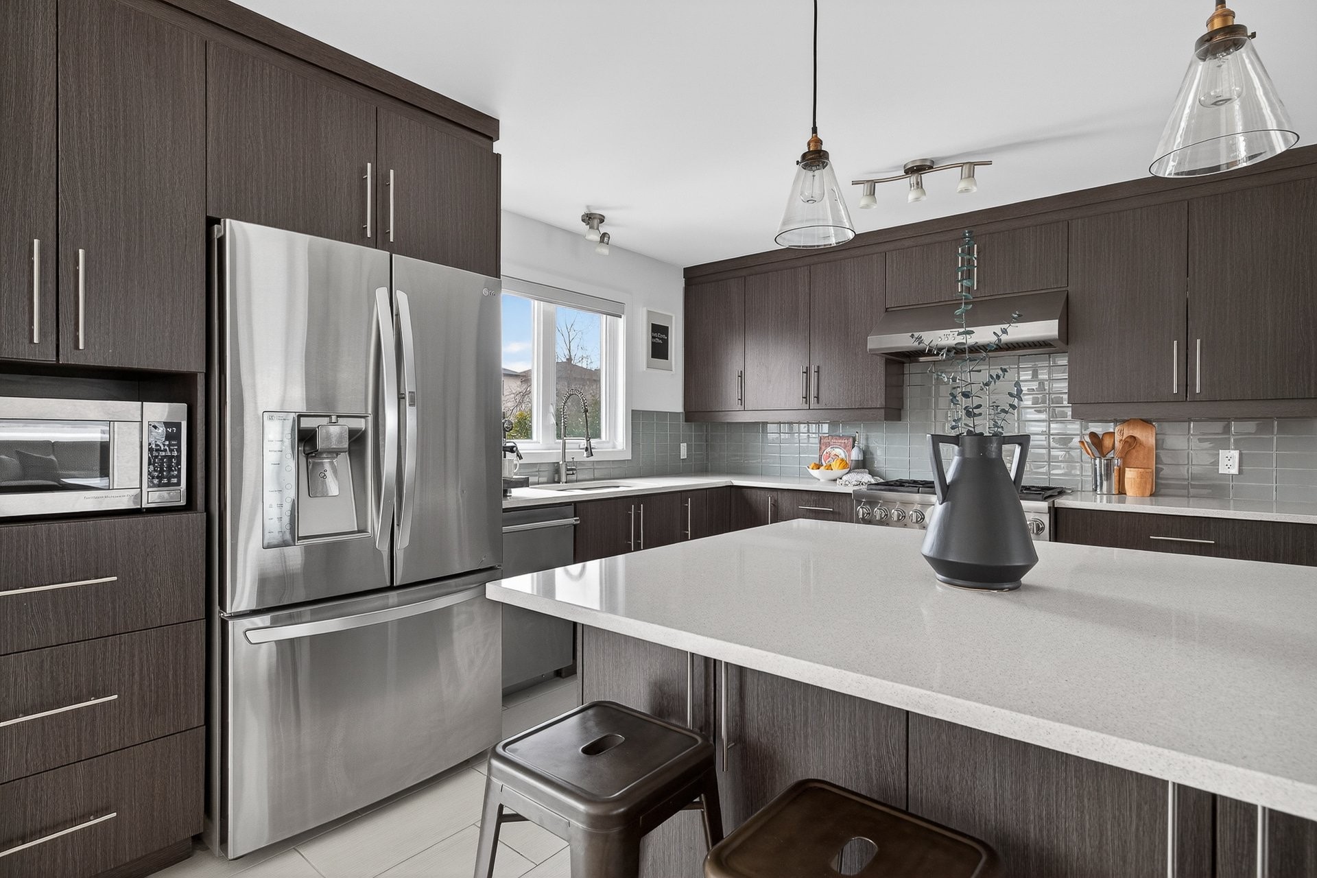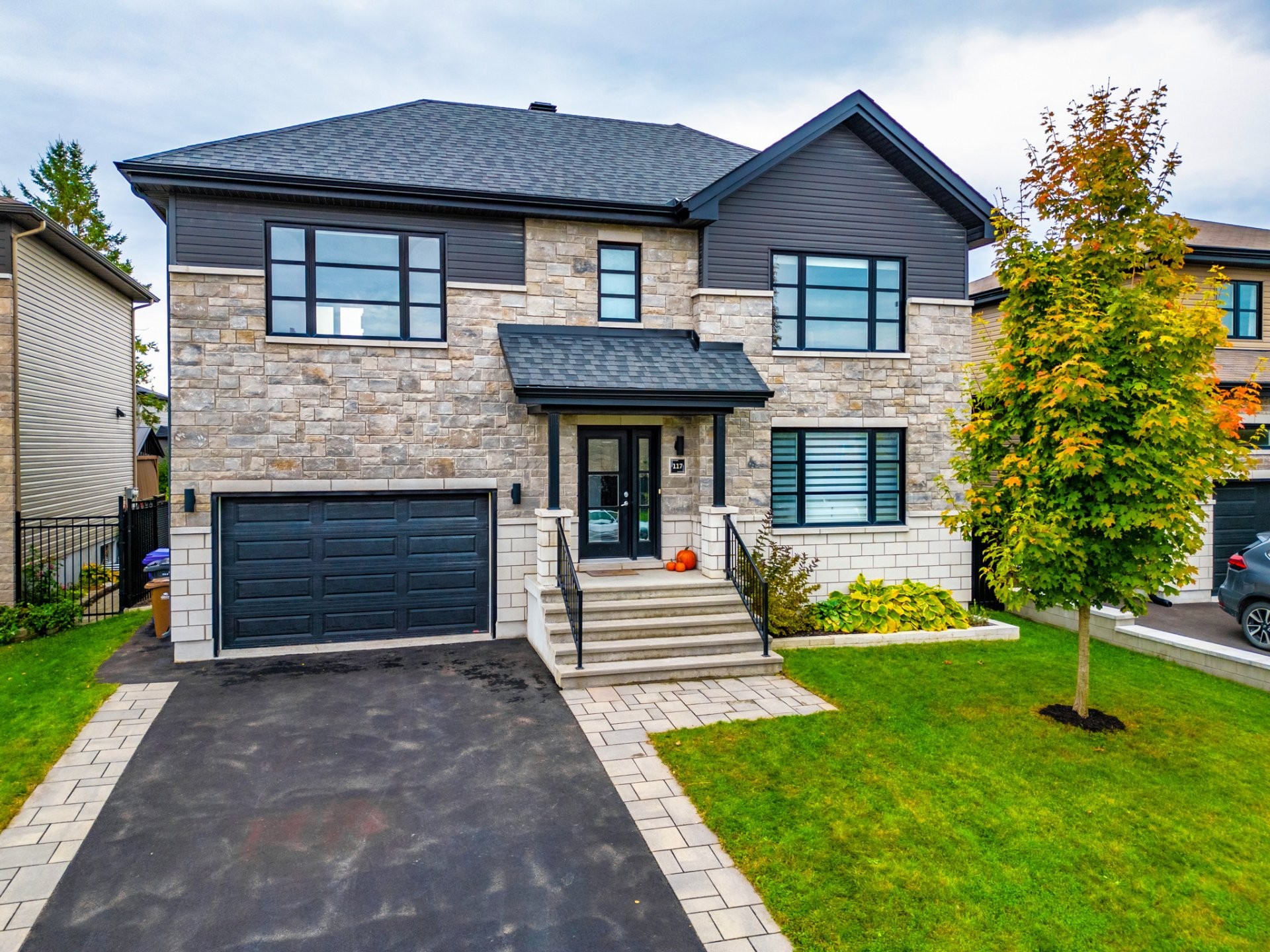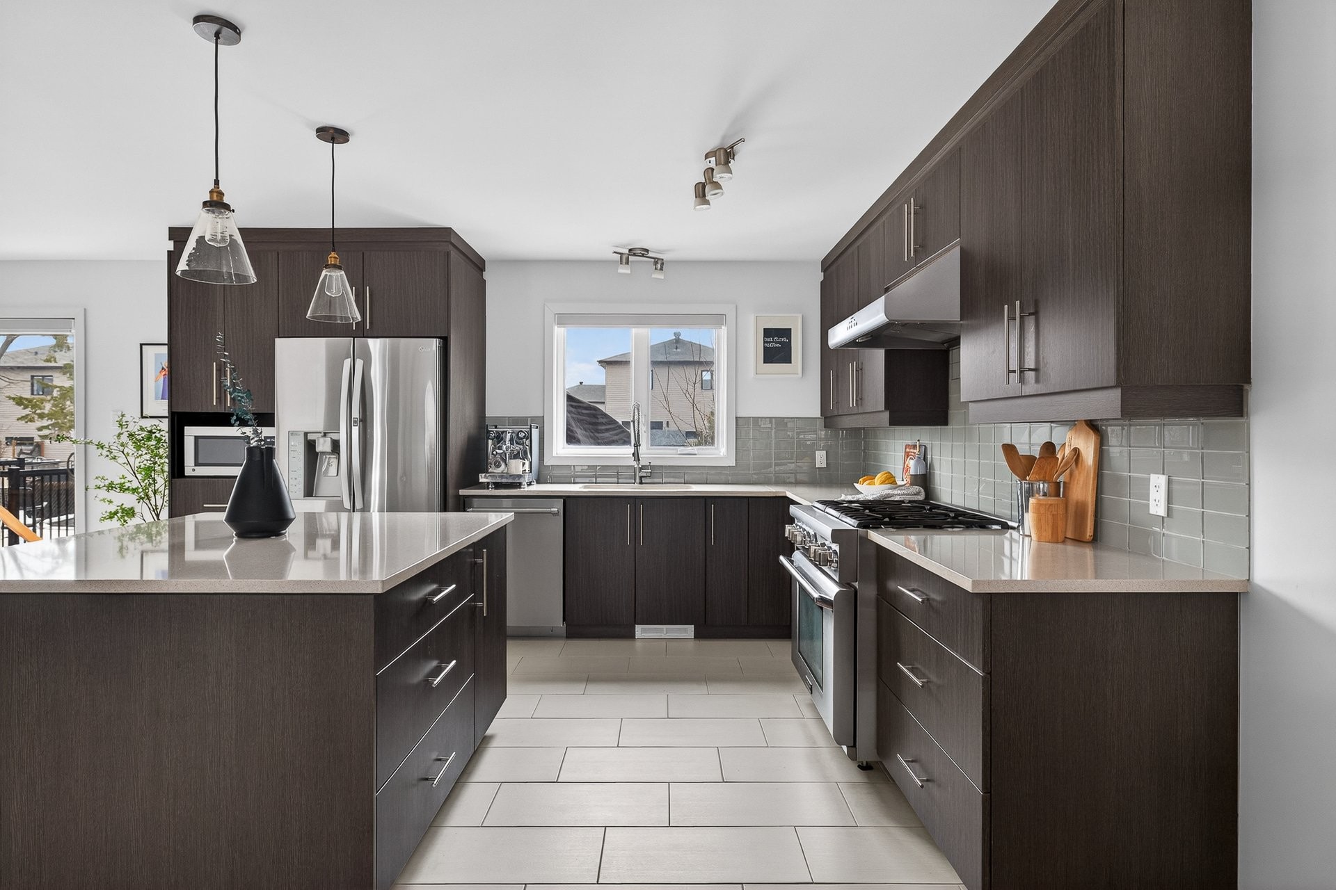 Stunning two-story home offering space, light, and comfort for the whole family! From the moment you enter, a foyer with beautiful French doors floods the space with natural light. The main floor features an open and inviting living area: a spacious, light-filled living room, a corner kitchen with floor-to-ceiling cabinetry, an elegant ceramic backsplash, and an impressive central island that seats three, all opening onto a dining room with patio doors leading to the backyard. A powder room completes this level.