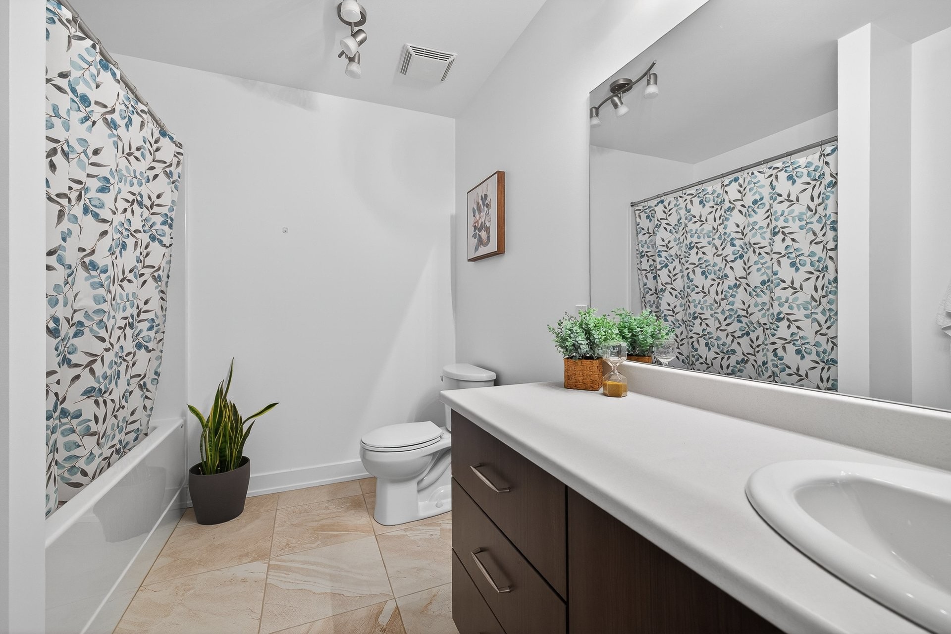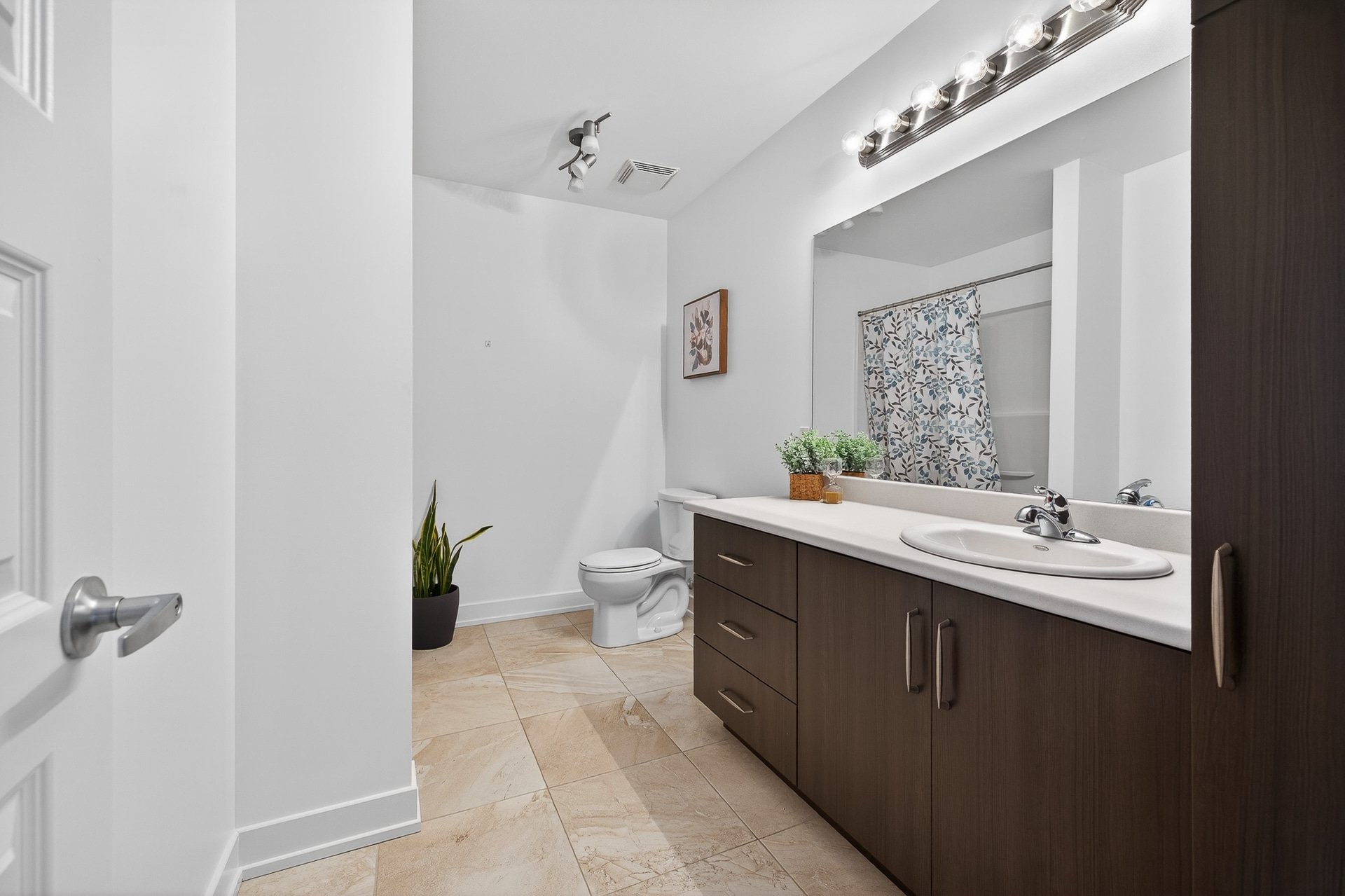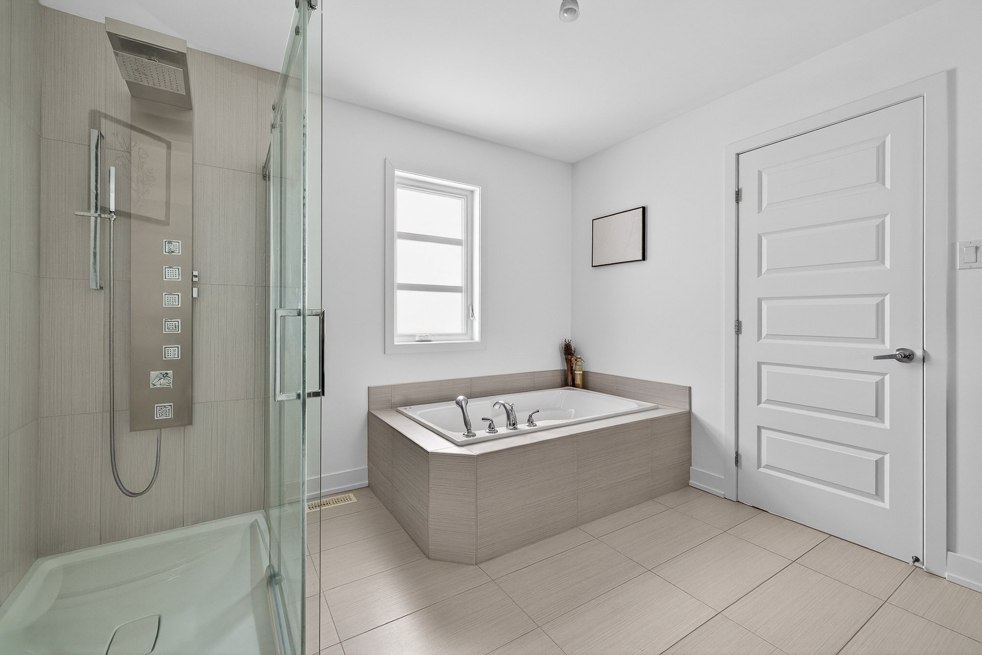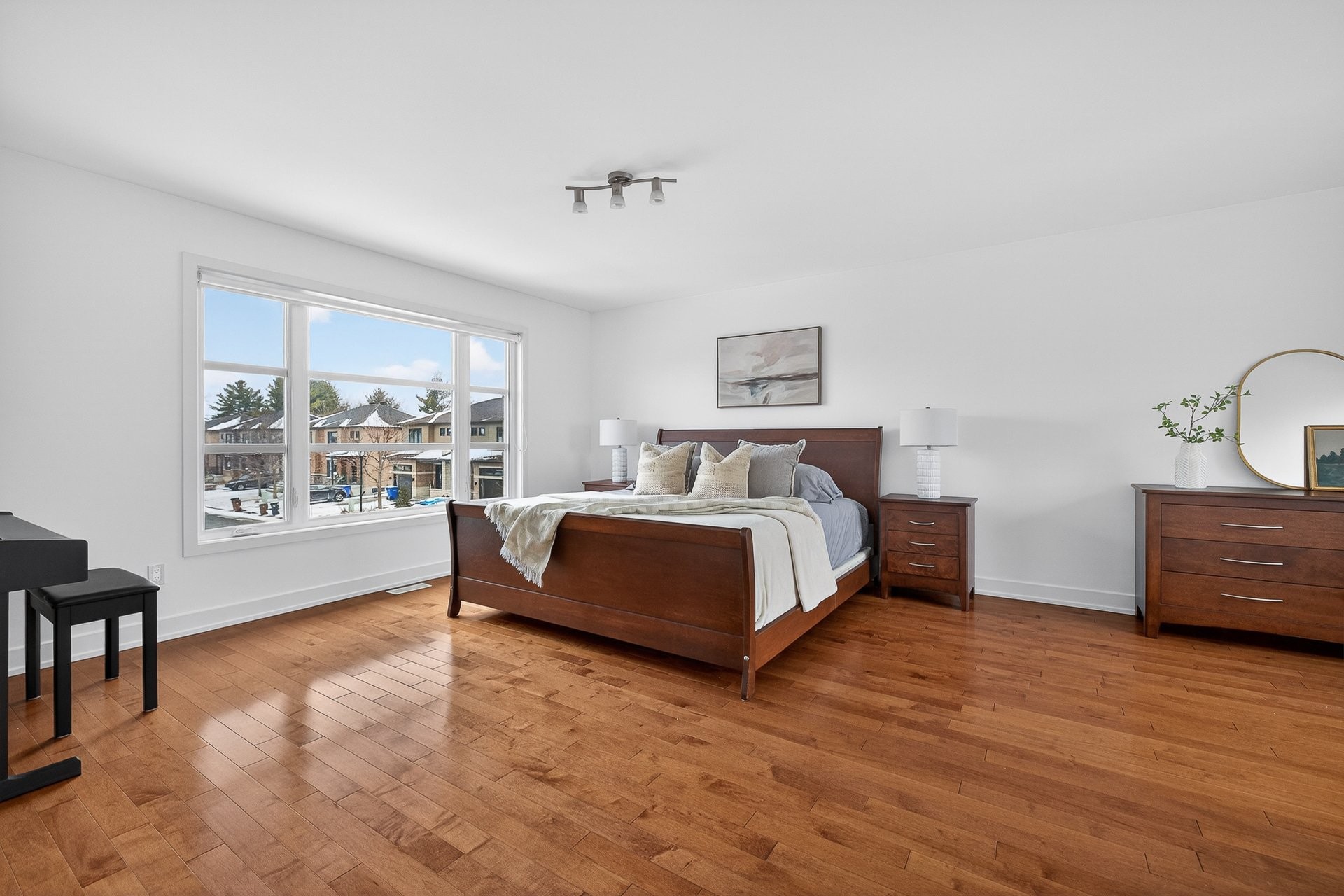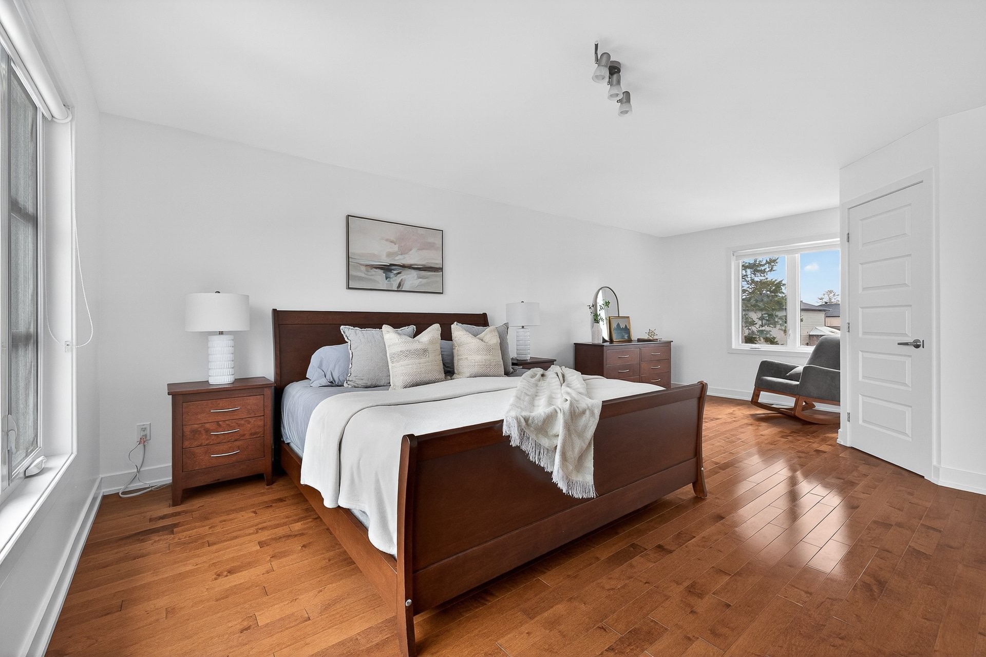 Upstairs, you'll find four generously sized bedrooms, including a spacious master bedroom with a sitting area and an ensuite bathroom featuring a glass shower, a soaker tub, and a large vanity with ample counter space. A second bathroom with a shower-tub combination and a convenient vanity completes this level.