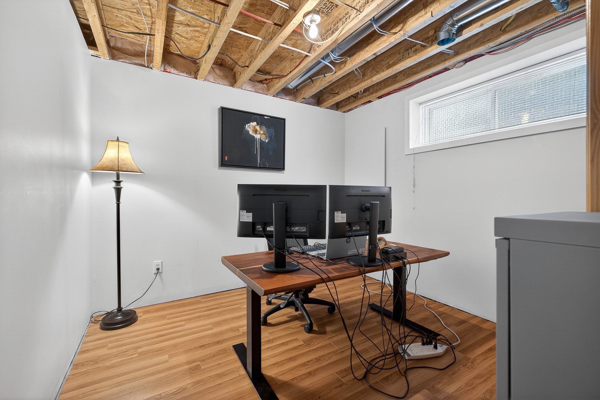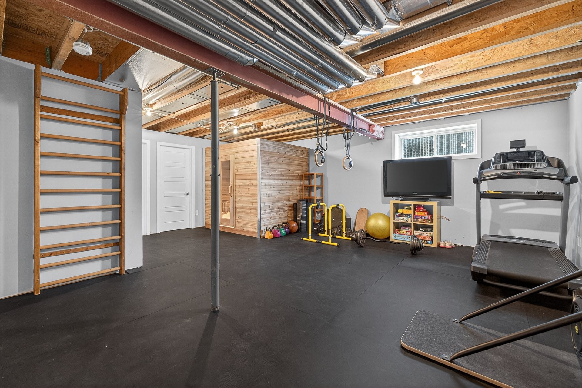 The basement, currently used as a gym, offers great versatility with a family room, an additional bedroom, and a laundry room.