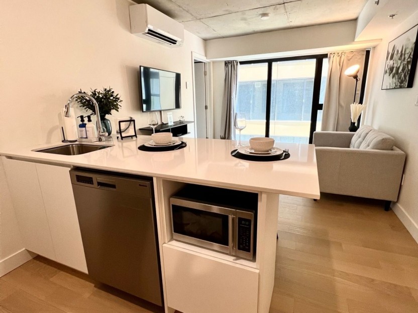 Unité de coin partiellement meublé moderne au YUL avec 2 chambres, 1 salle de bain et espace lumineux à aire ouverte. Fenêtres pleine hauteu...