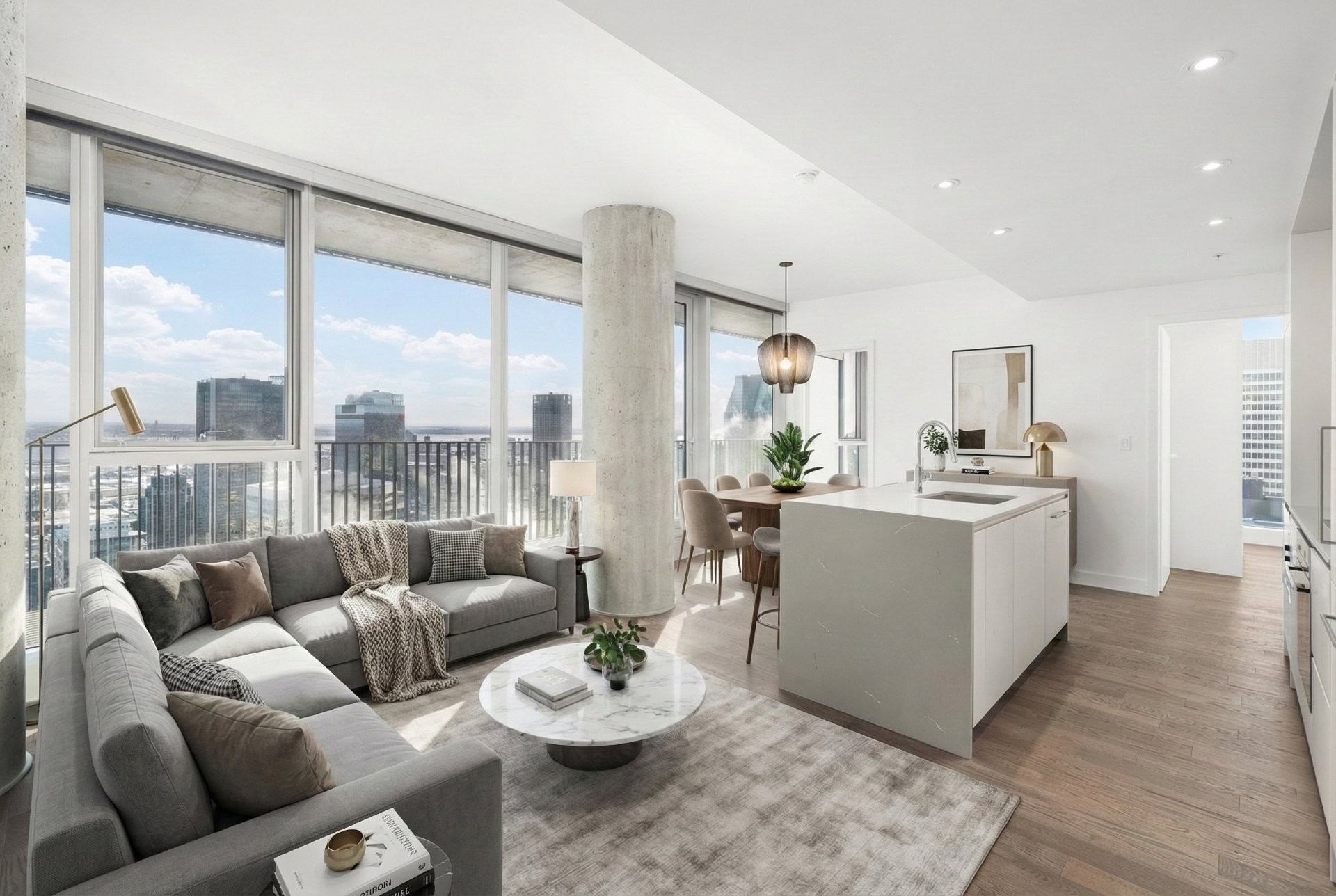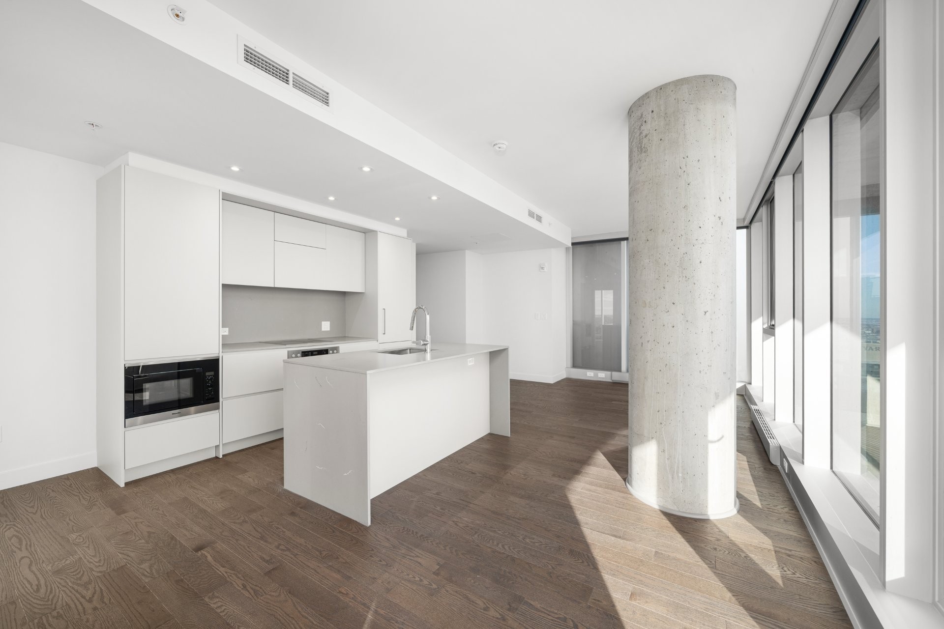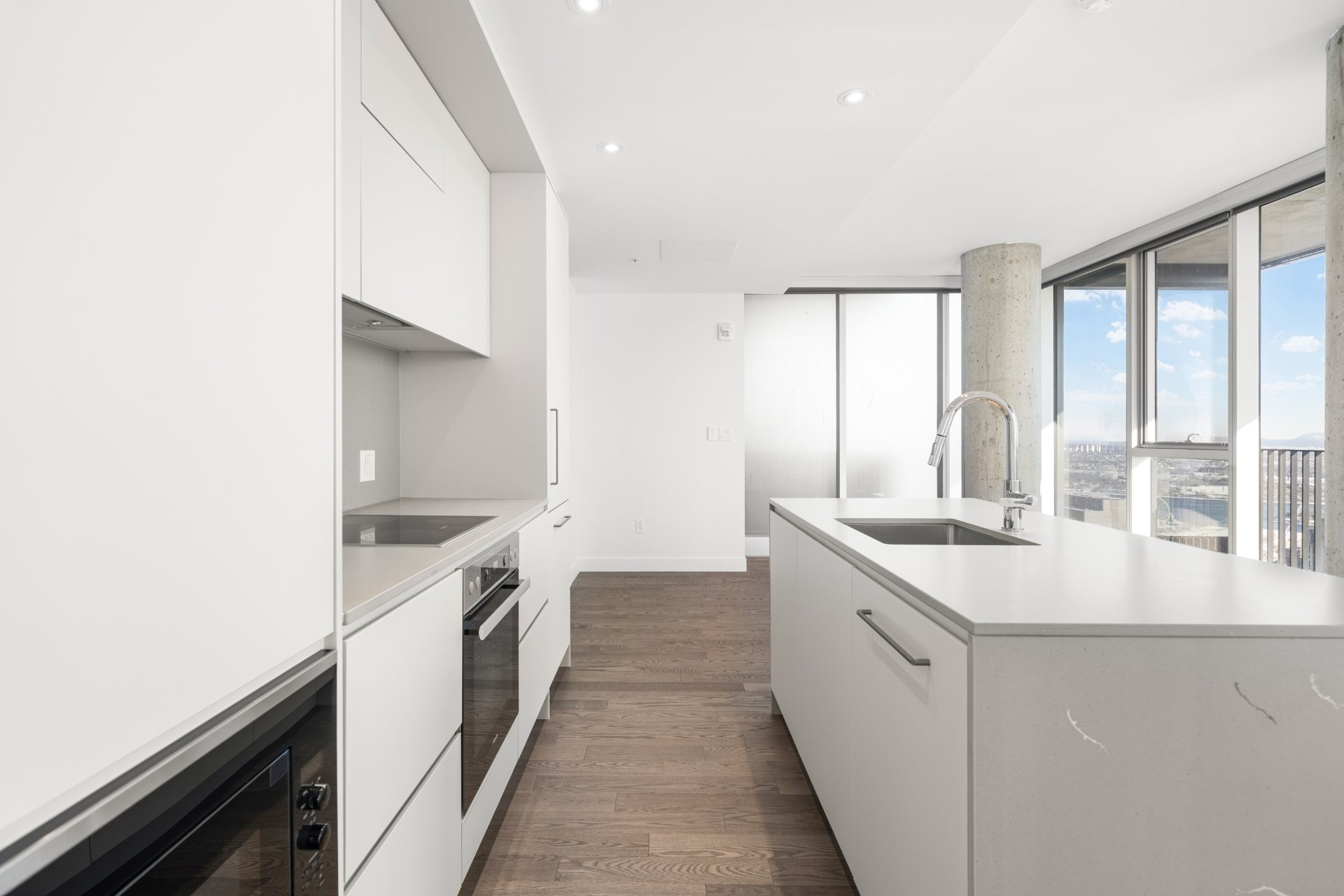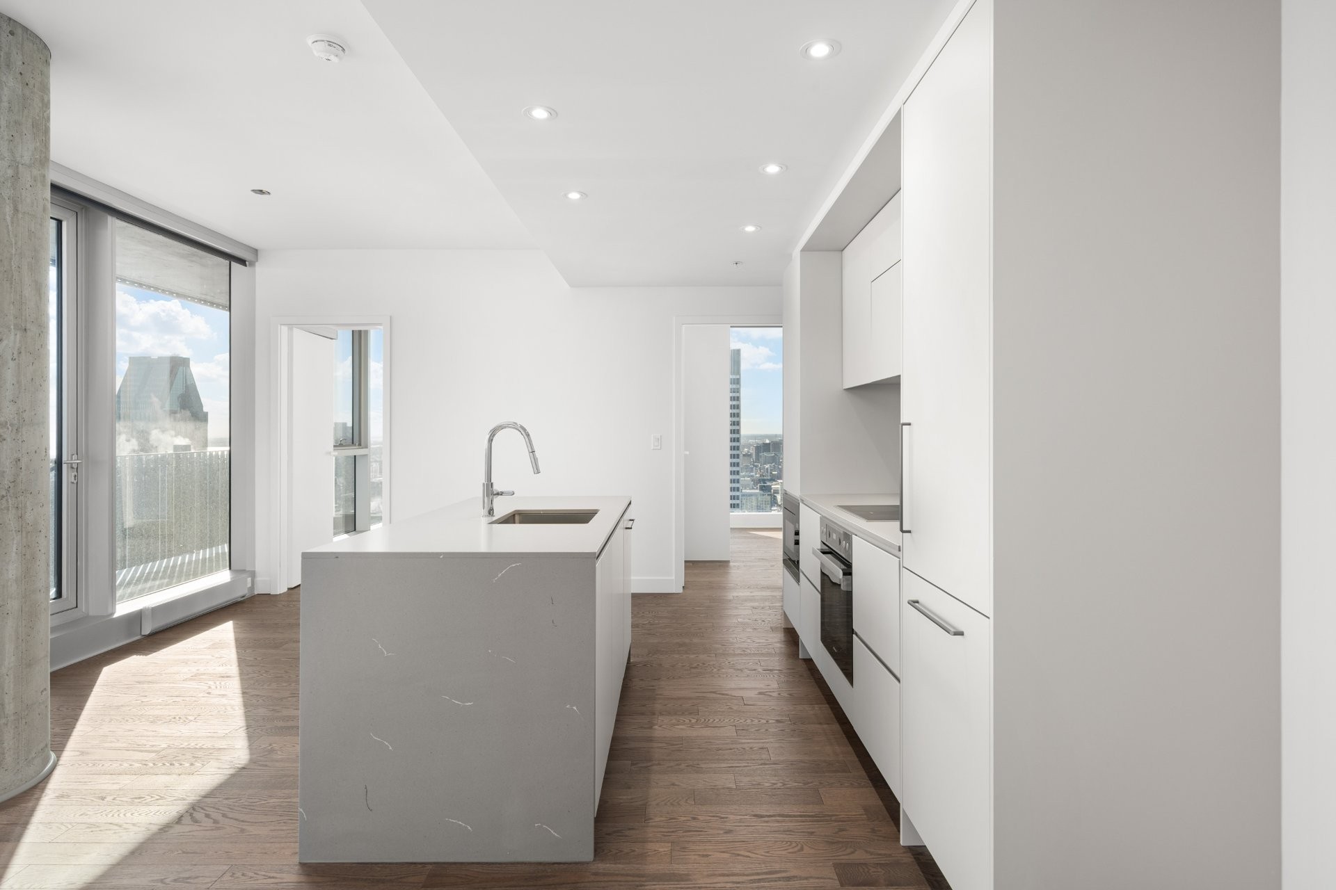Designed by renowned architect Anik Shooner, senior partner at MSDL Architectes, this condo embodies modern elegance with high ceilings and floor-to-ceiling windows that frame breathtaking panoramic views of the city. Sleek, modern kitchen equipped with top-of-the-line Miele appliances and exquisite quartz countertops.