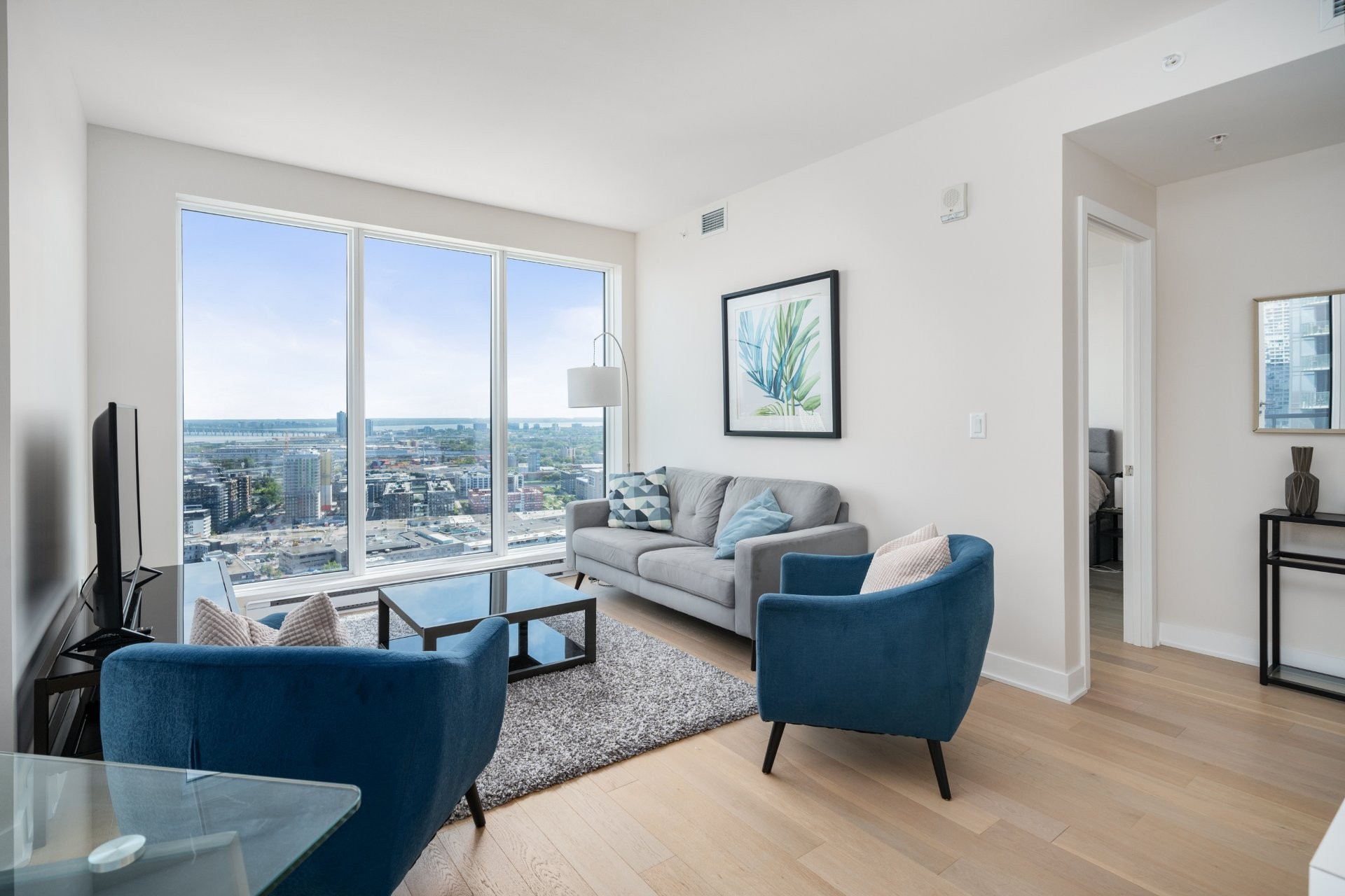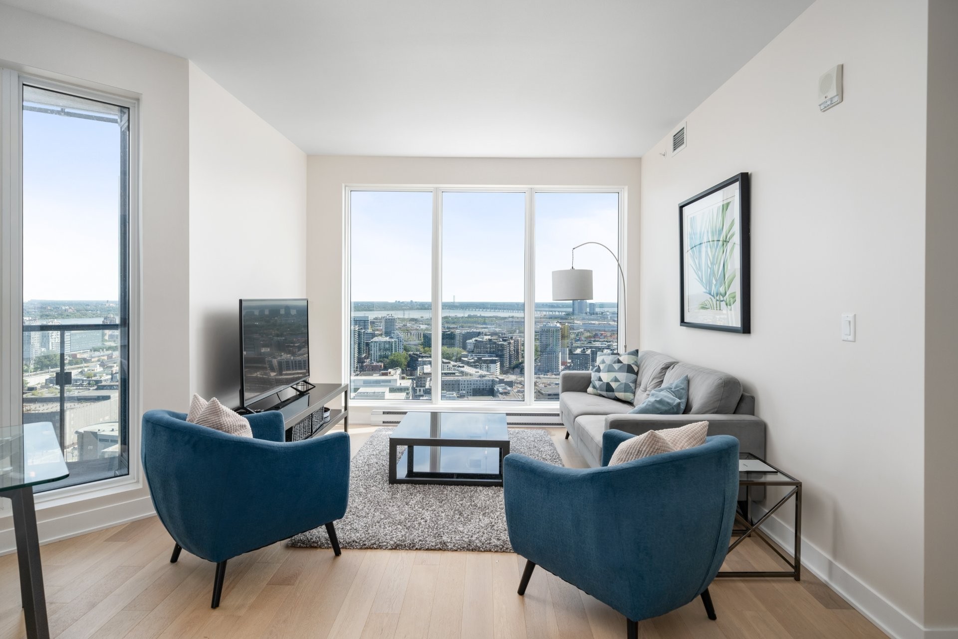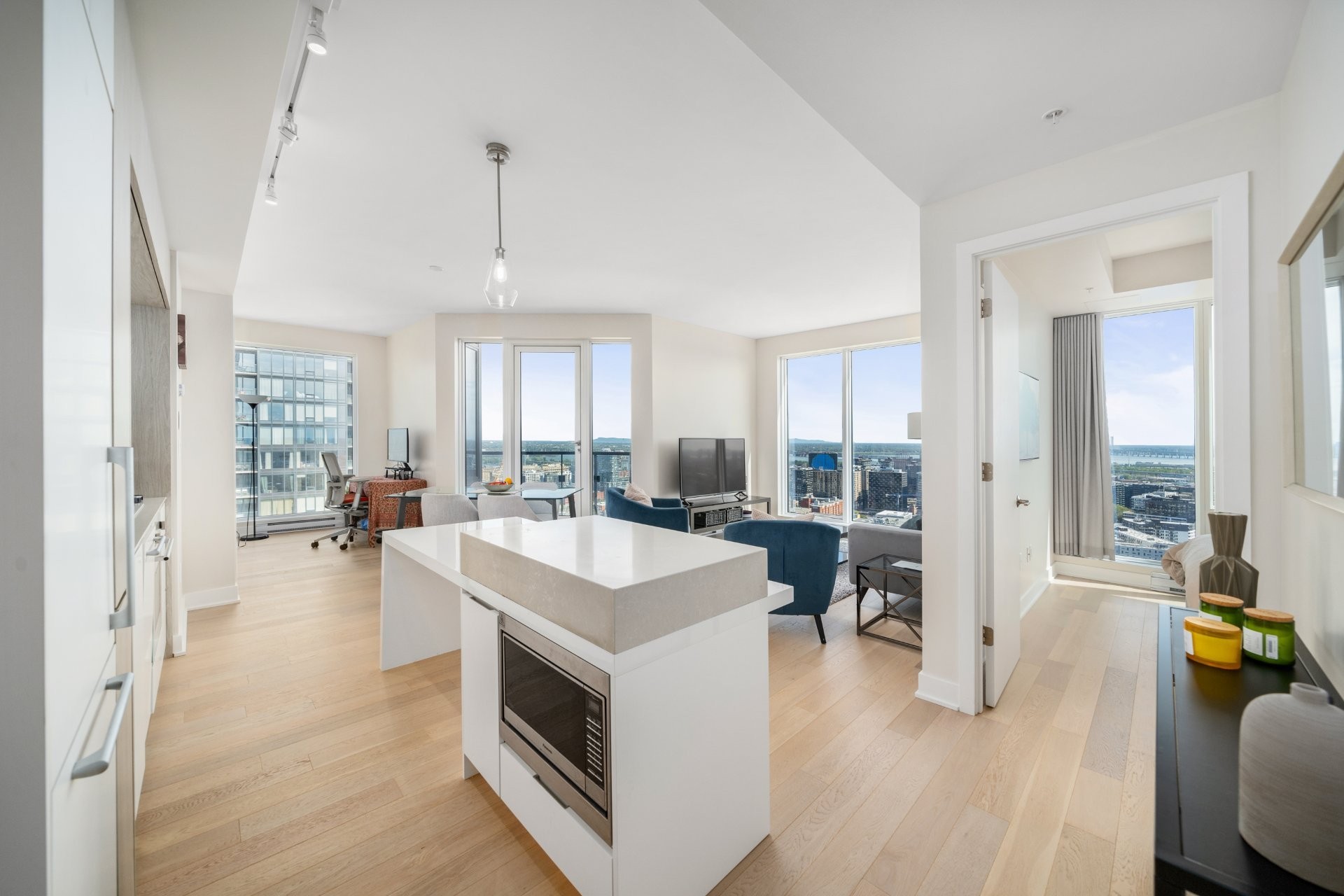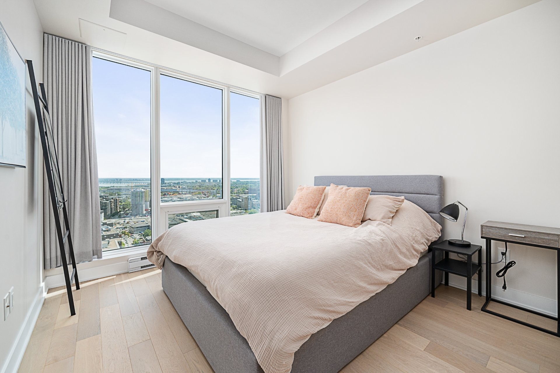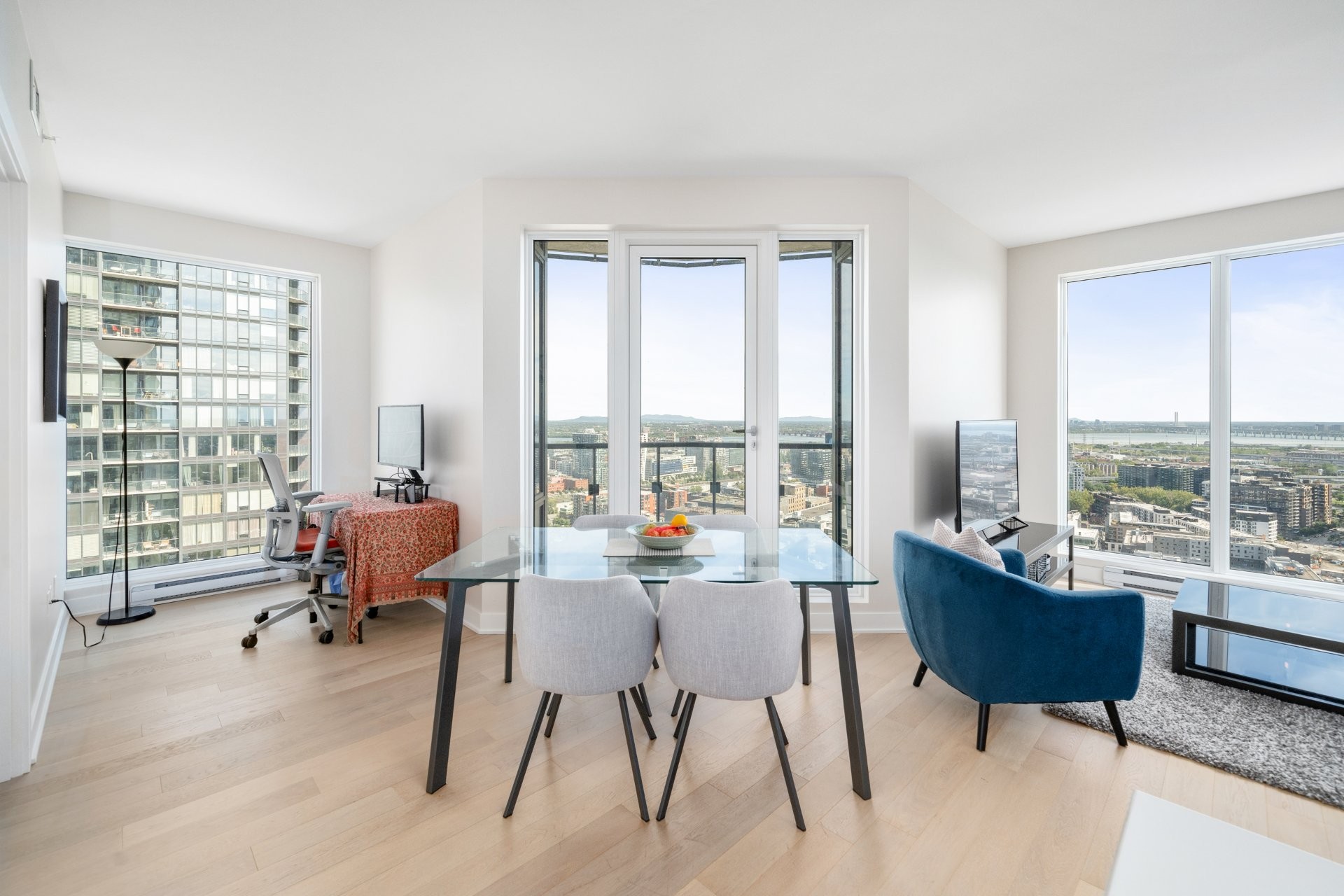 Corner unit on the 34th floor of the prestigious Tour des Canadiens, Phase 3. This fully furnished luxury apartment offers panoramic river, city and mountain views. Turnkey, with high-end finishes, 2 large bedrooms with walk-in closets and bathrooms, furnished office space, and fully equipped kitchen. Access to indoor pool, gym, sauna, spa, skylounge. 24-hour security, access to RESO network and Lucien-L'Allier and Bonaventure metro stations. No smoking, no pets allowed. Possibility of renting for less than 12 months at a higher rent.