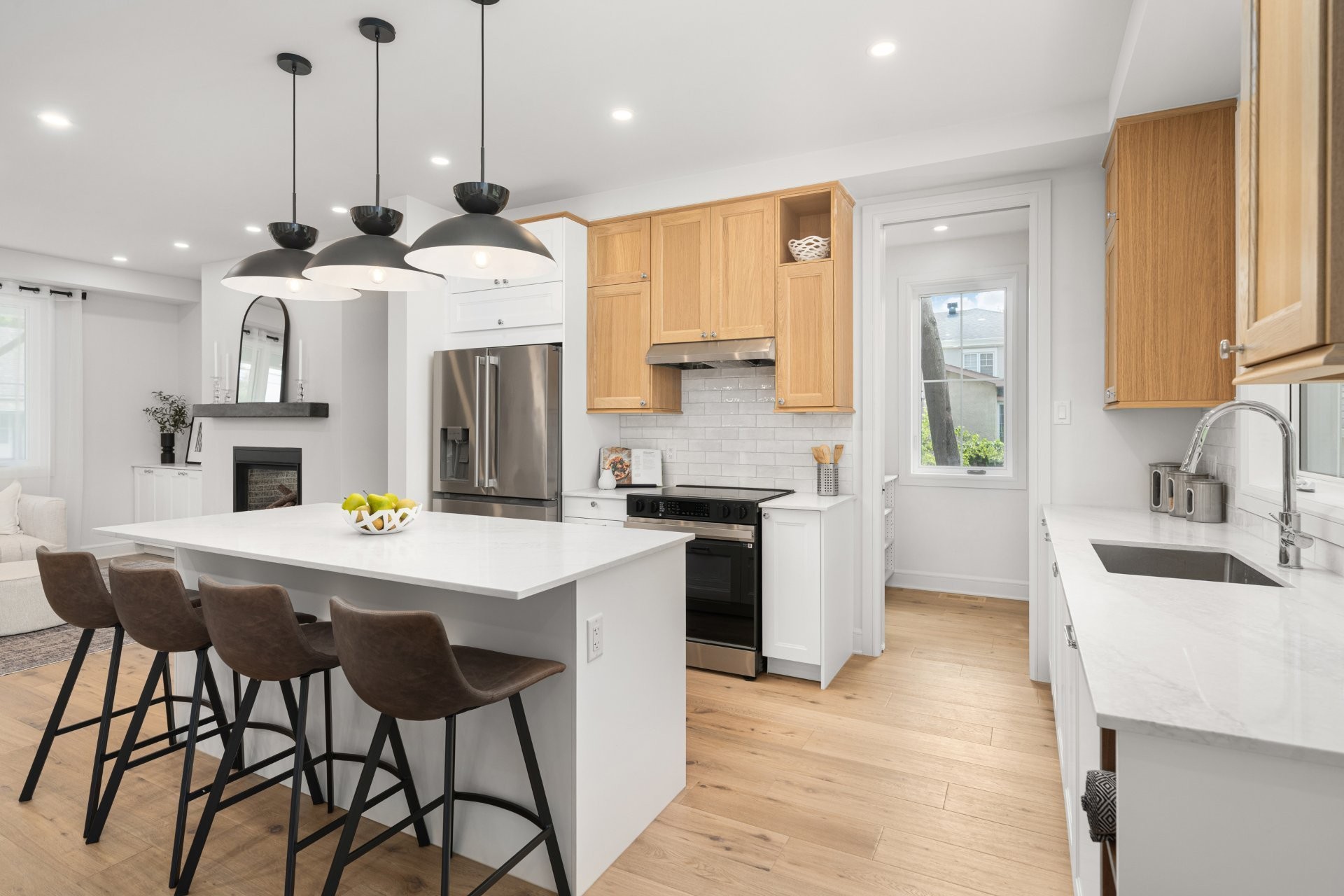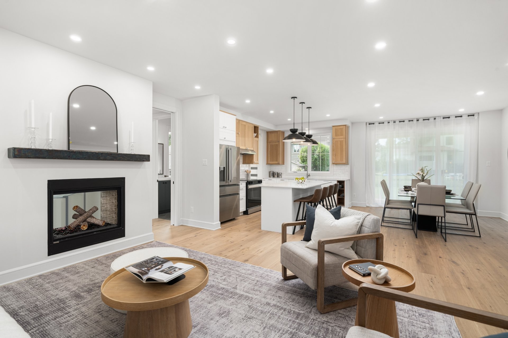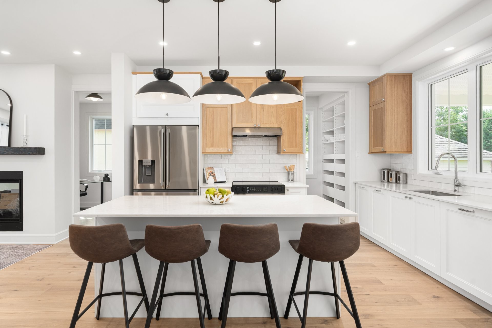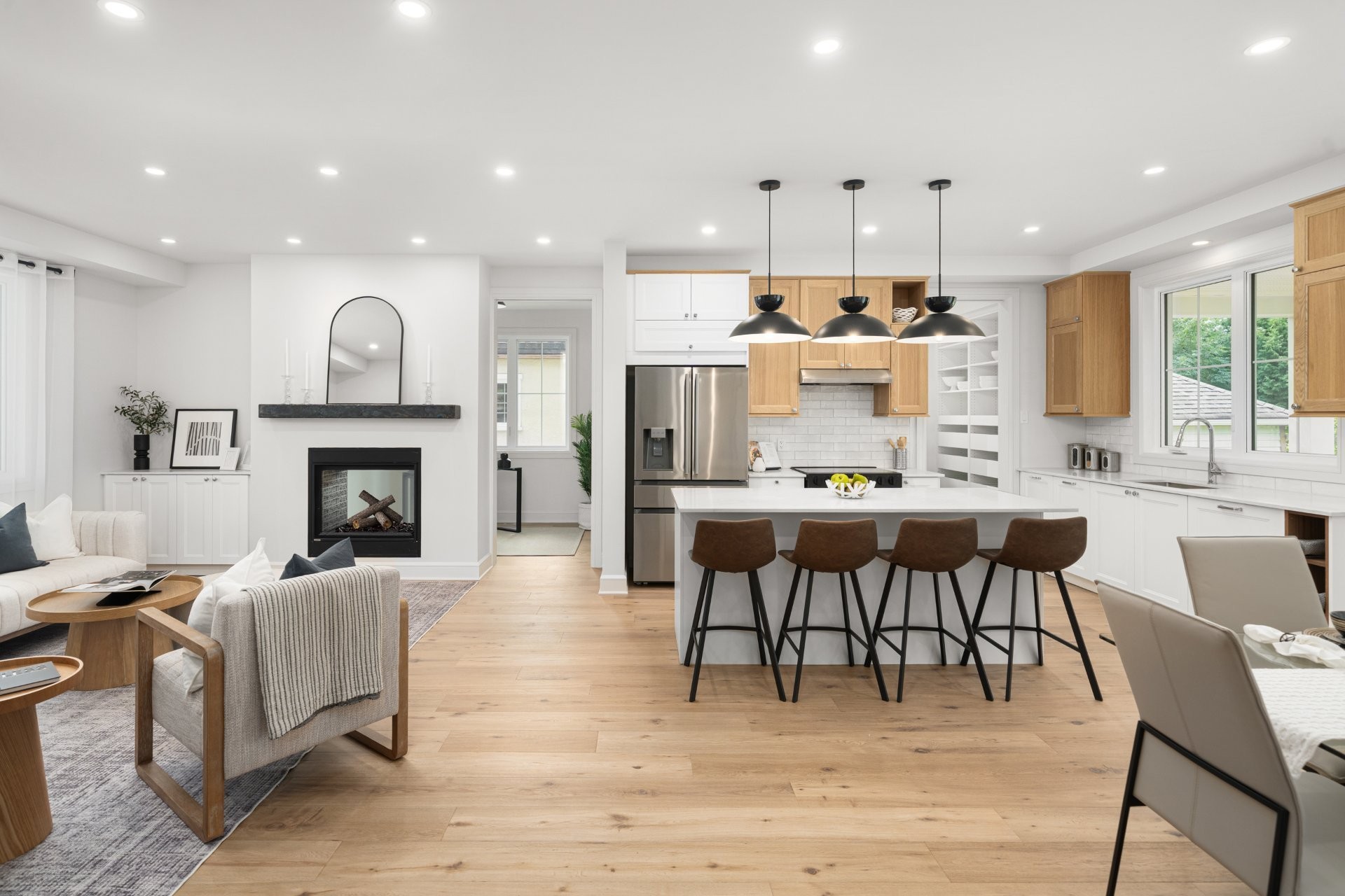 The main floor features a bright open-concept layout with wide-plank hardwood floors and premium finishes throughout. A gourmet kitchen with quartz countertops, large island, wine station, and walk-in pantry with custom built-ins opens onto the dining area and a covered wooden patio overlooking the expansive backyard. The living room, complete with a double-sided gas fireplace shared with the home office, creates a warm and inviting atmosphere. A practical mudroom with access to both the backyard and the double garage adds everyday convenience.