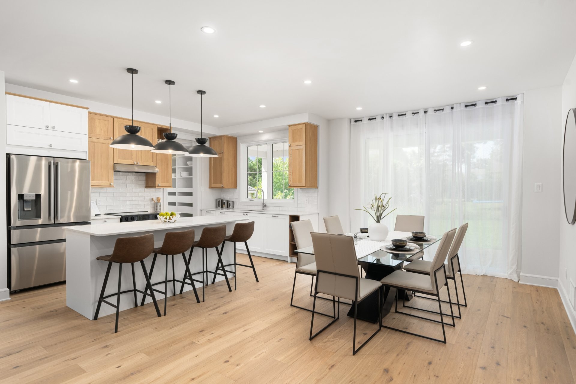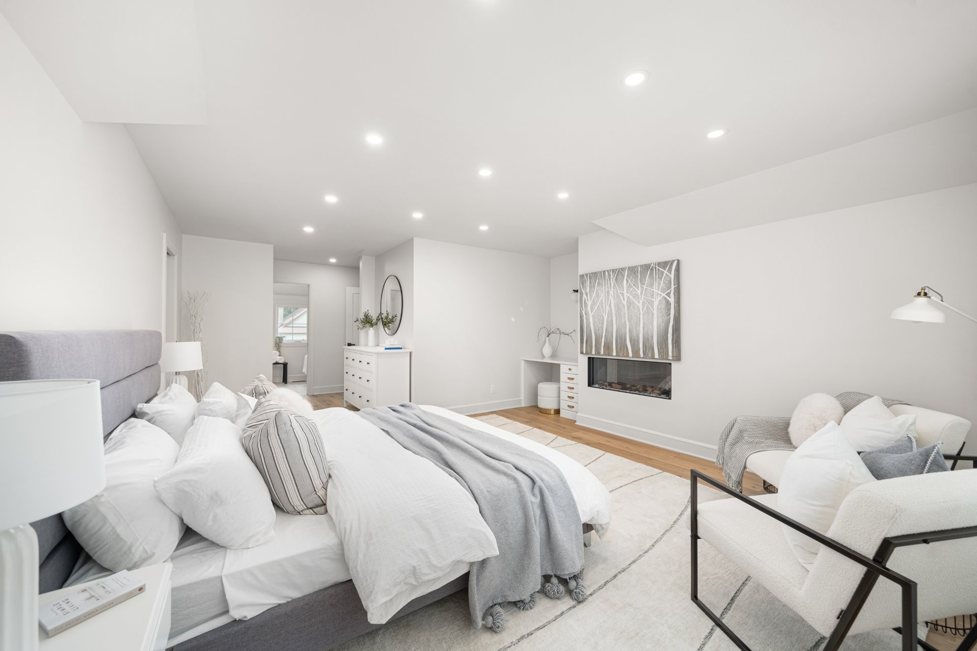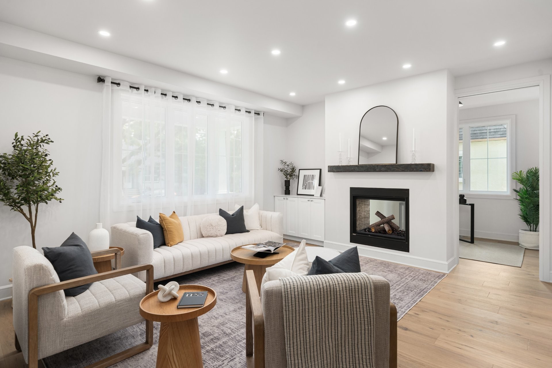 The main floor features a bright open-concept layout with wide-plank hardwood floors and premium finishes throughout. A gourmet kitchen with quartz countertops, large island, wine station, and walk-in pantry with custom built-ins opens onto the dining area and a covered wooden patio overlooking the expansive backyard. The living room, complete with a double-sided gas fireplace shared with the home office, creates a warm and inviting atmosphere. A practical mudroom with access to both the backyard and the double garage adds everyday convenience.