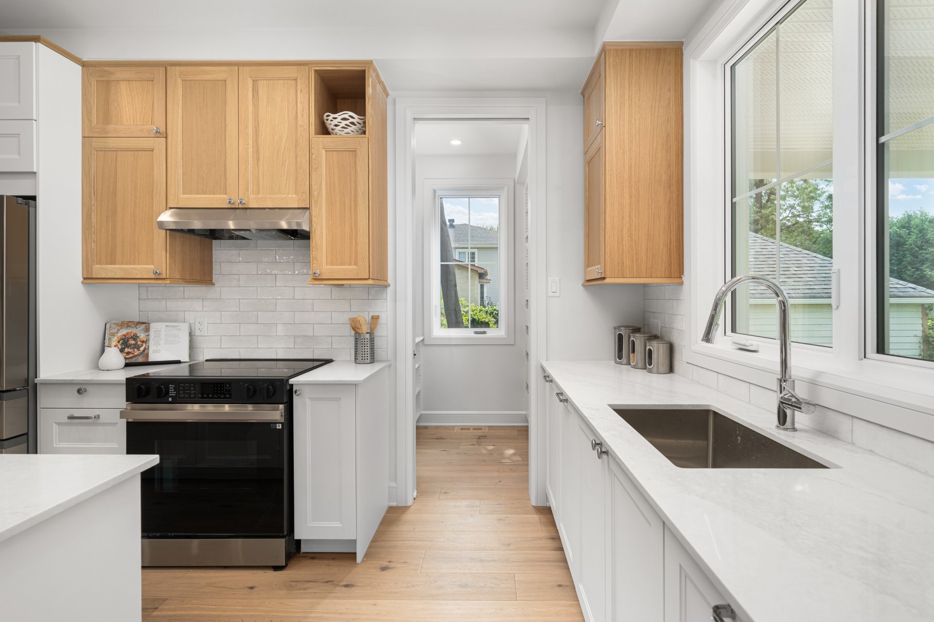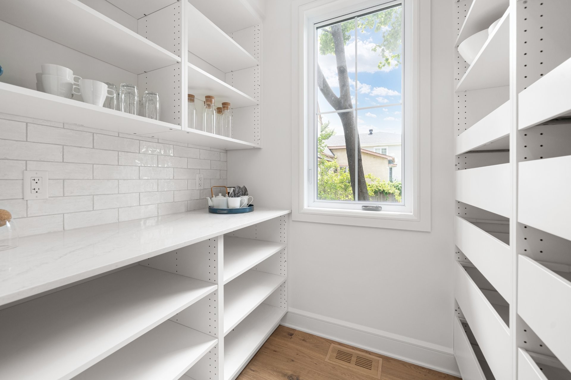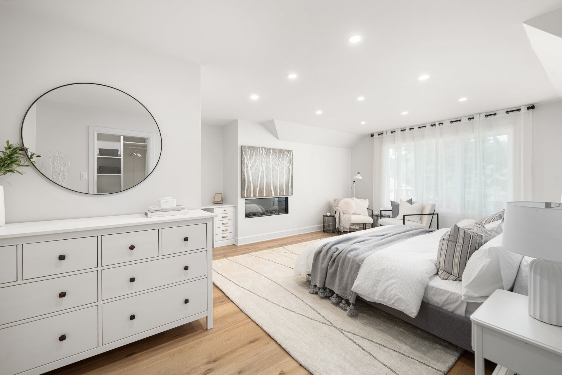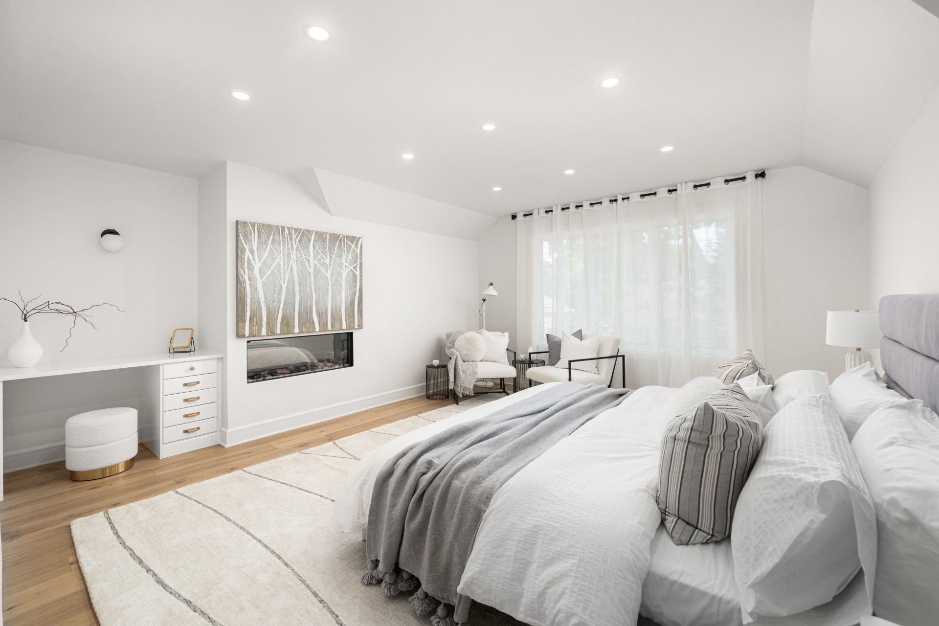 The main floor features a bright open-concept layout with wide-plank hardwood floors and premium finishes throughout. A gourmet kitchen with quartz countertops, large island, wine station, and walk-in pantry with custom built-ins opens onto the dining area and a covered wooden patio overlooking the expansive backyard. The living room, complete with a double-sided gas fireplace shared with the home office, creates a warm and inviting atmosphere. A practical mudroom with access to both the backyard and the double garage adds everyday convenience.