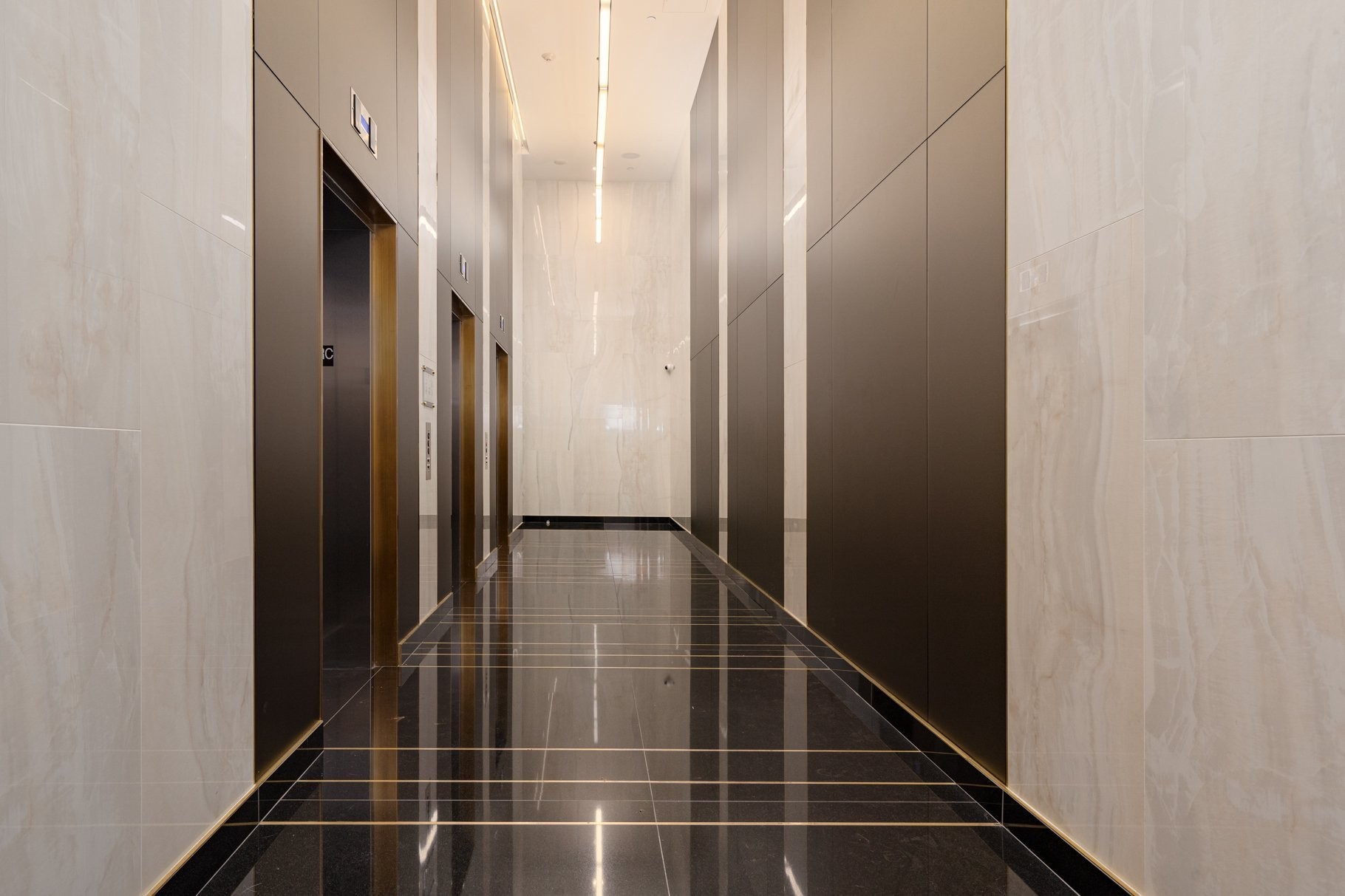 *Three high-speed elevators per tower, each with on-screen news and weather