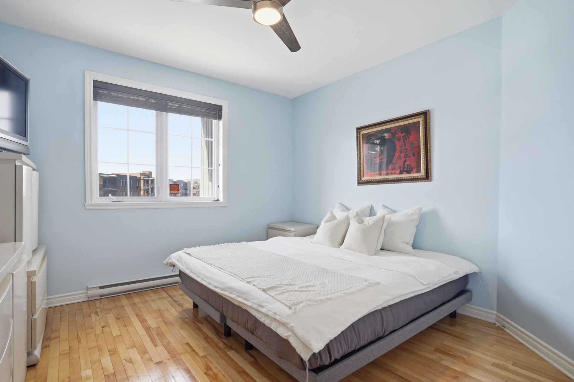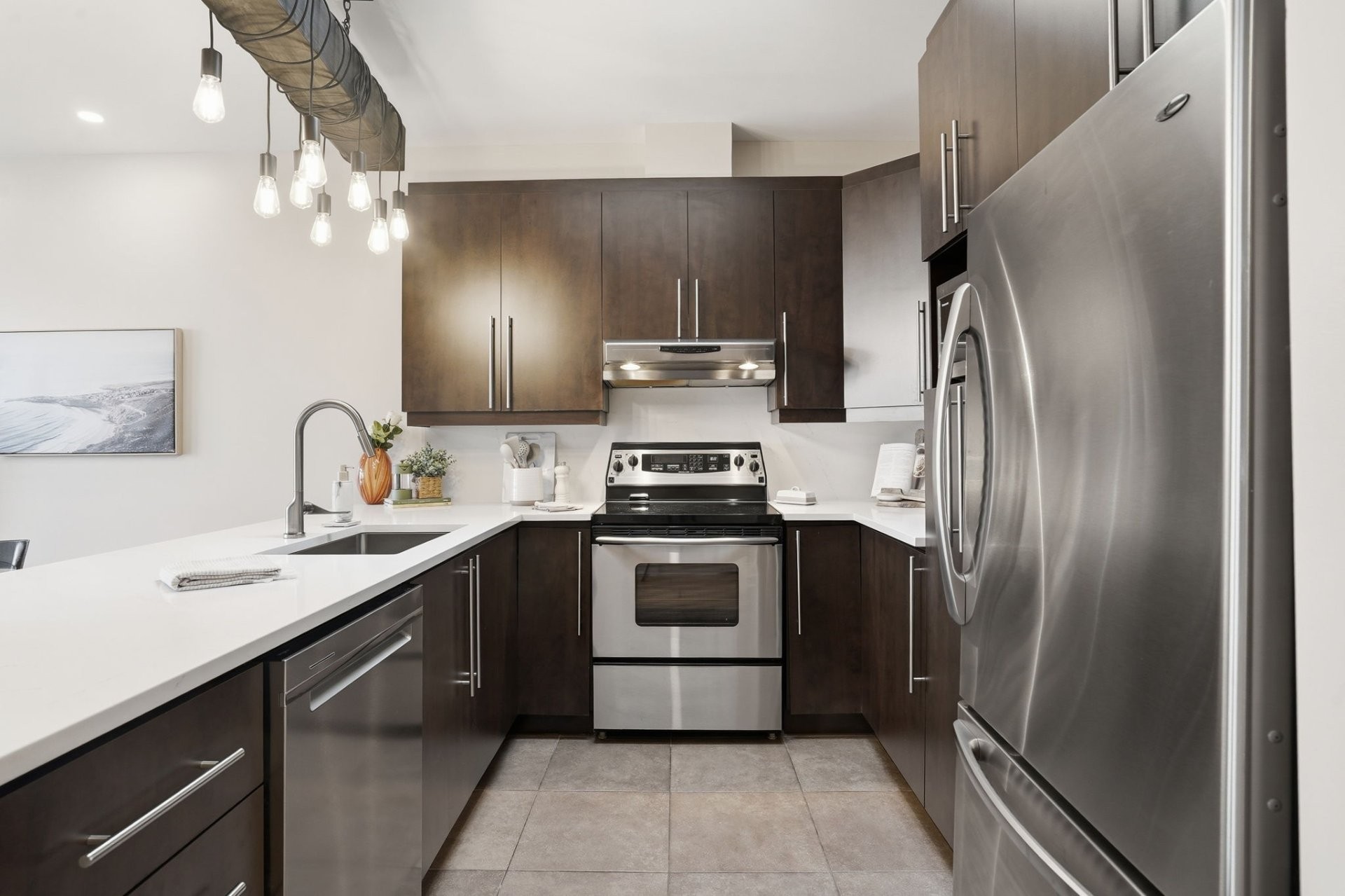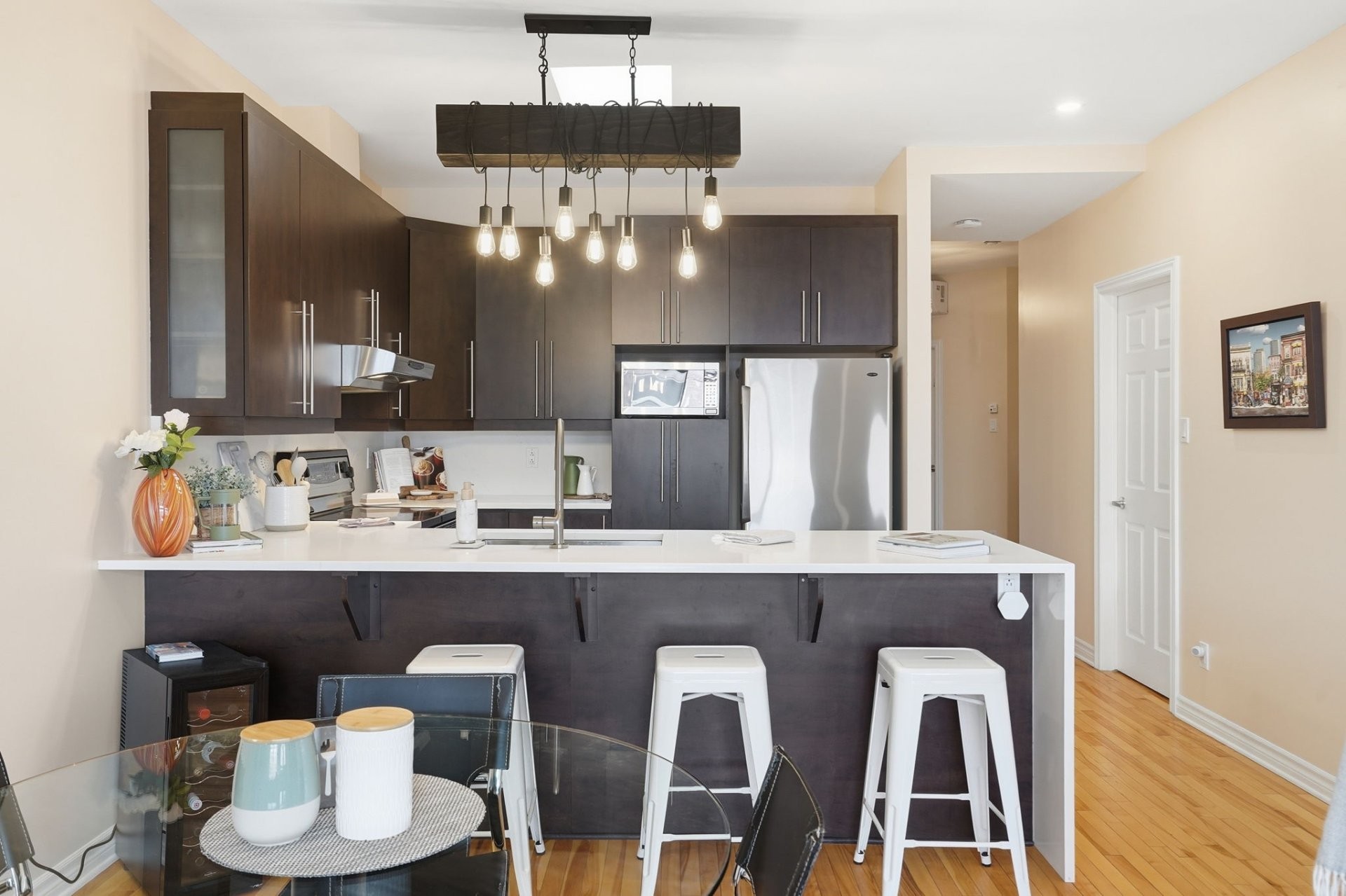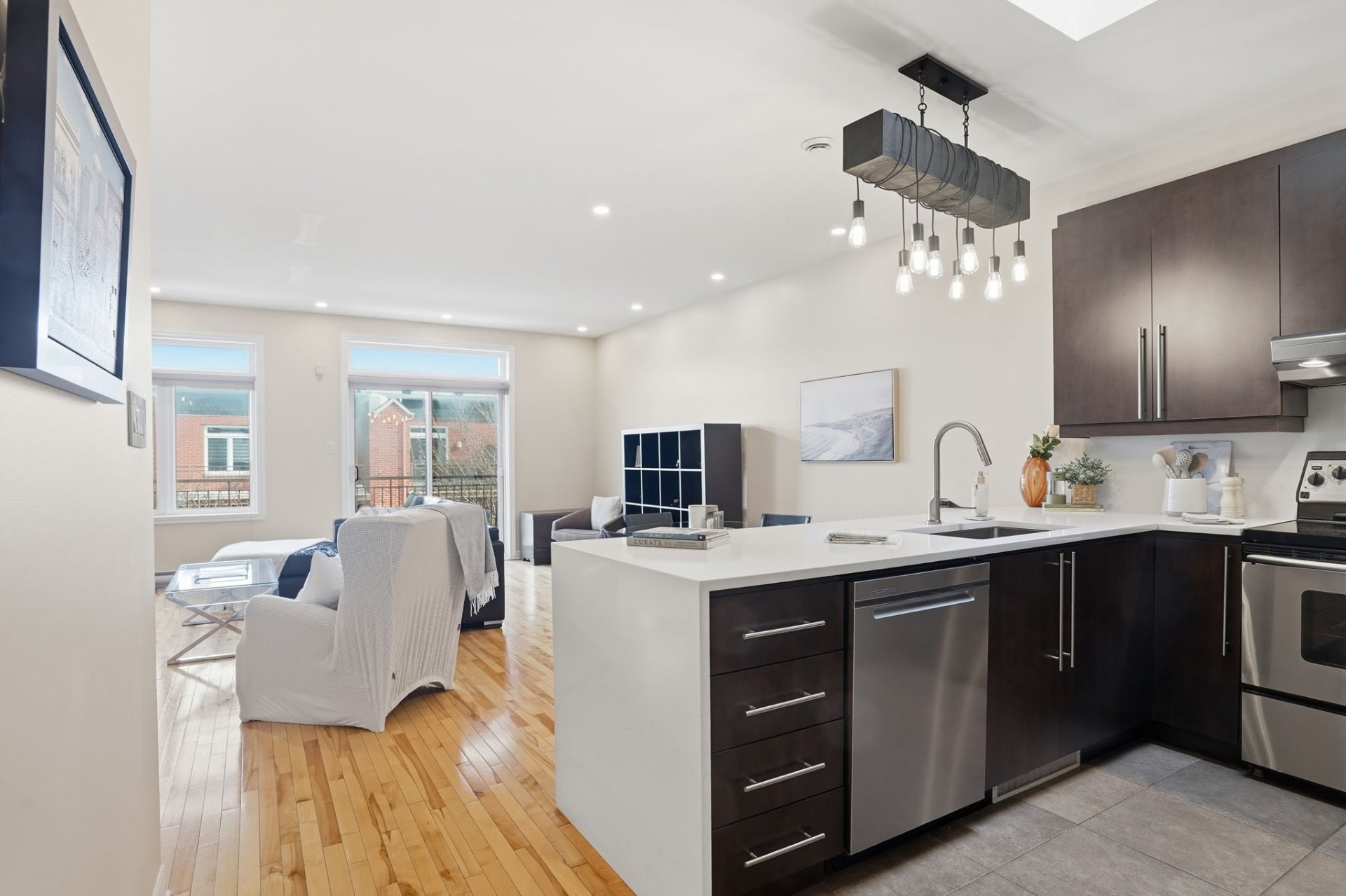 This top floor unit stands out right away with its 9 foot ceilings and two skylights that bring in incredible natural light. The living room features an open concept layout flowing seamlessly into a generous dining area. Quartz countertops are installed throughout the condo, in both the kitchen and the bathrooms, creating a clean and cohesive high end finish. The kitchen also offers quality cabinetry and a practical layout designed for everyday comfort.