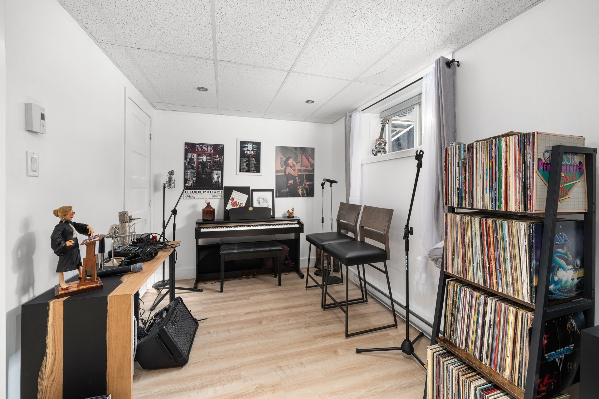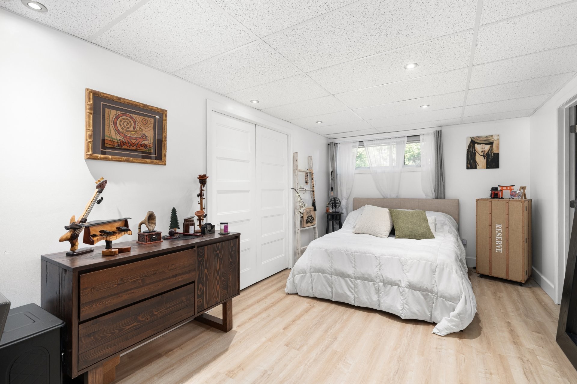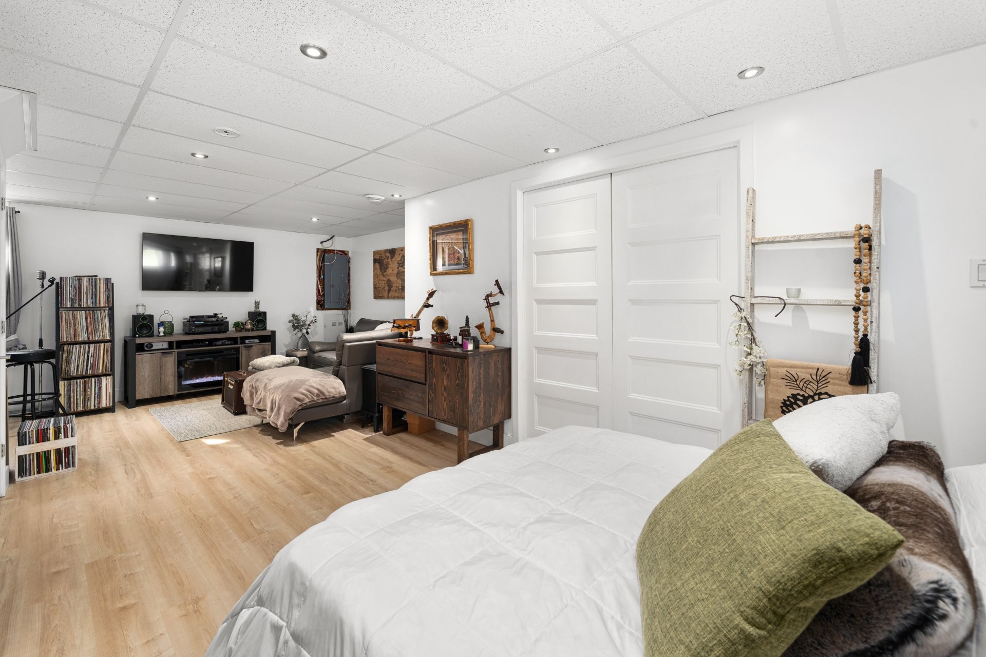 Fully finished. Family room offering a versatile living space. Renovated bathroom (2023) with updated plumbing and quality finishes. Practical storage space. Interior Renovations (2021--2024) Built-in electric fireplaces with custom cabinetry and ceramic feature walls. Updated kitchen and bathroom cabinets. Quartz countertops in kitchen and bathrooms. Hardwood floors (main and upper levels). Ceramic flooring in kitchen, entryway, and bathrooms. Complete renovation of bathrooms (basement 2023, upper level 2024).