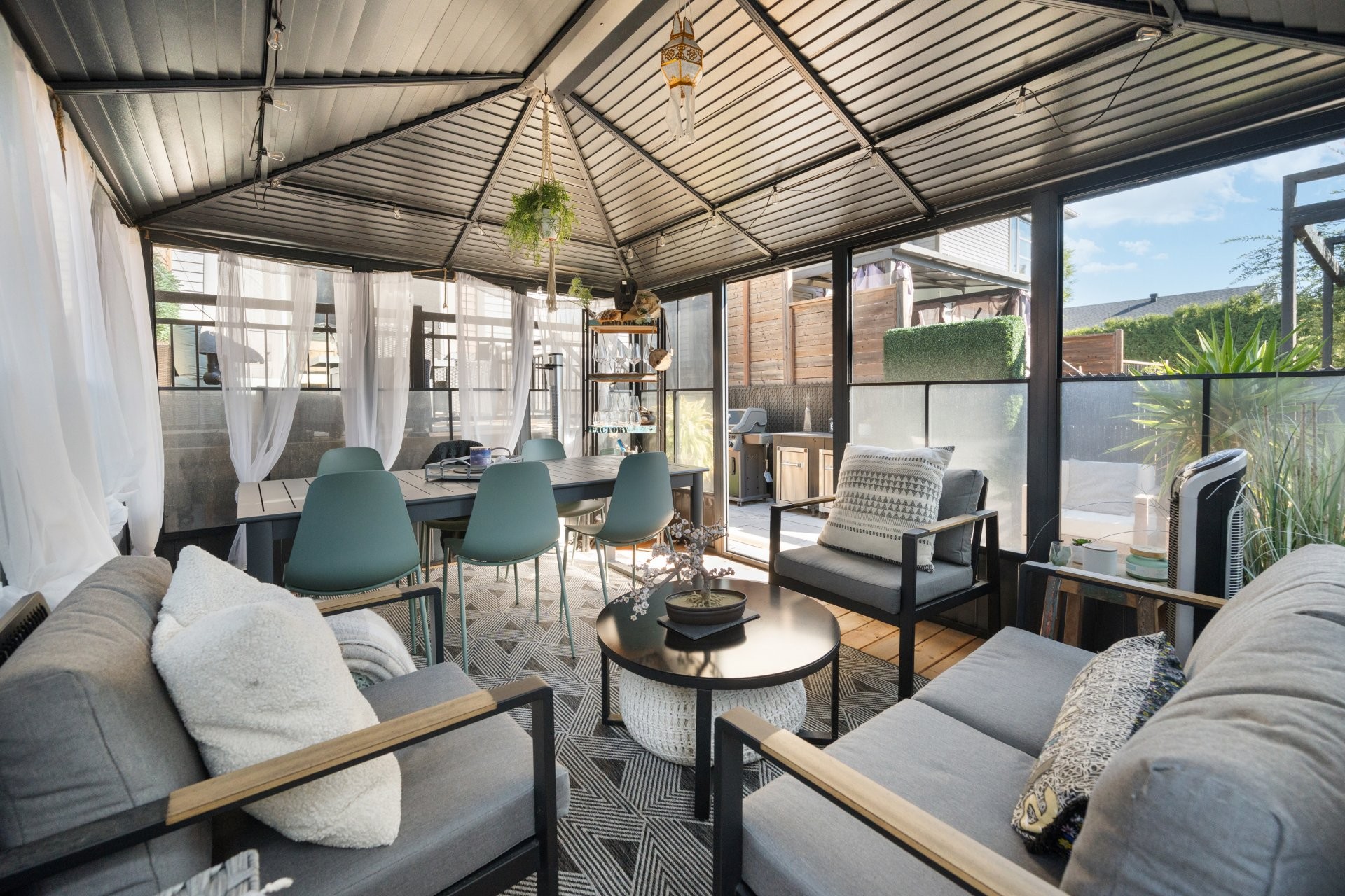 Beautifully renovated townhouse with great attention to detail. Modern kitchen with quartz countertops and heated floors. Inviting living room featuring an electric fireplace and ceramic accent wall, with hardwood floors on the main and second levels. Two spacious bedrooms upstairs and a fully renovated main bathroom with heated floors. Finished basement with a renovated bathroom and family room, designed to easily add two closed bedrooms while maintaining living space. Outside: paving stone, gazebo platform, synthetic grass, and gazebo included. Numerous quality upgrades and improvements over the years. Move-in ready!