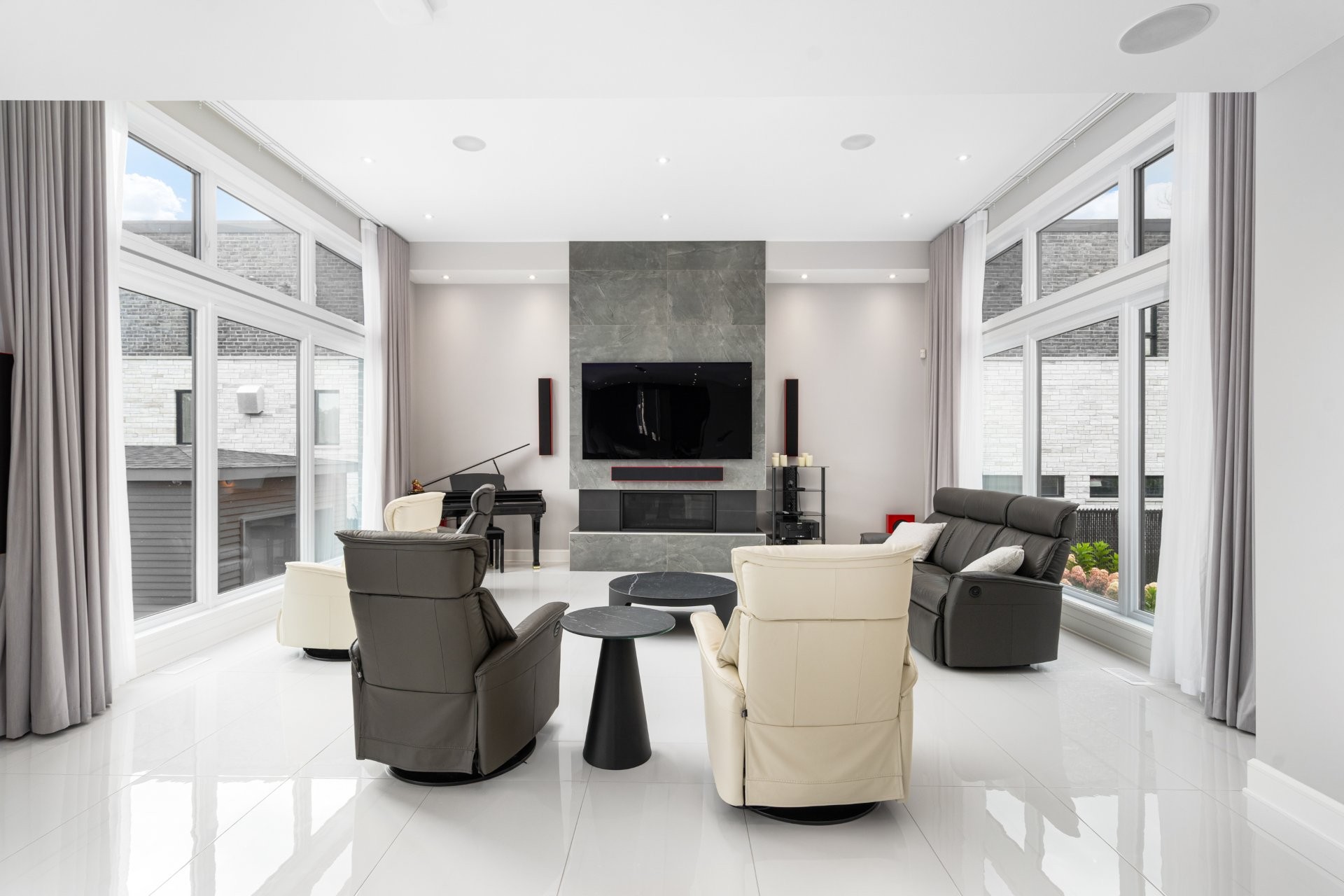 Inside, the main floor boasts soaring 12-foot ceilings, porcelain floors, and floor-to-ceiling windows that flood the space with natural light. The living room features a sleek gas fireplace and wiring for an Atmos 9.1.2 surround sound system. The gourmet kitchen is highlighted by a 10 x 4 ft. quartz island, quartz backsplash, and Frigidaire Professional appliances including a stove, cooktop, microwave, fridge, wine fridge, and dishwasher. A large walk-in pantry with built-in coffee station adds both function and style. Oversized patio doors open to a covered composite deck with motorized screens, ceiling fan, outdoor speakers, and a gas BBQ hookup--perfect for year-round entertaining.