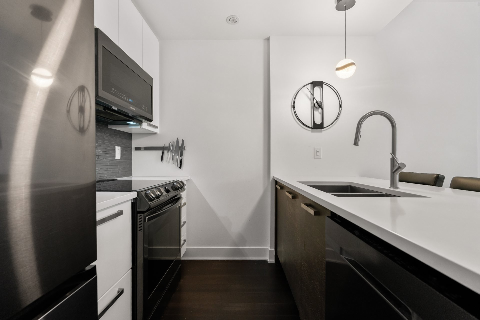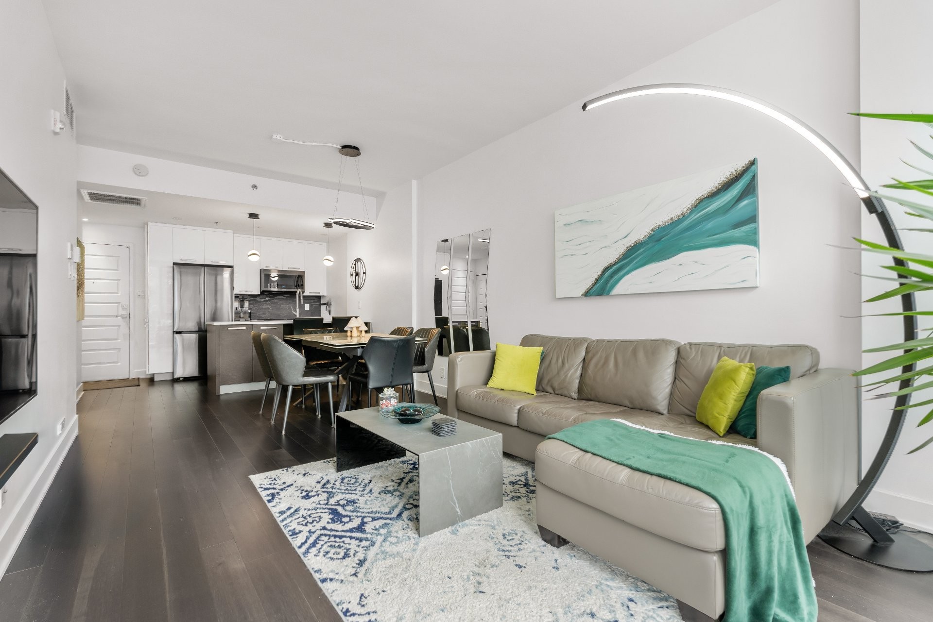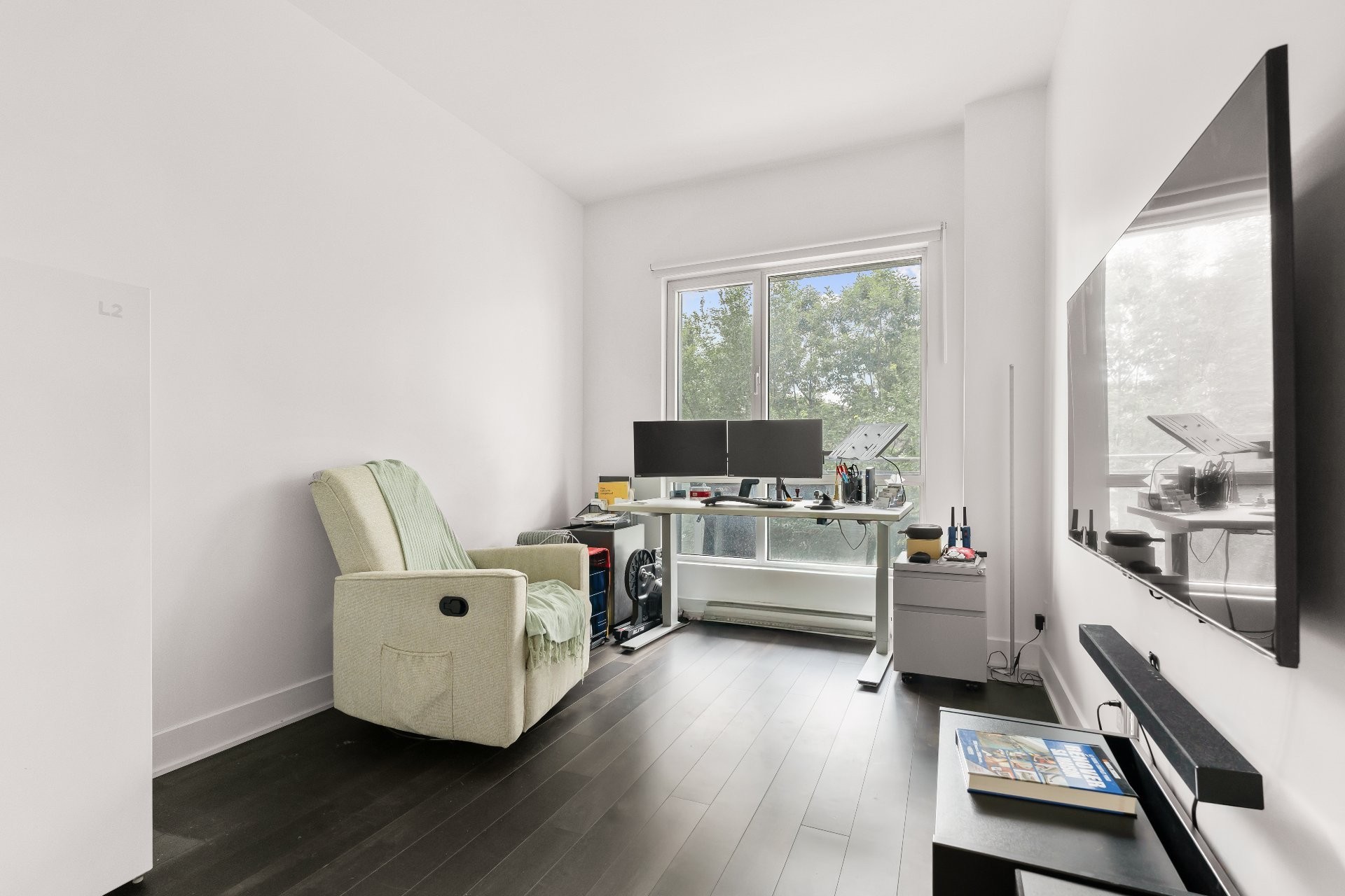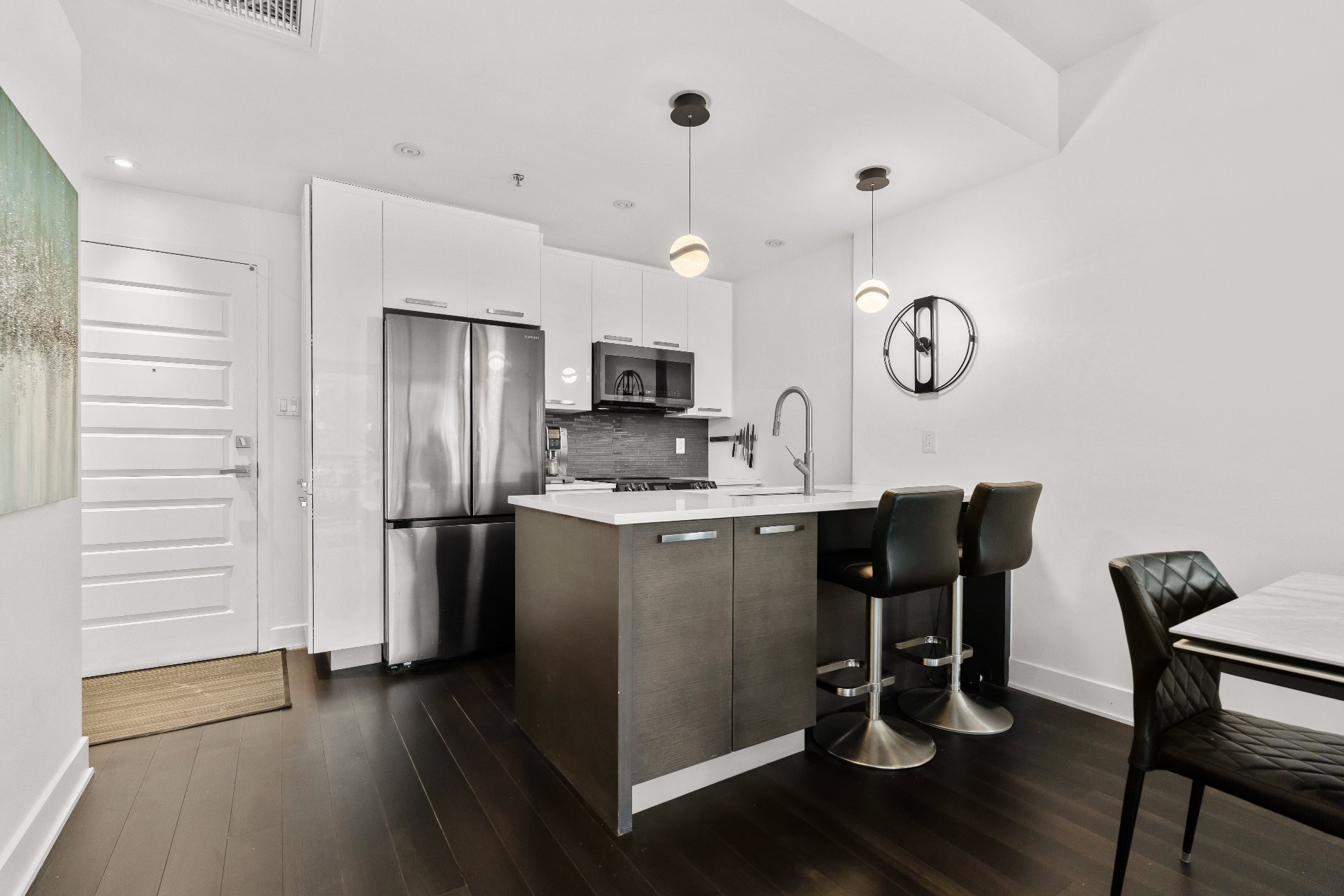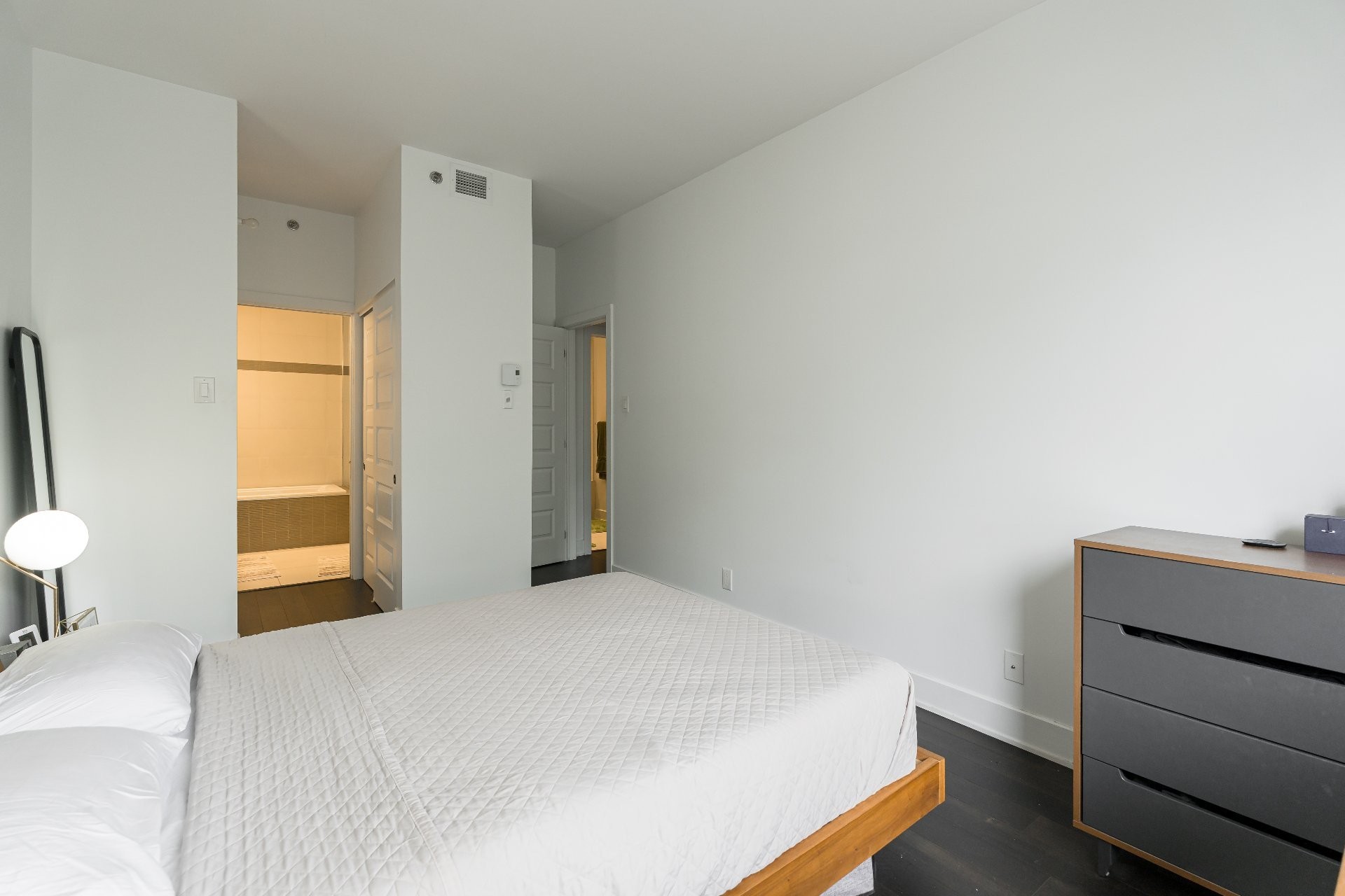 This bright condo (865 sq. ft.) overlooks the Rivière-des-Prairies, thanks to its floor-to-ceiling windows and southwest orientation opening onto a balcony accessible from the living room and master bedroom. It features 2 bedrooms, including a master suite with bathtub and shower, 2 full bathrooms, and a modern luxury kitchen with quartz counter tops stainless steel appliances. High ceilings (up to 9.5 ft), hardwood floors, central heating, and central air conditioning ensure comfort and elegance. Included: indoor parking and storage.