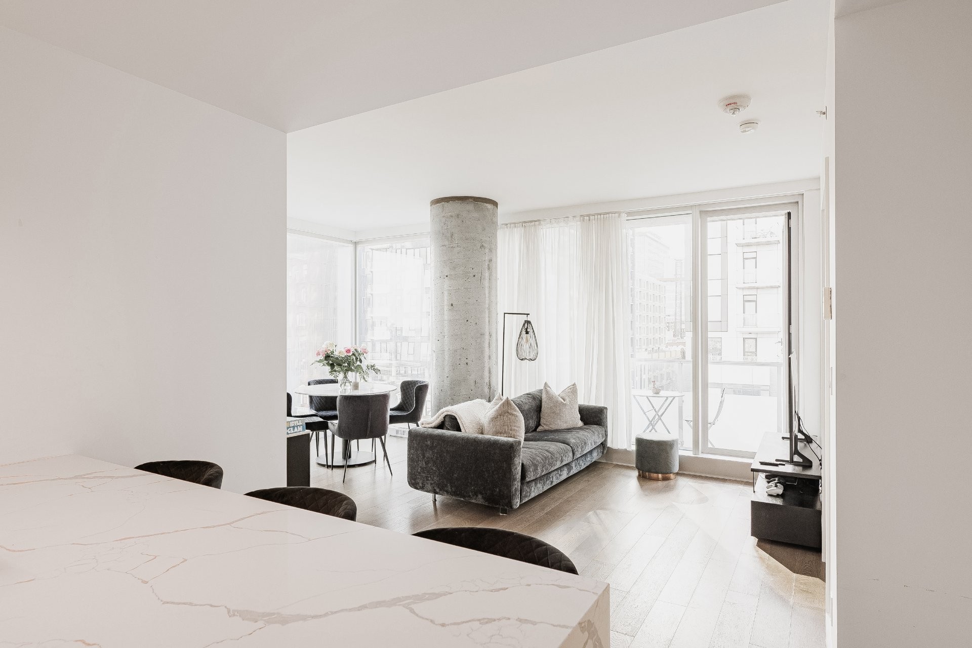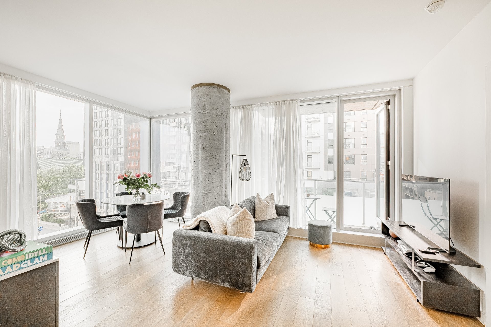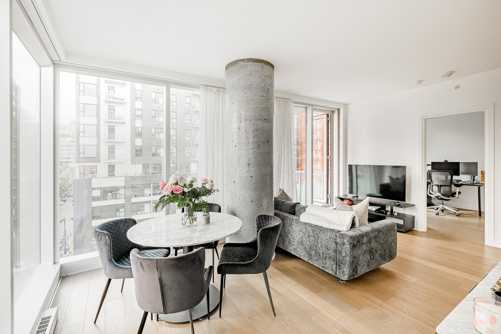 Unité de coin partiellement meublé moderne au YUL avec 2 chambres, 1 salle de bain et espace lumineux à aire ouverte. Fenêtres pleine hauteu...