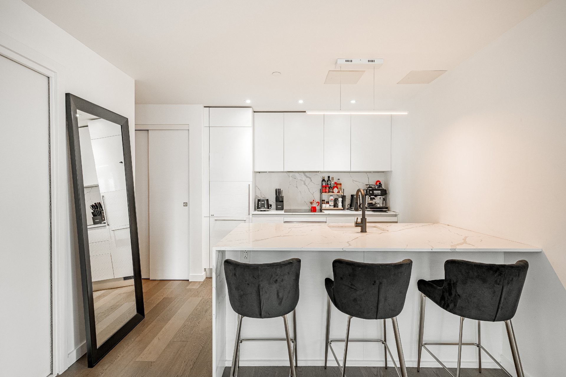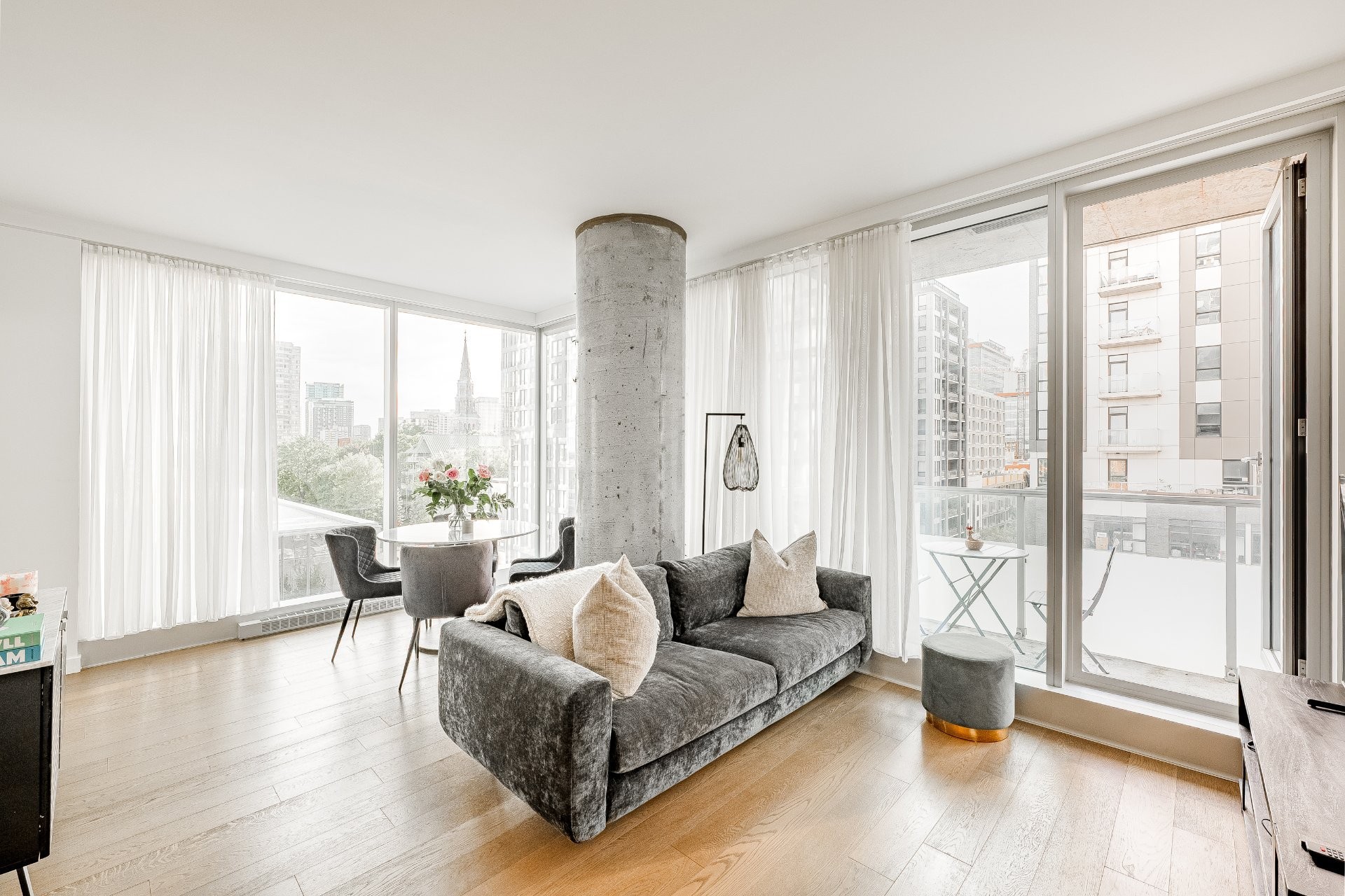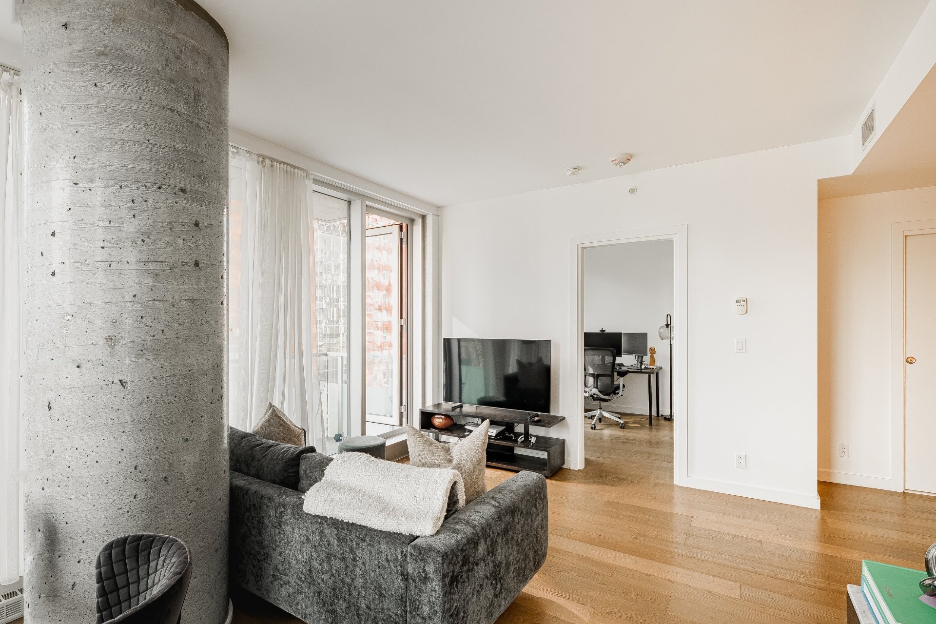 Unité de coin partiellement meublé moderne au YUL avec 2 chambres, 1 salle de bain et espace lumineux à aire ouverte. Fenêtres pleine hauteu...